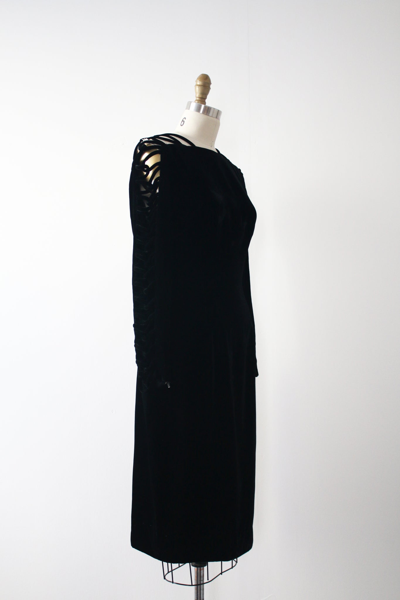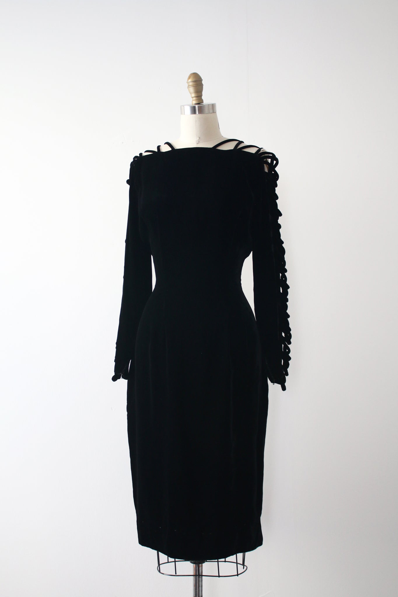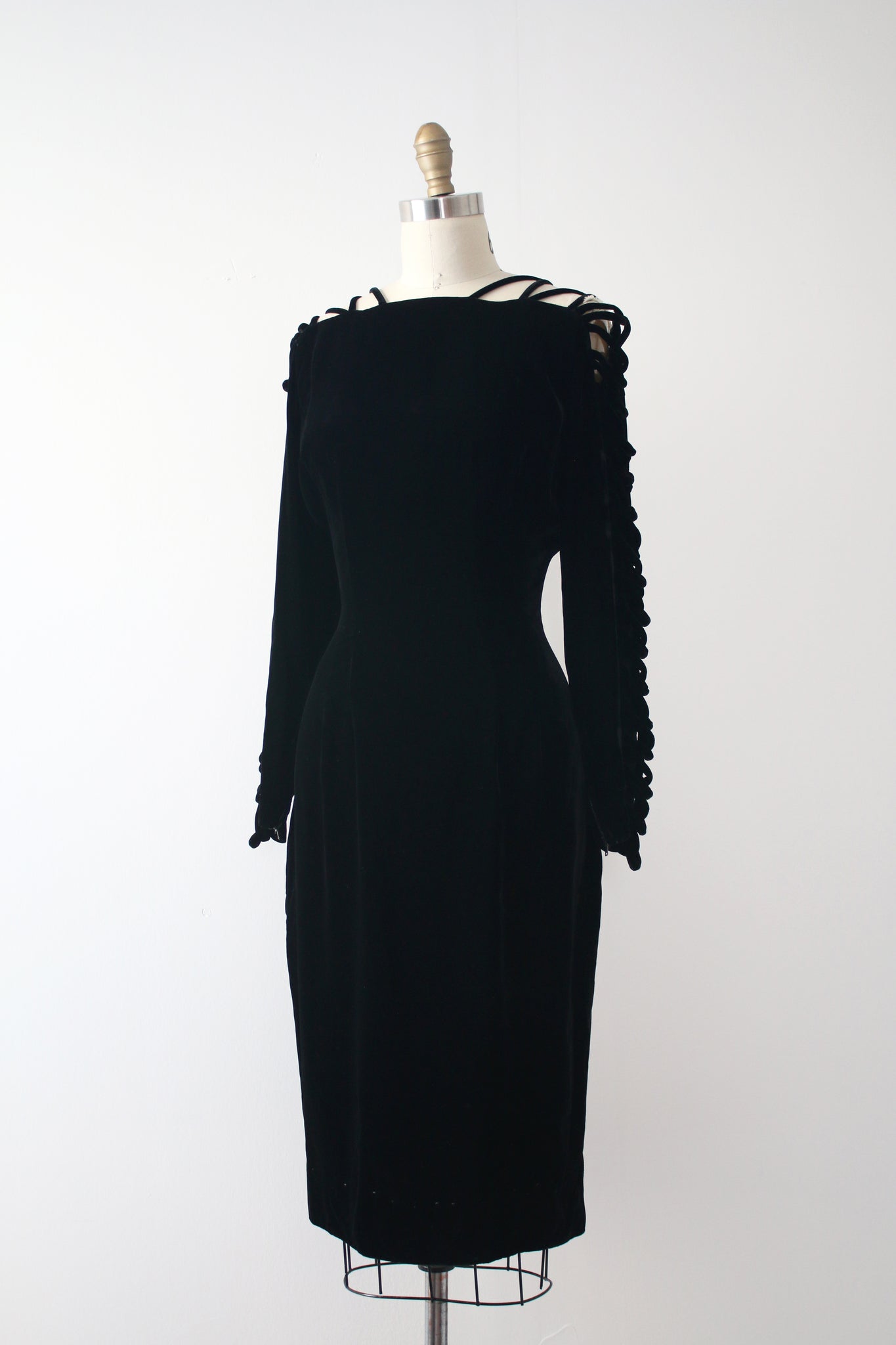 Truly unusual RARE black velvet dress form the early 1960s! This dress features these unique cage like sleeves and shoulders details that I don't even know how to describe! I've modelled it in the photos as well to really show off how it looks on!!! metal zipper up the back. There's no label but I can totally see this being something that Frederick's of Hollywood would have made!