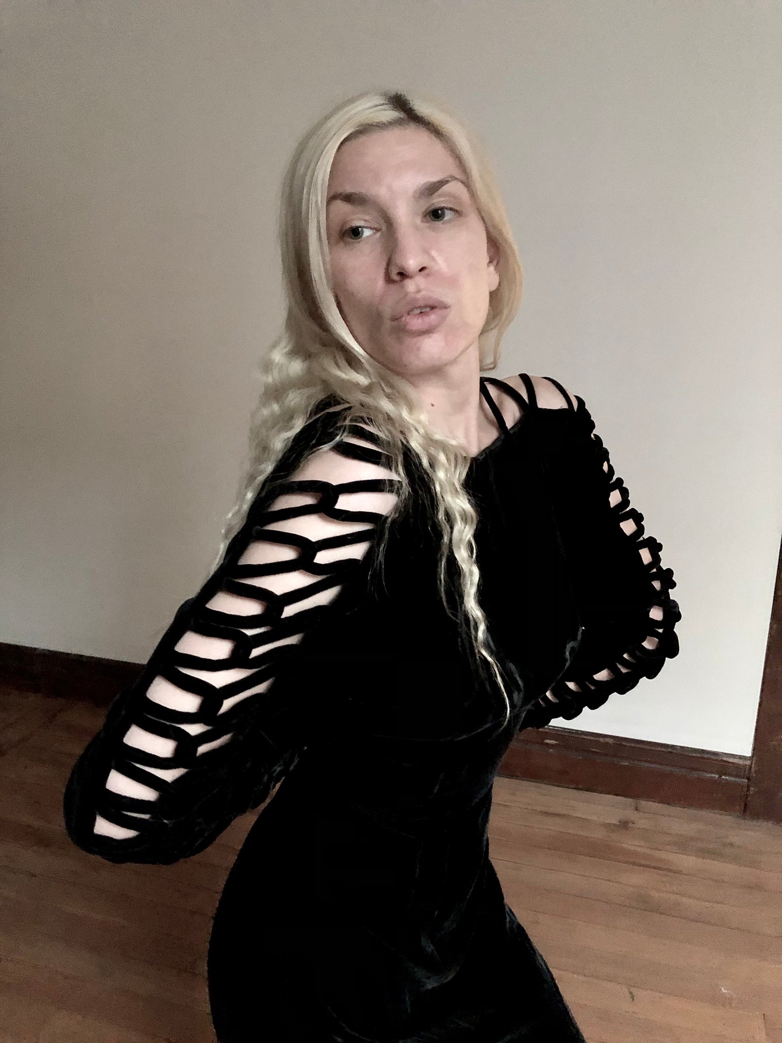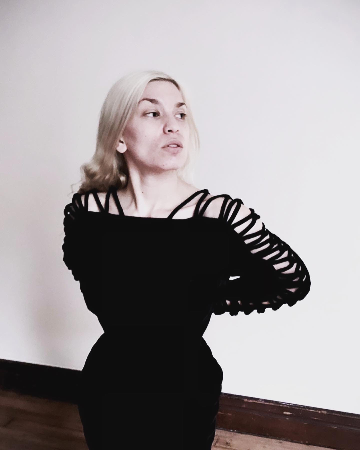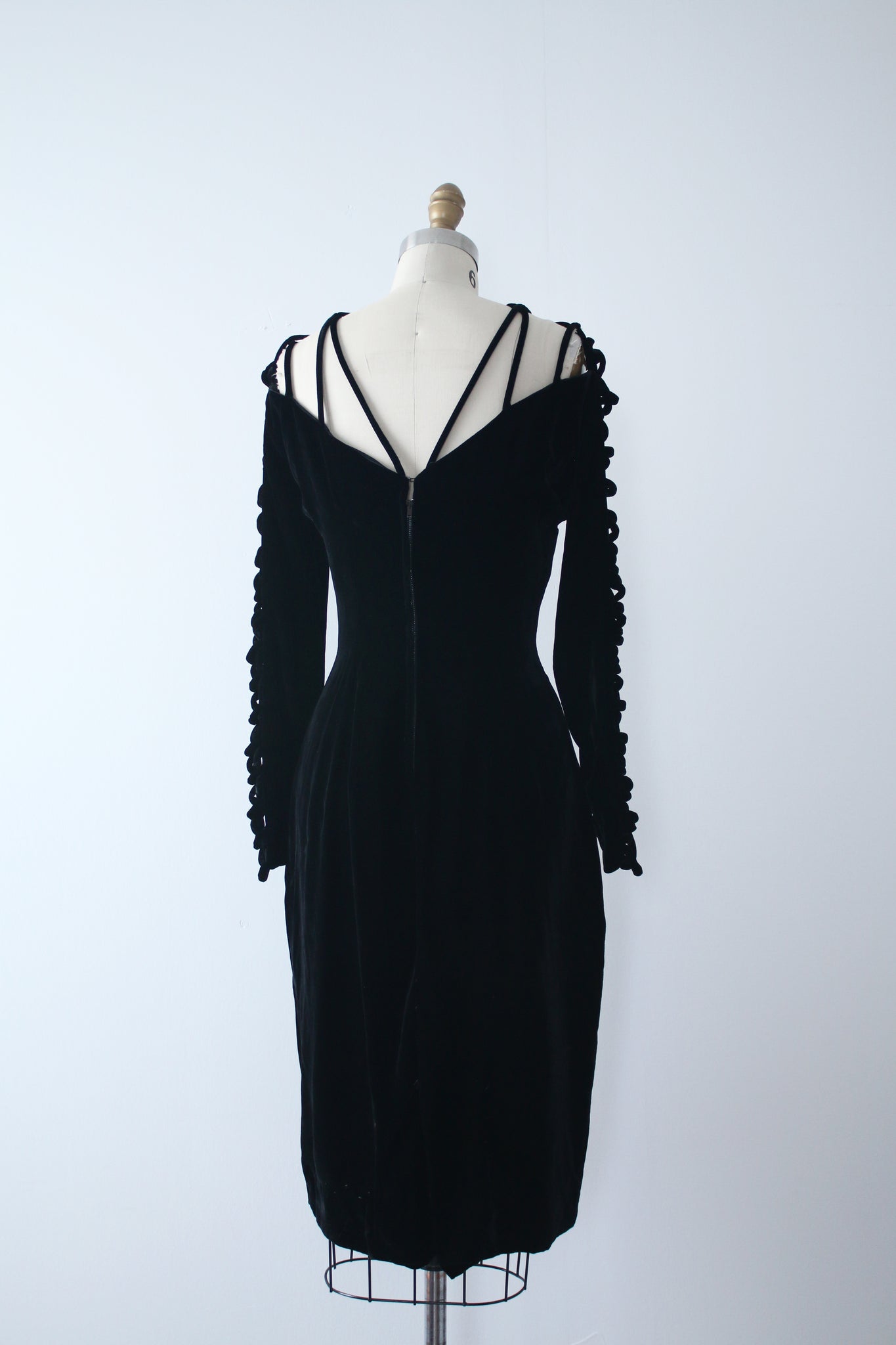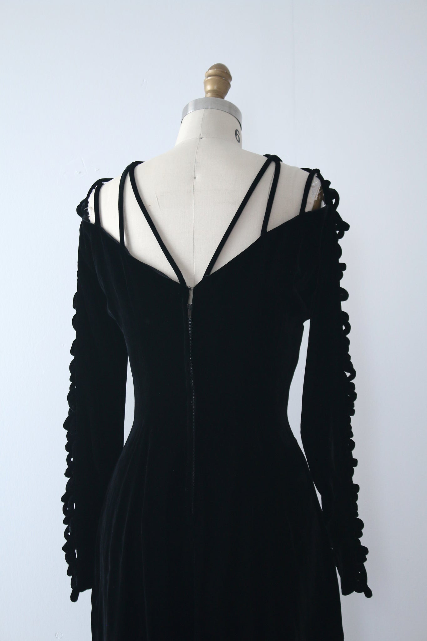 Truly unusual RARE black velvet dress form the early 1960s! This dress features these unique cage like sleeves and shoulders details that I don't even know how to describe! I've modelled it in the photos as well to really show off how it looks on!!! metal zipper up the back. There's no label but I can totally see this being something that Frederick's of Hollywood would have made!