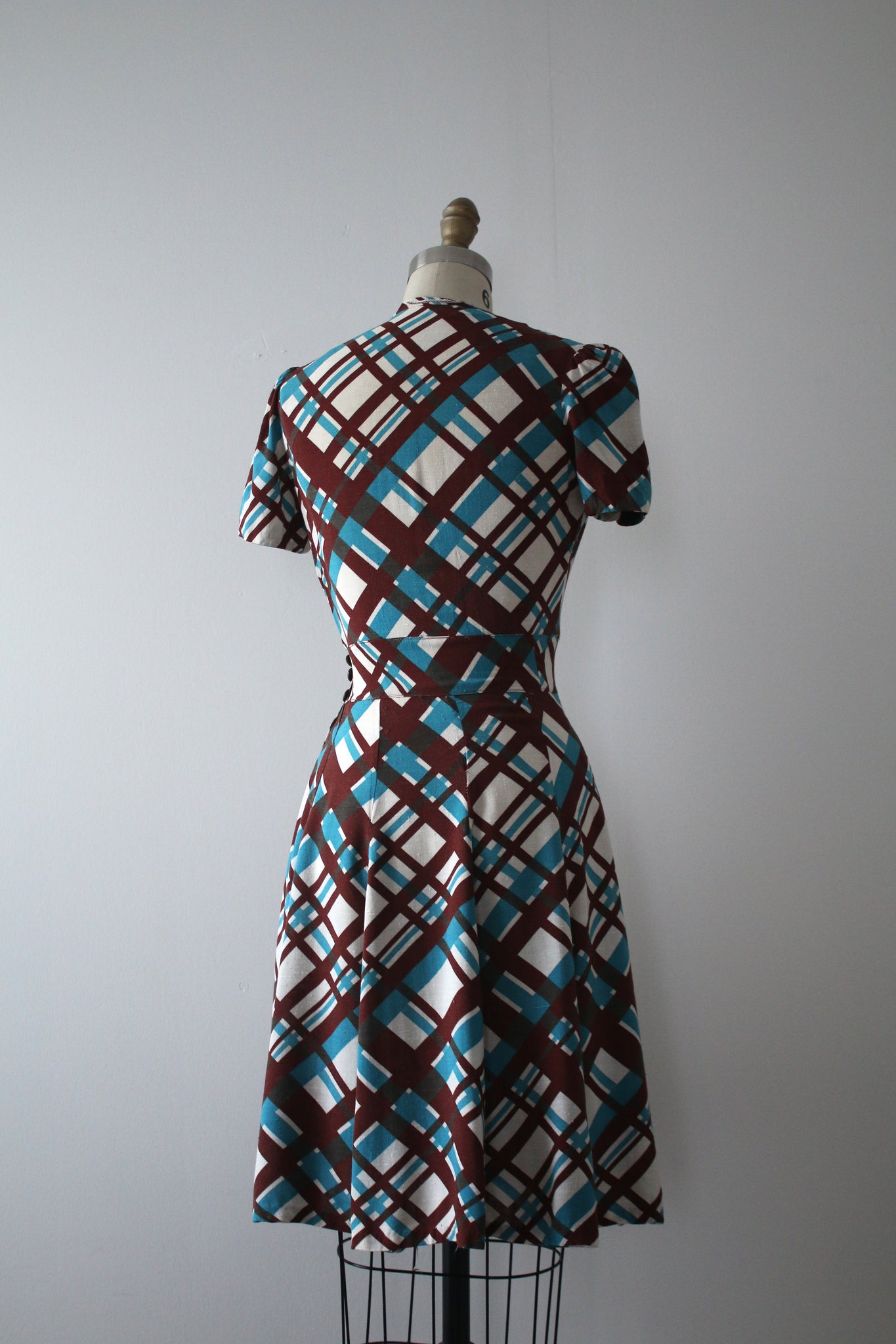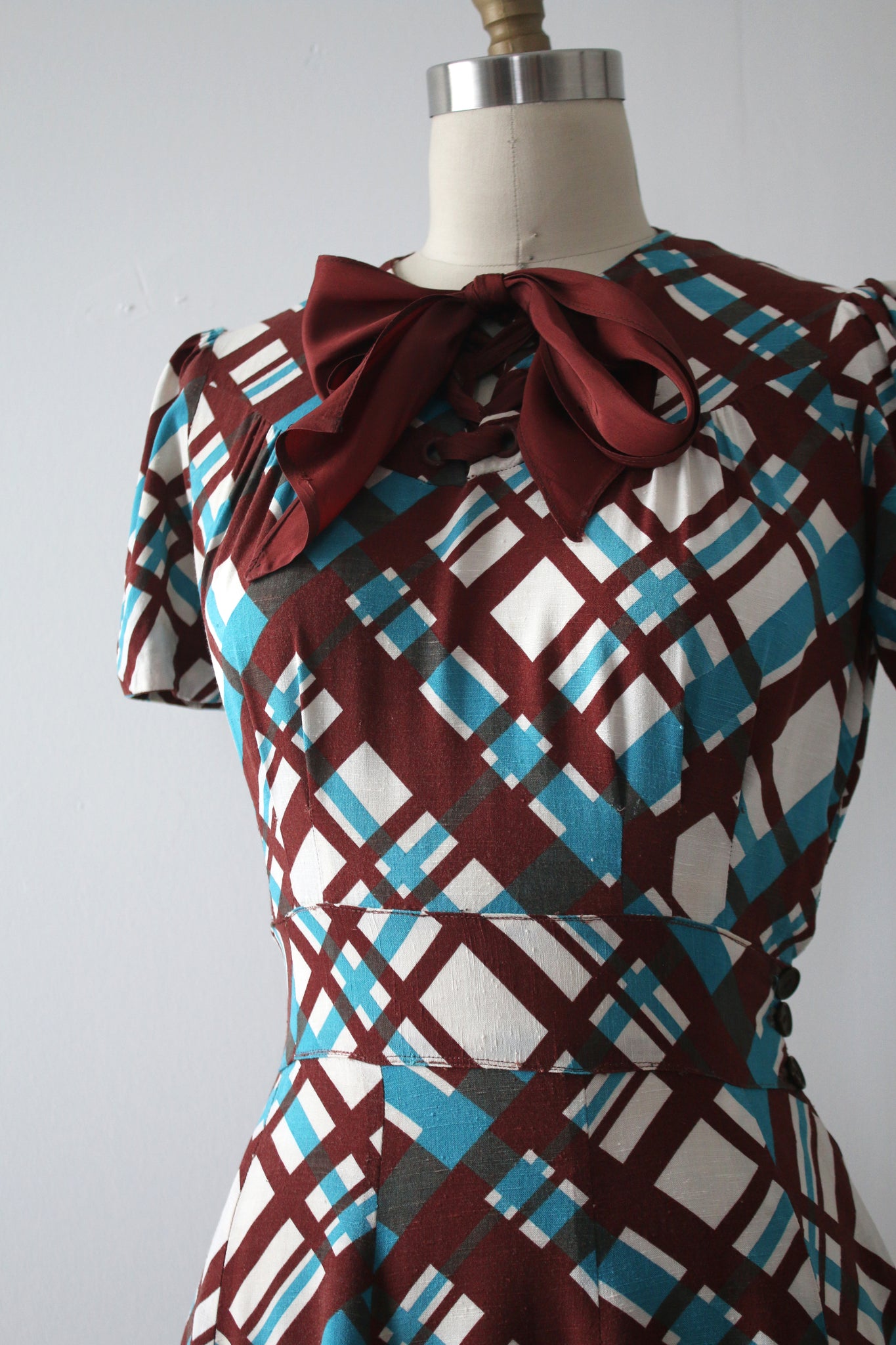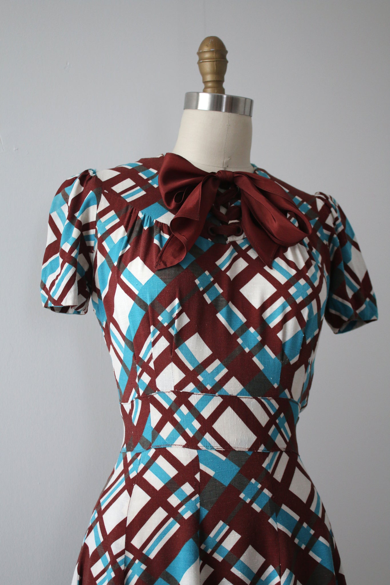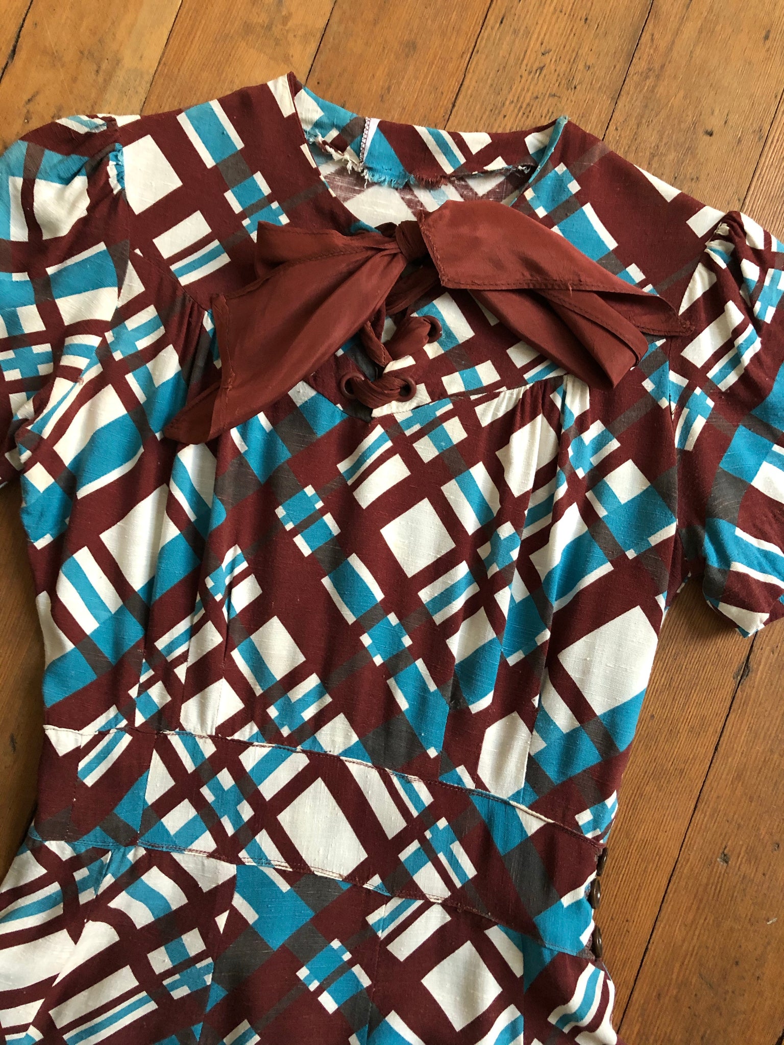 Lovely linen like dress from the late 1930s. I believe it's a rayon mimicking linen style fabric. Snaps and buttons on the side. Eyelets on the neckline.