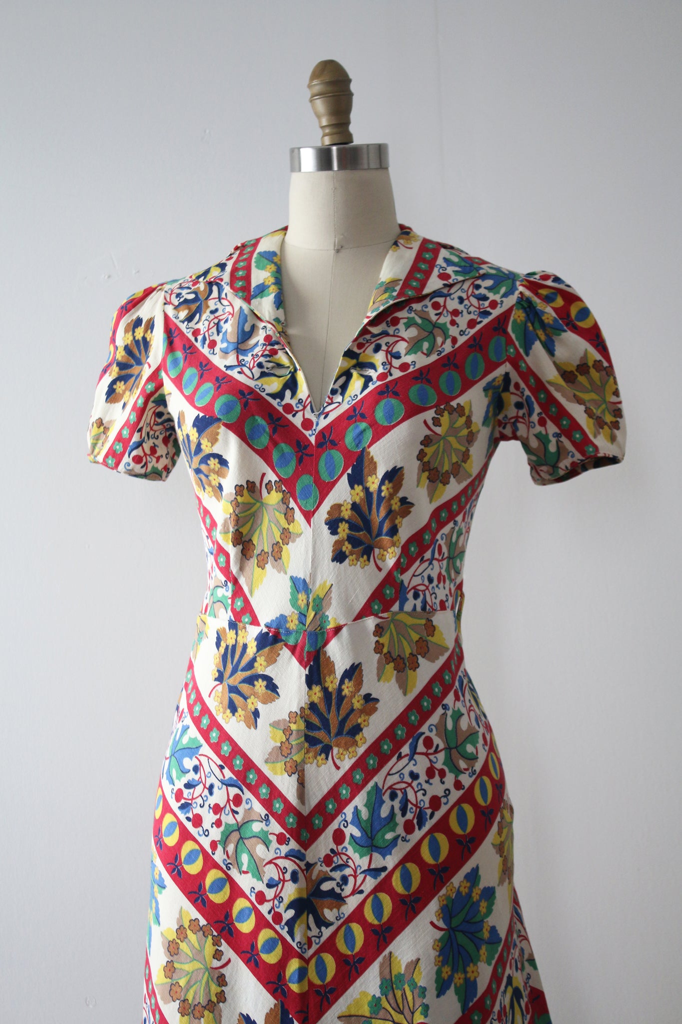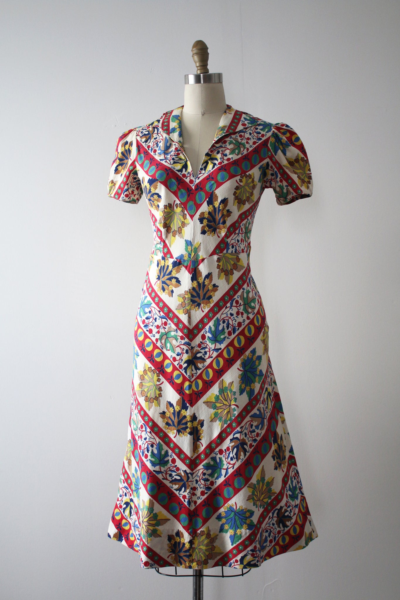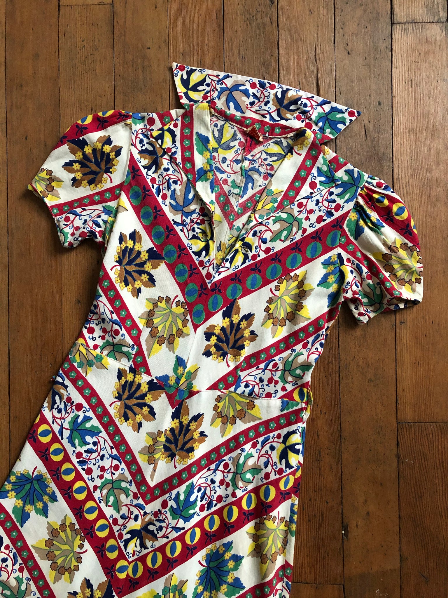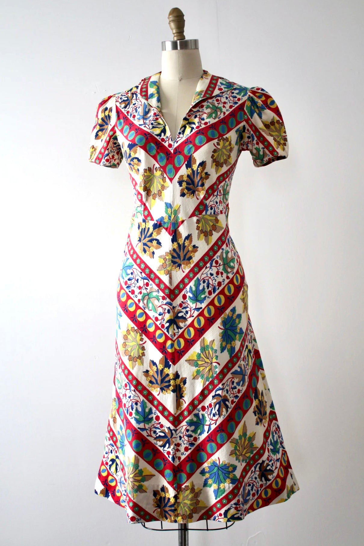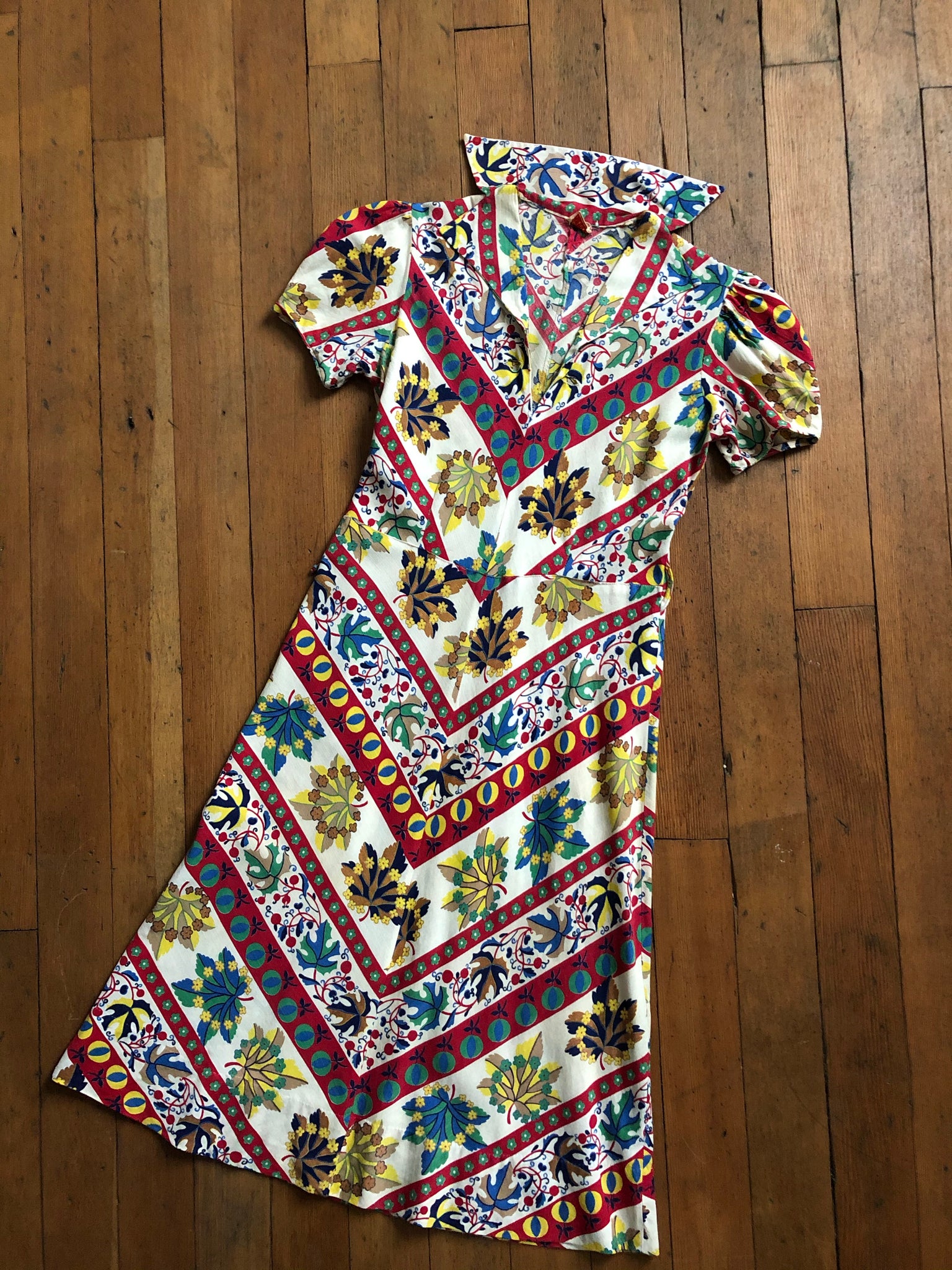 Absolutely wonderful novelty print leaf dress from the 1930s. The print is so amazing and bold. I just love it so much!!! It probably had some ribbon for the front part at some point which would look so cute! No closure.