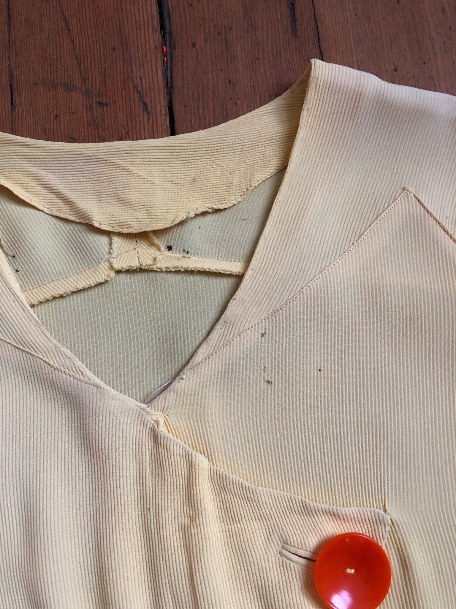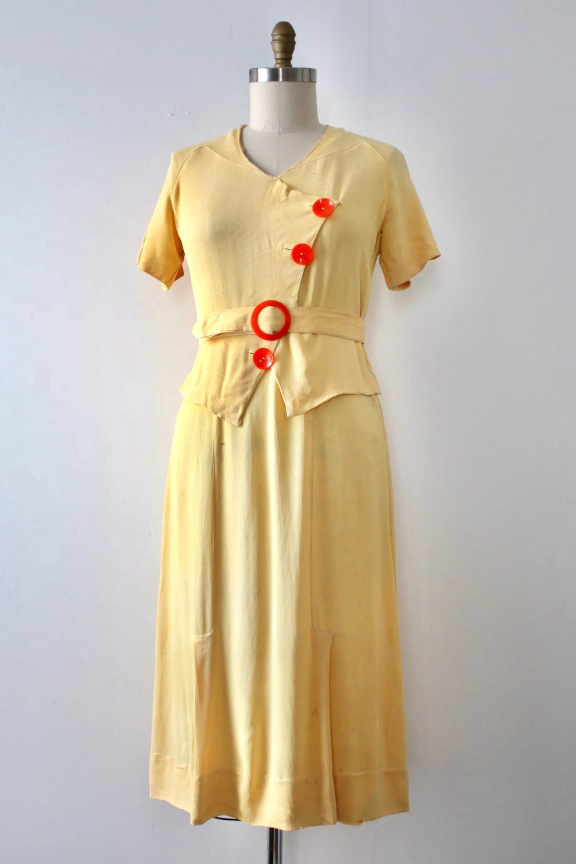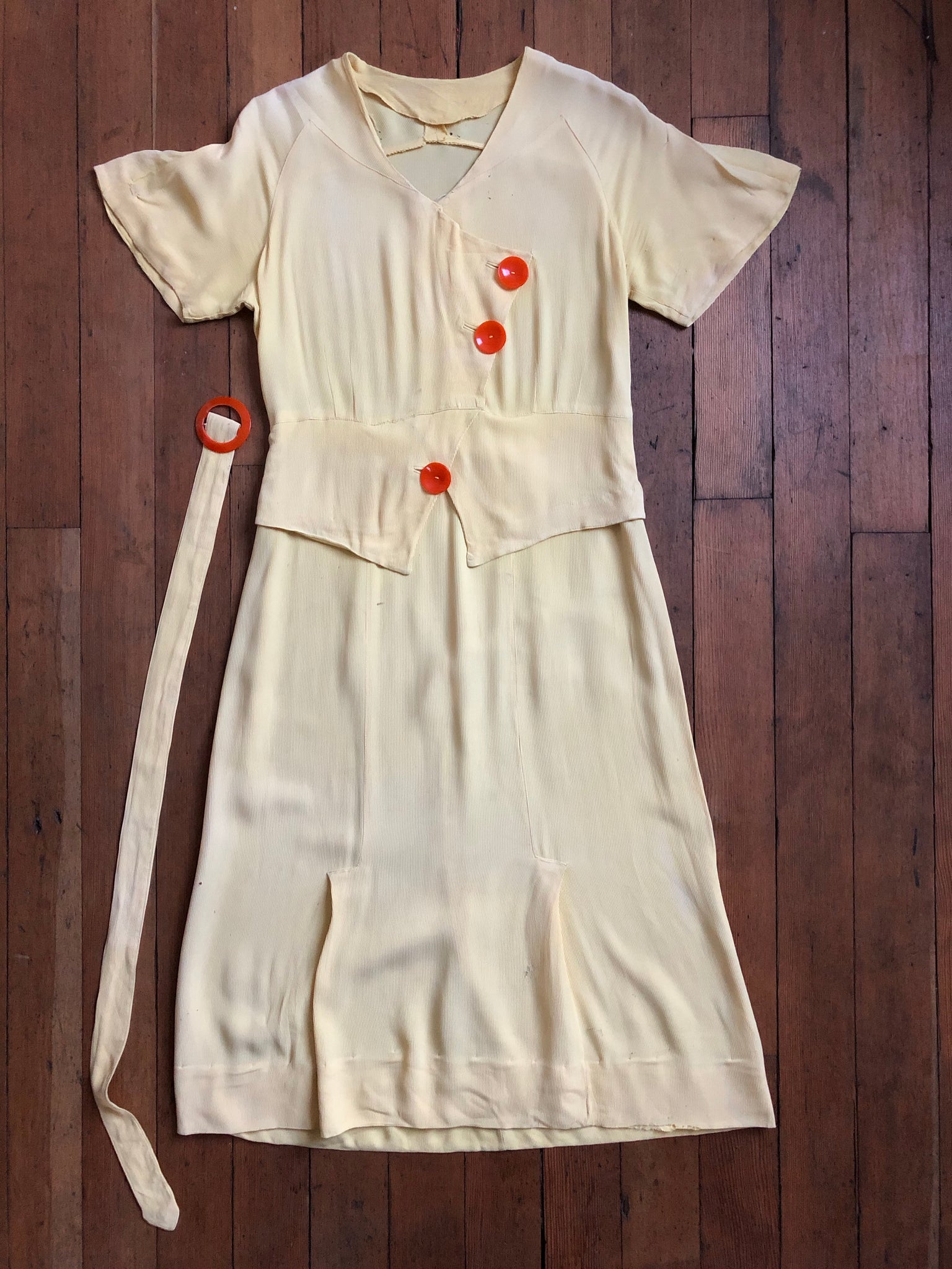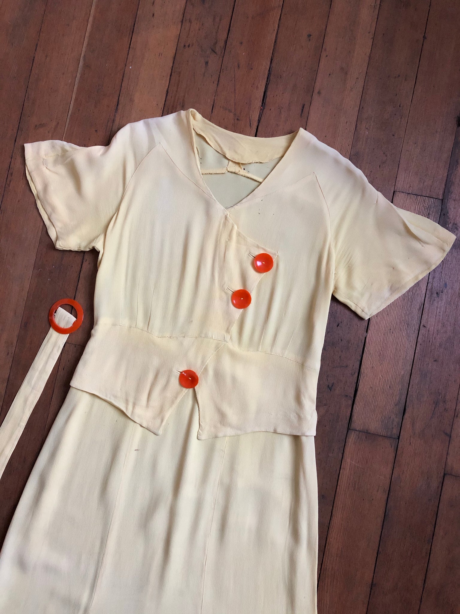 Really gorgeous yellow rayon dress from the 1930s. This is a rare NRA (National Recovery Act) piece but is being sold as found. snaps on side.