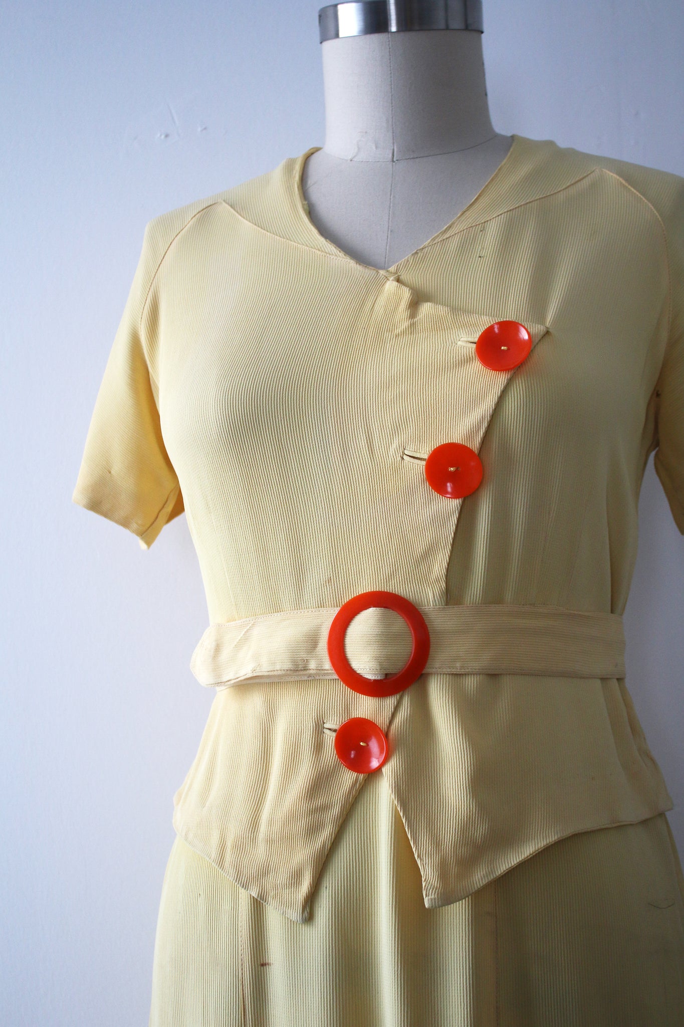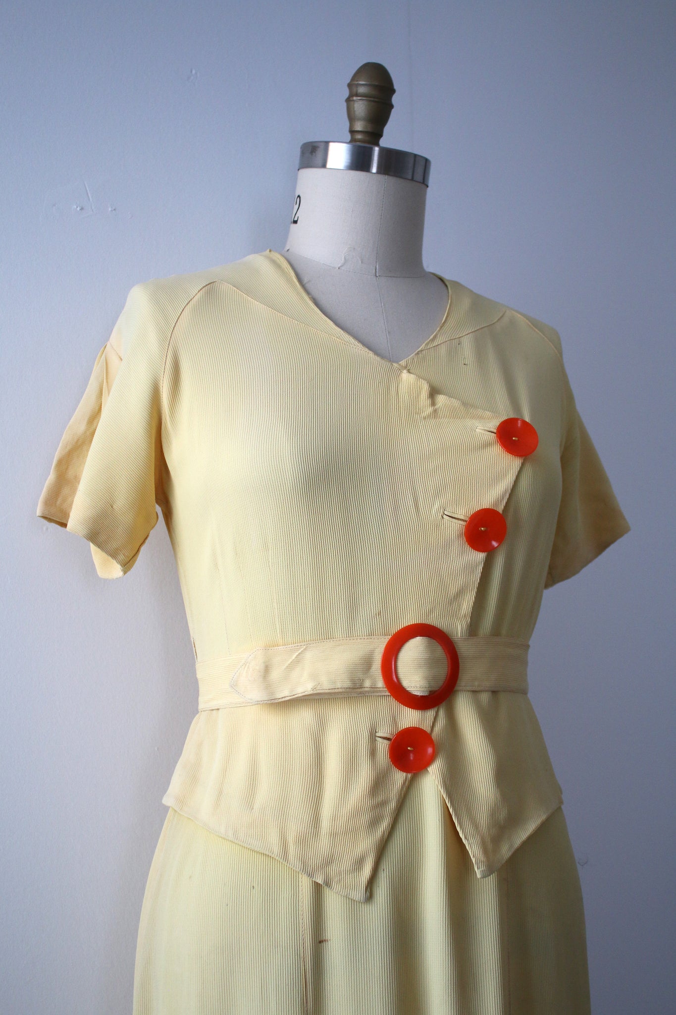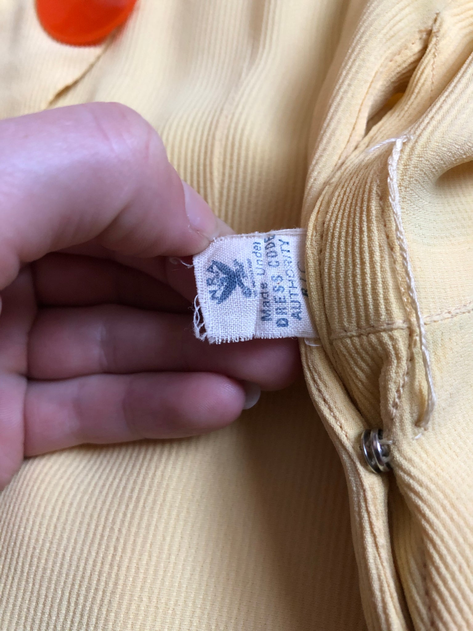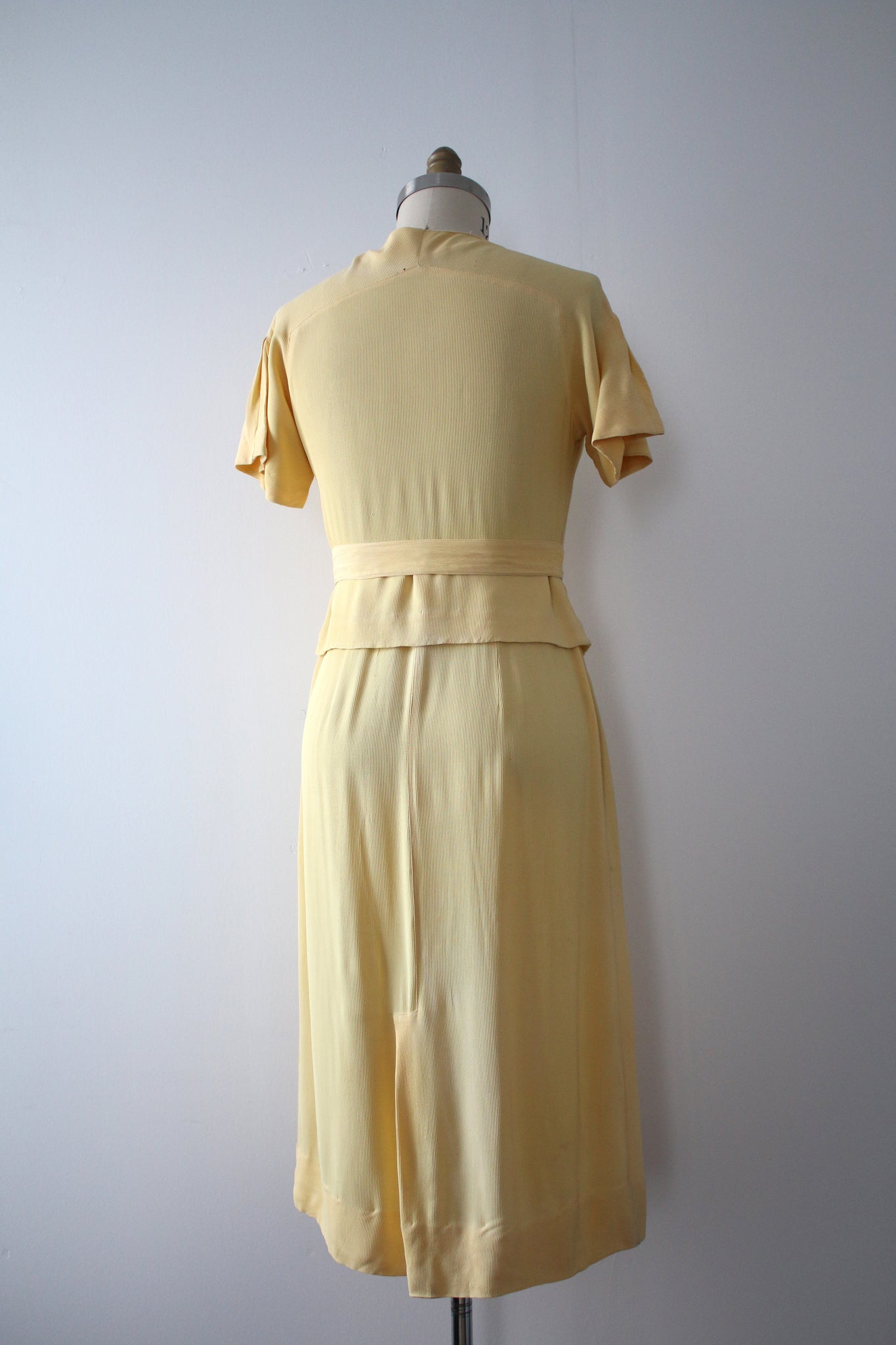 Really gorgeous yellow rayon dress from the 1930s. This is a rare NRA (National Recovery Act) piece but is being sold as found. snaps on side.