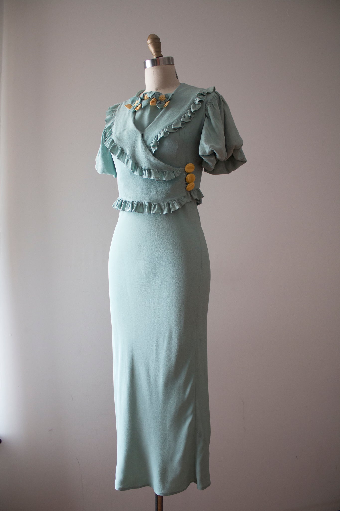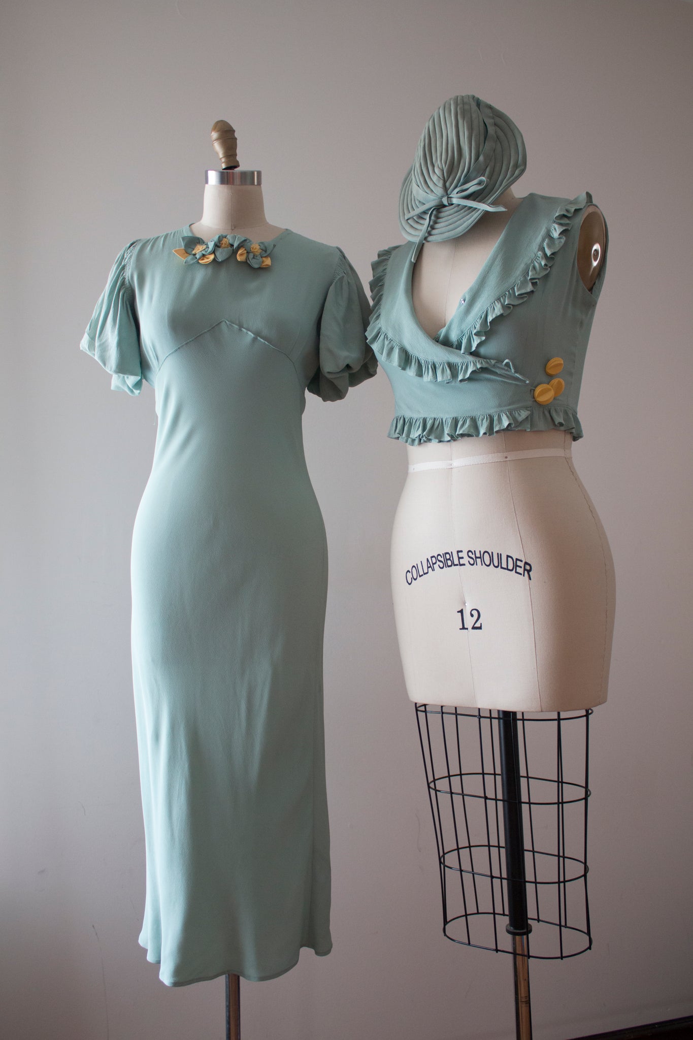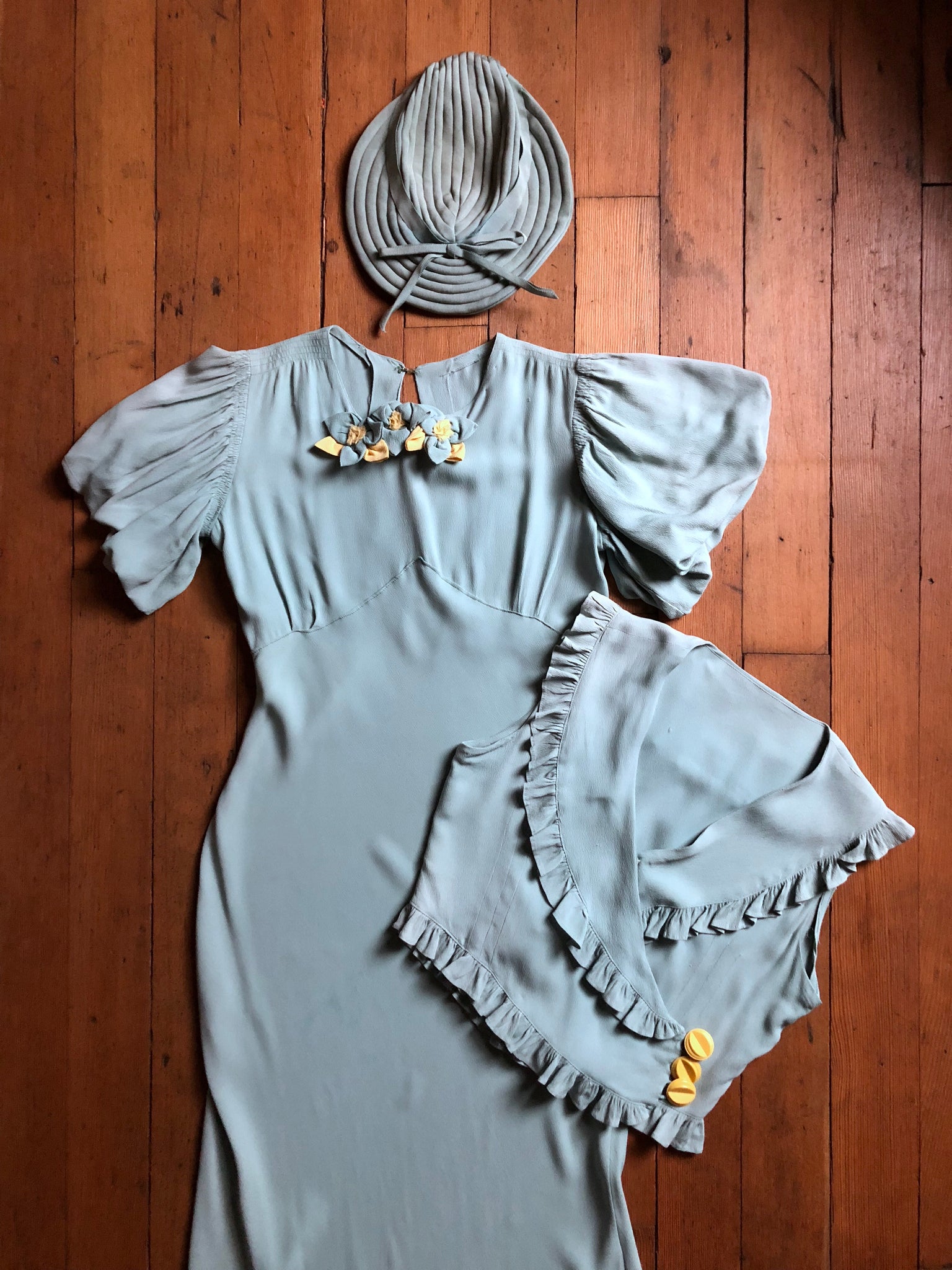 Actually one of the most incredible 1930s sets I've ever seen. This dress is such a good representation of 1930s fashions. Lets start with that amazing bias cut dress with 3D floral detail at the collar with a pop of yellow. Then there's the matching little vest with big yellow buttons on the side. And on top of it - IT COMES WITH A MATCHING HAT! I can't even!