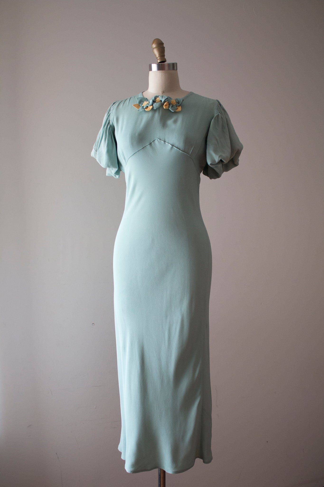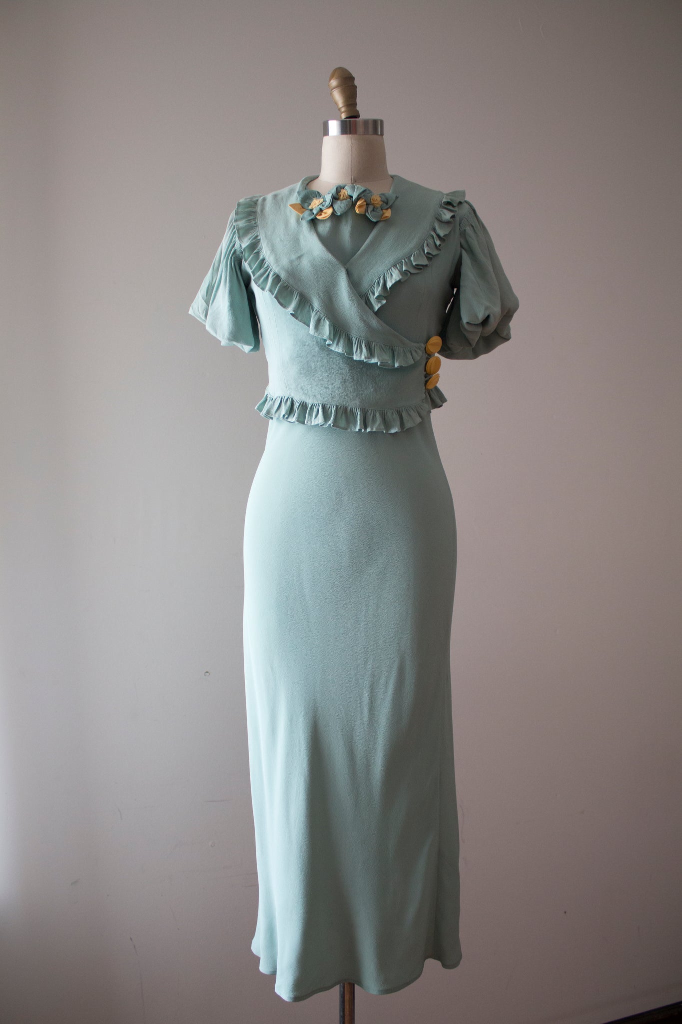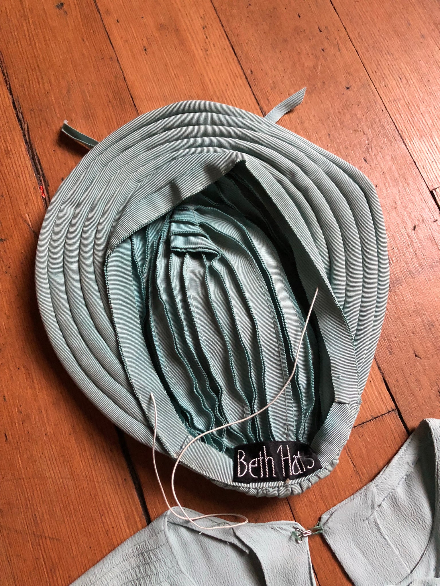 Actually one of the most incredible 1930s sets I've ever seen. This dress is such a good representation of 1930s fashions. Lets start with that amazing bias cut dress with 3D floral detail at the collar with a pop of yellow. Then there's the matching little vest with big yellow buttons on the side. And on top of it - IT COMES WITH A MATCHING HAT! I can't even!