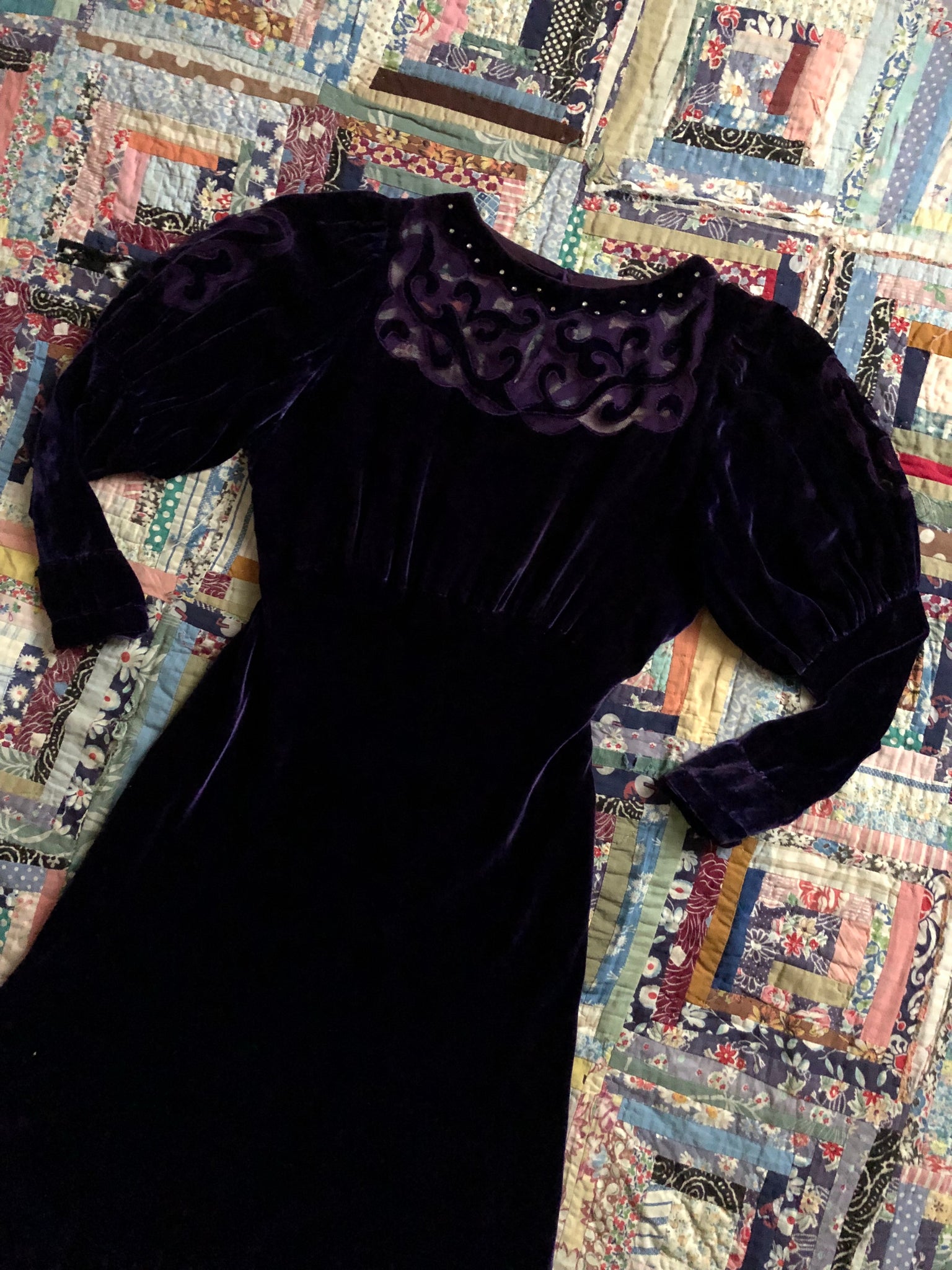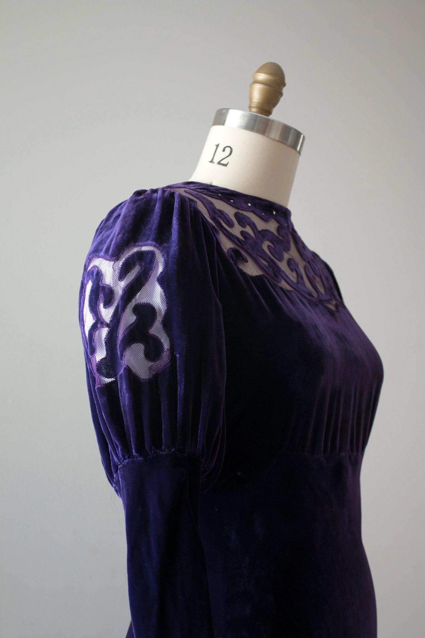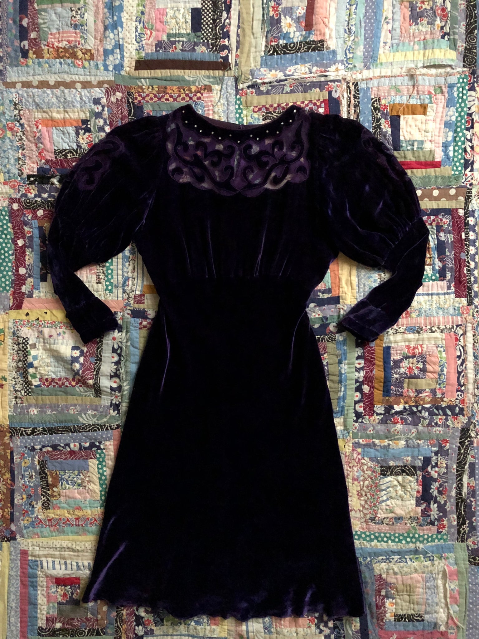STUNNING purple velvet bias cut dress from the 1930s. This dress features the most stunning neckline mesh cut out details and the same details on the sleeves! I added some tissue in the sleeves to show the beautiful puff to it!!