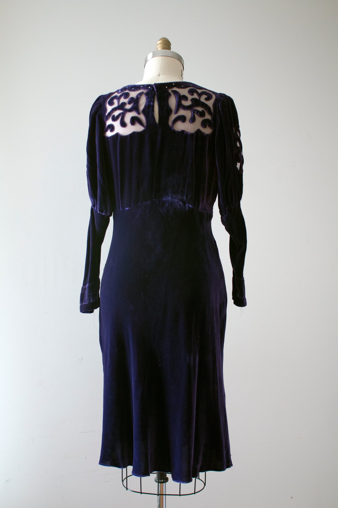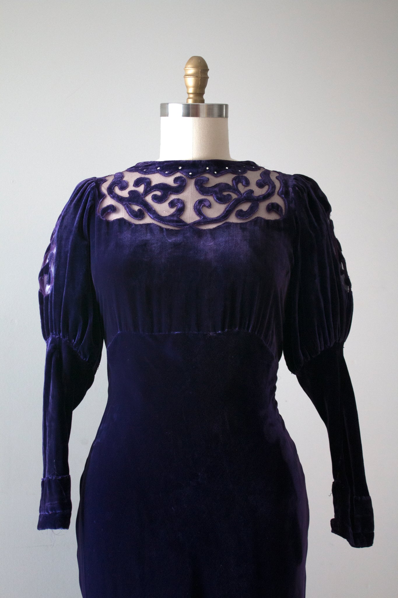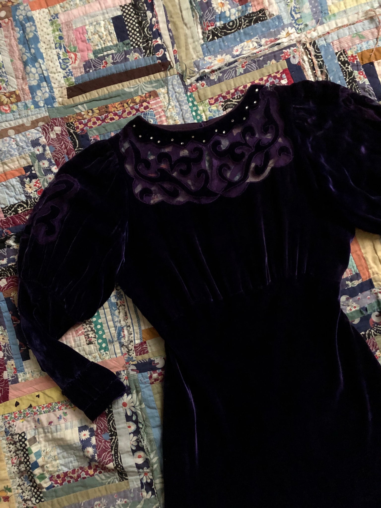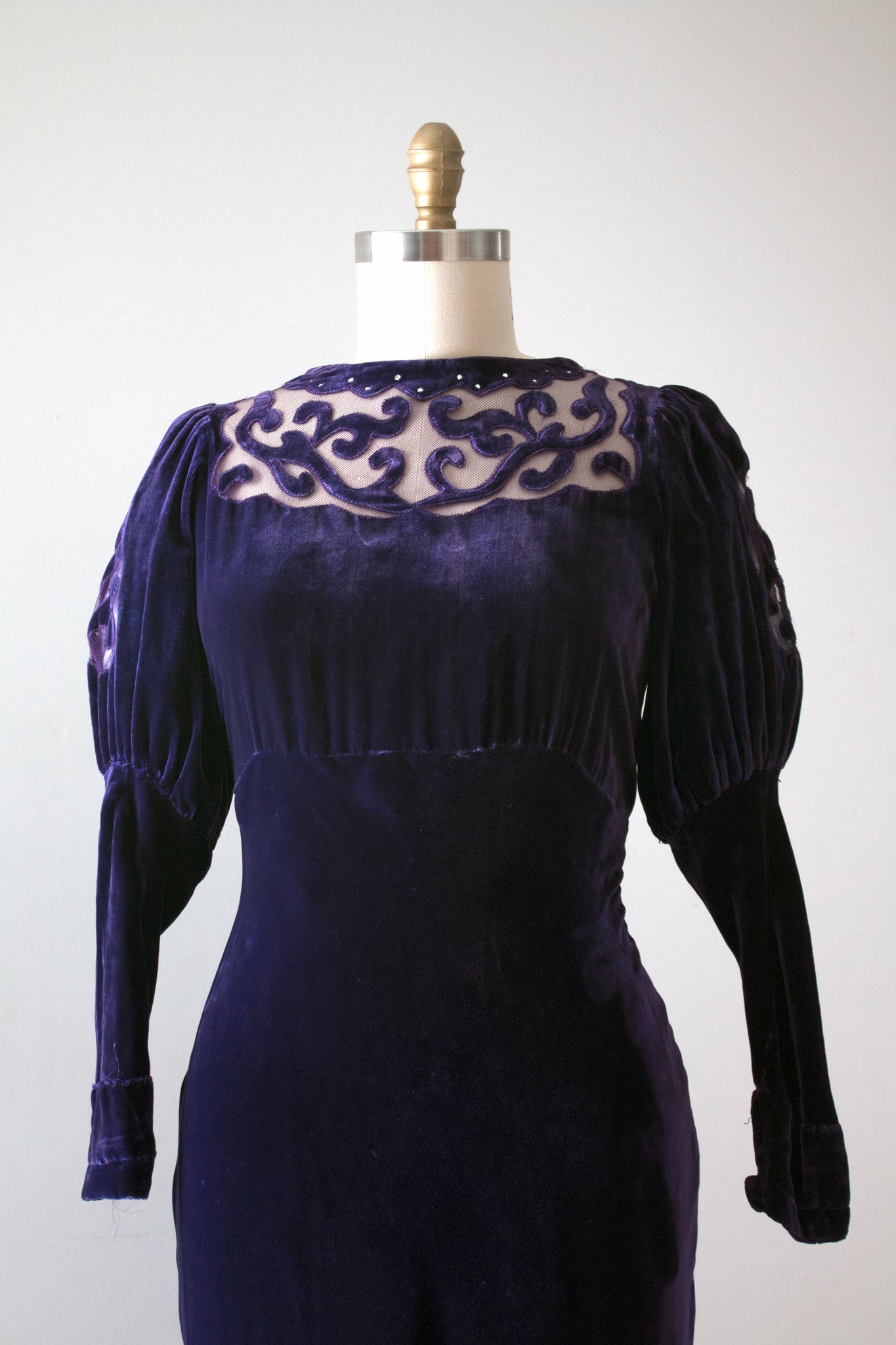 STUNNING purple velvet bias cut dress from the 1930s. This dress features the most stunning neckline mesh cut out details and the same details on the sleeves! I added some tissue in the sleeves to show the beautiful puff to it!!
