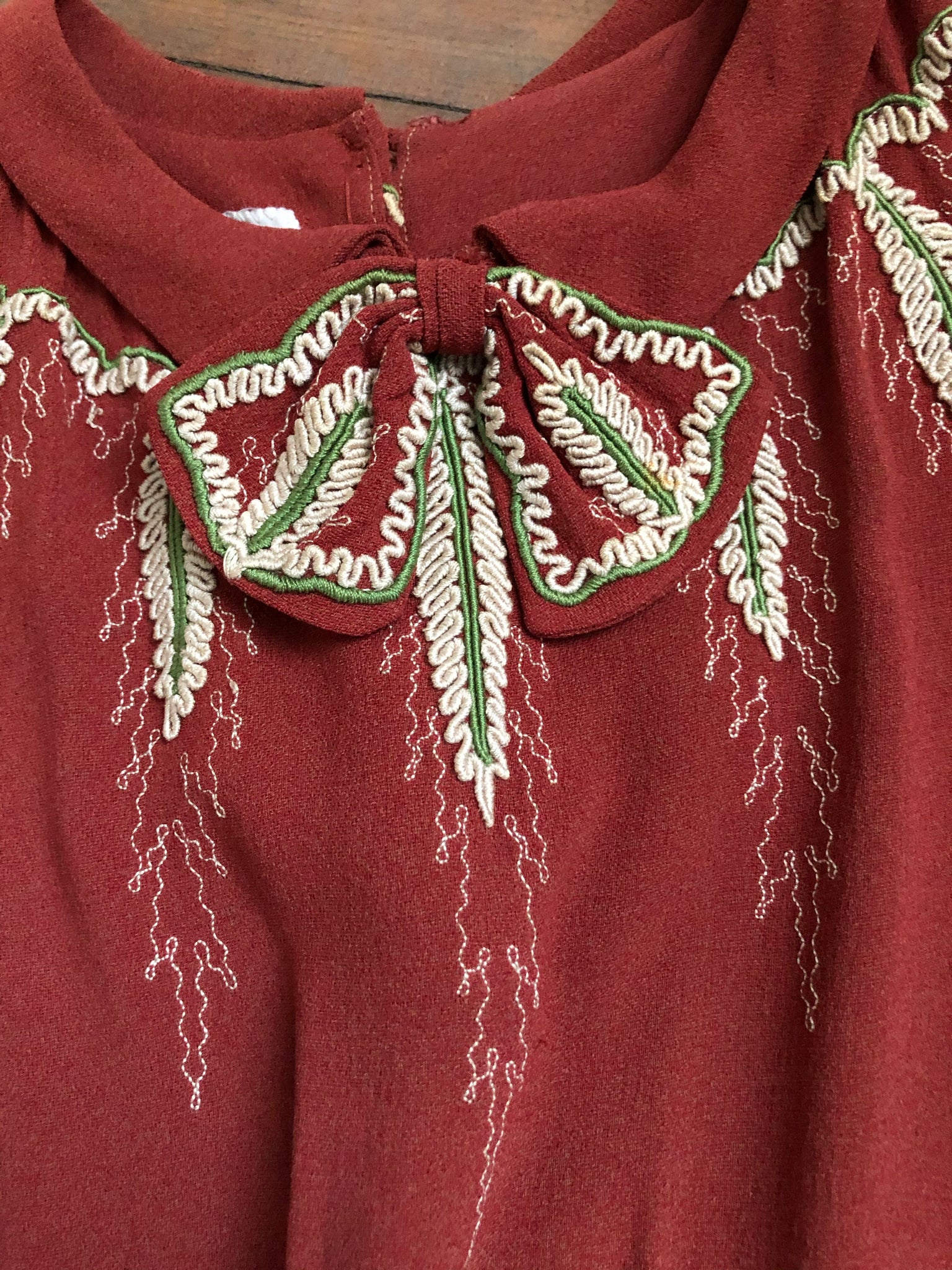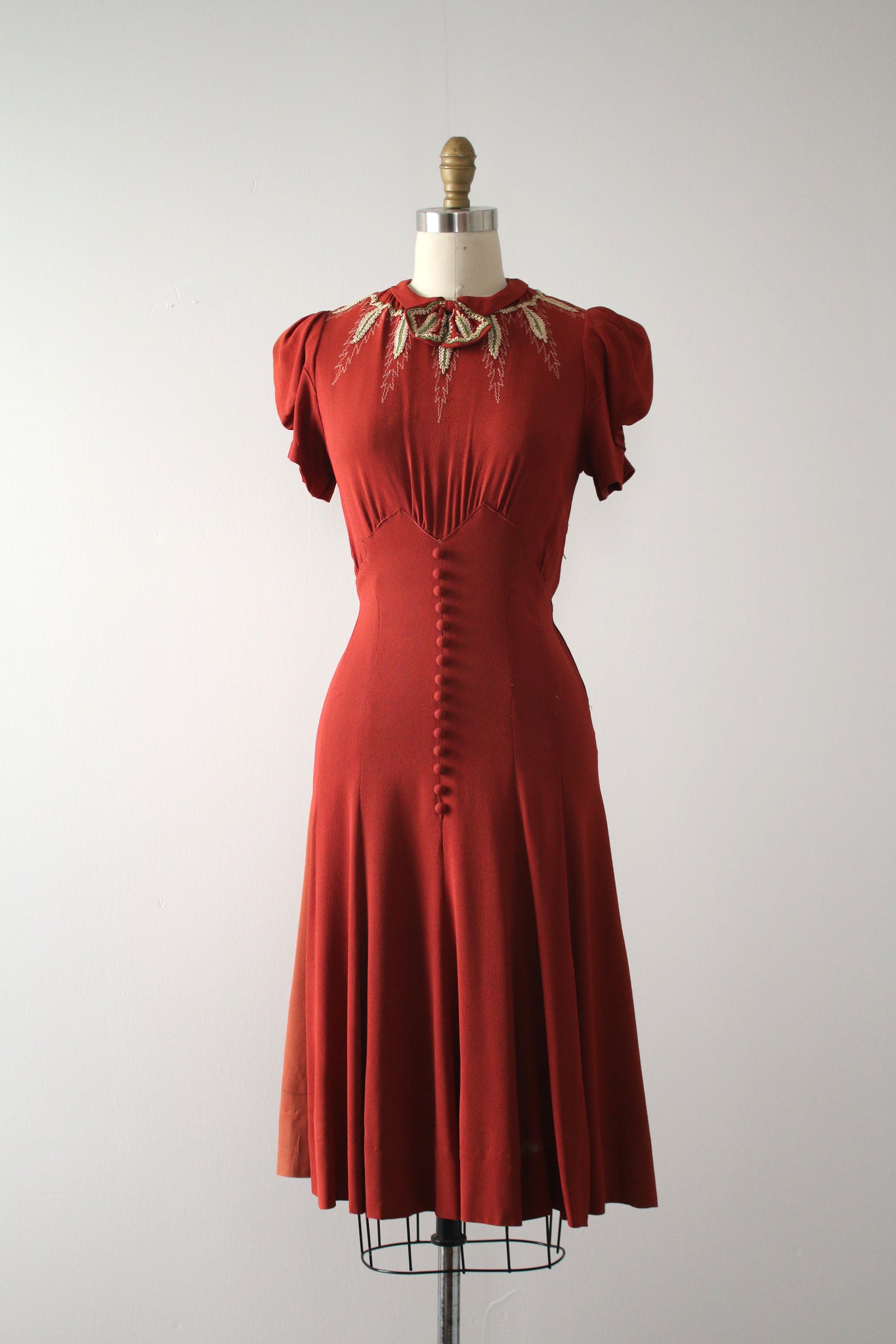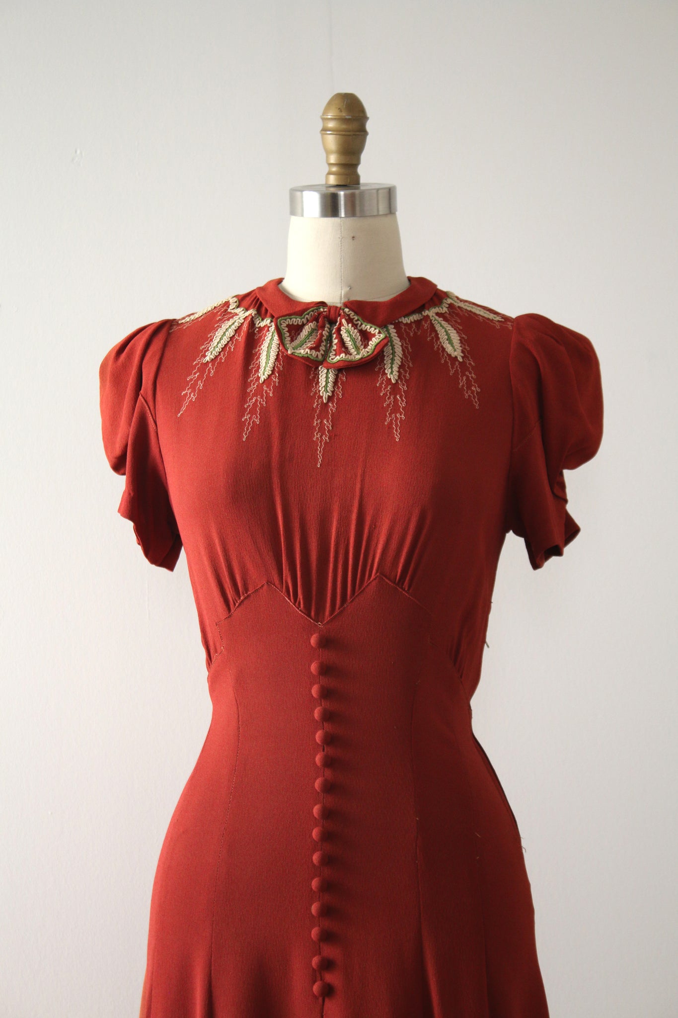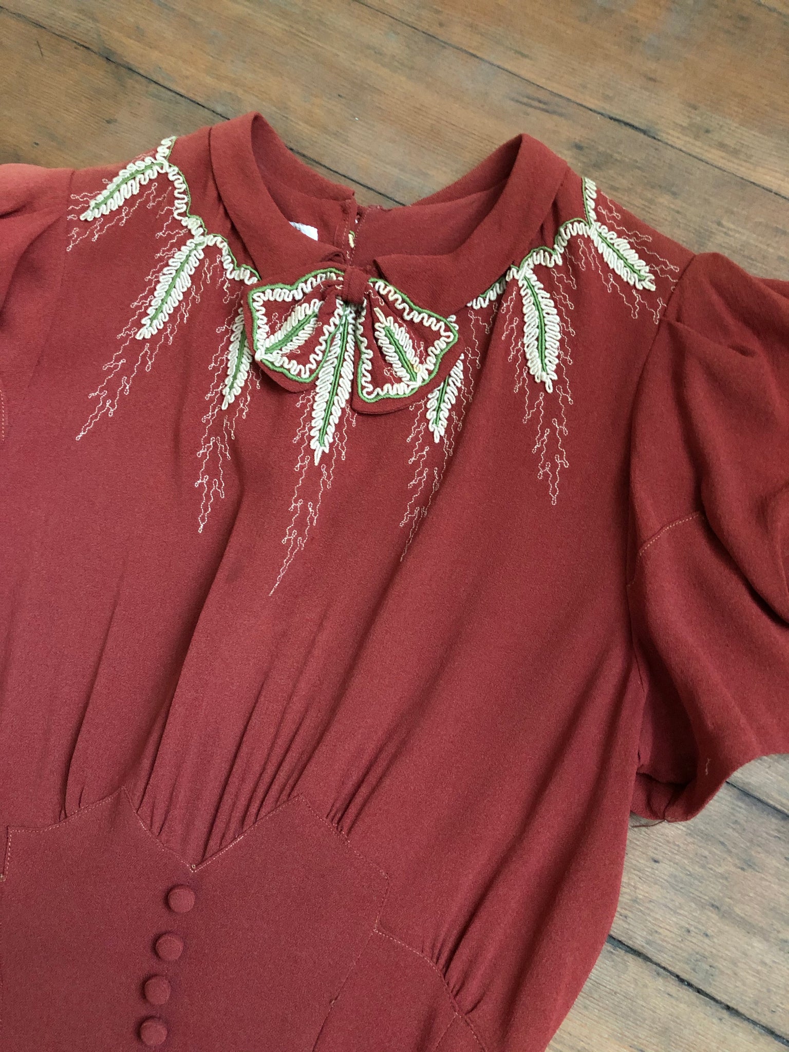 STUNNING rayon crepe dress from the late 1930s. This dress features the most gorgeous appliqué details at the neckline and shoulders.