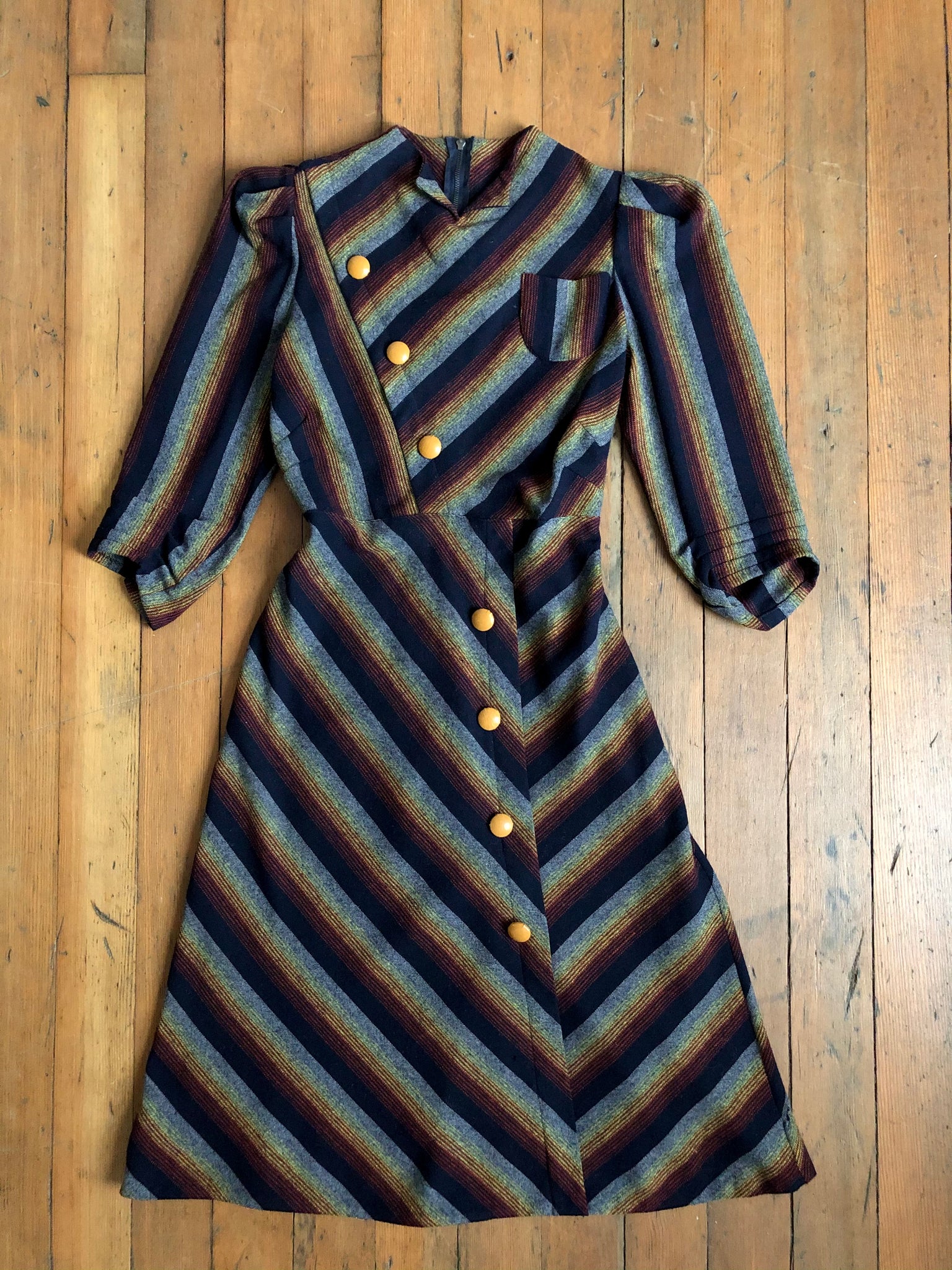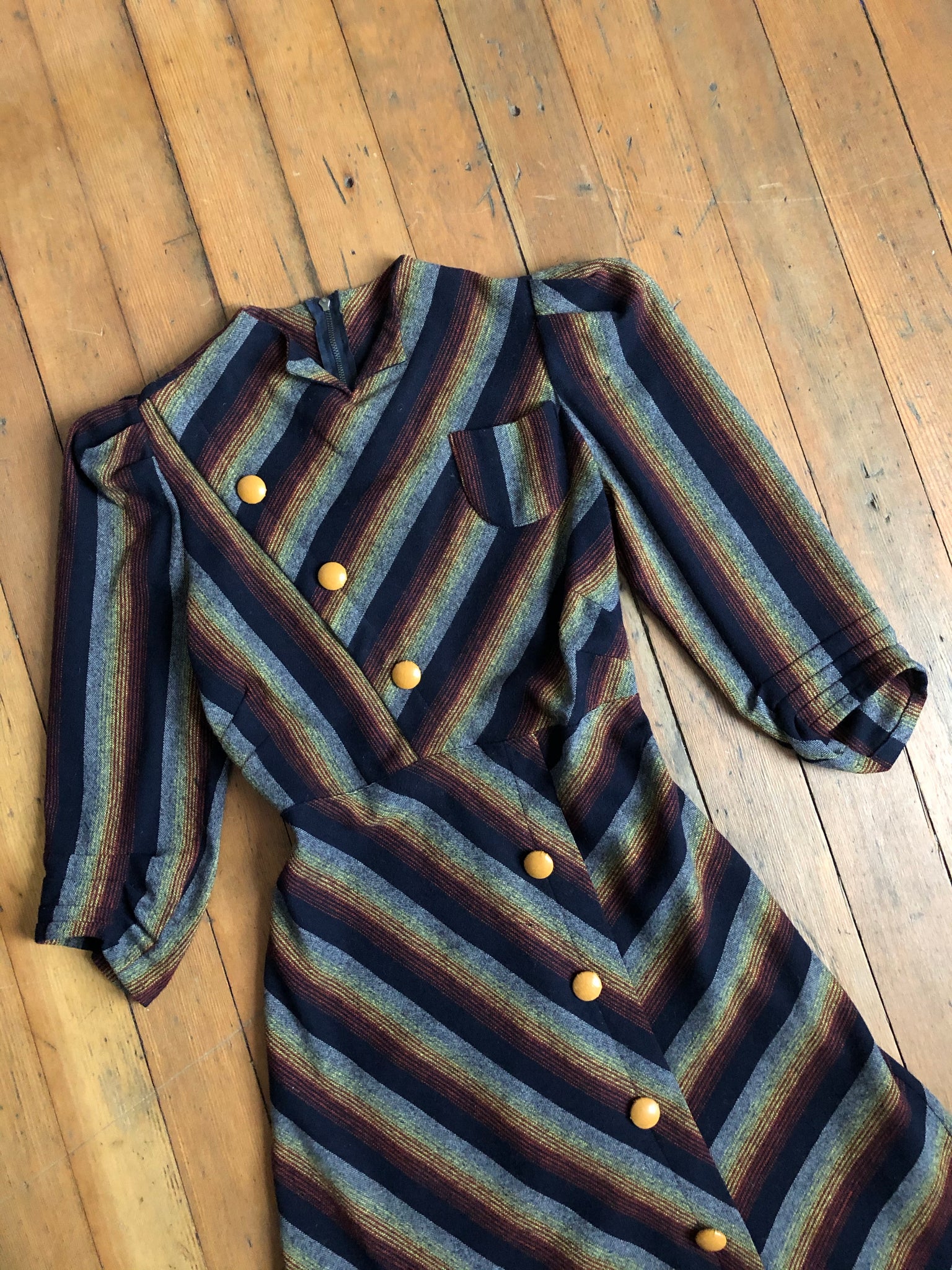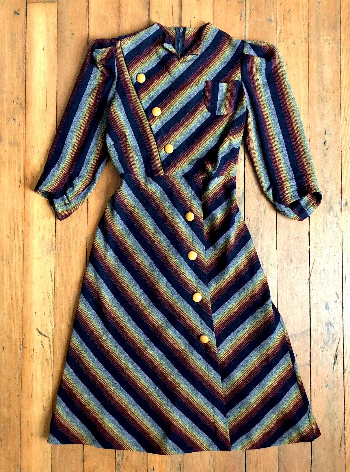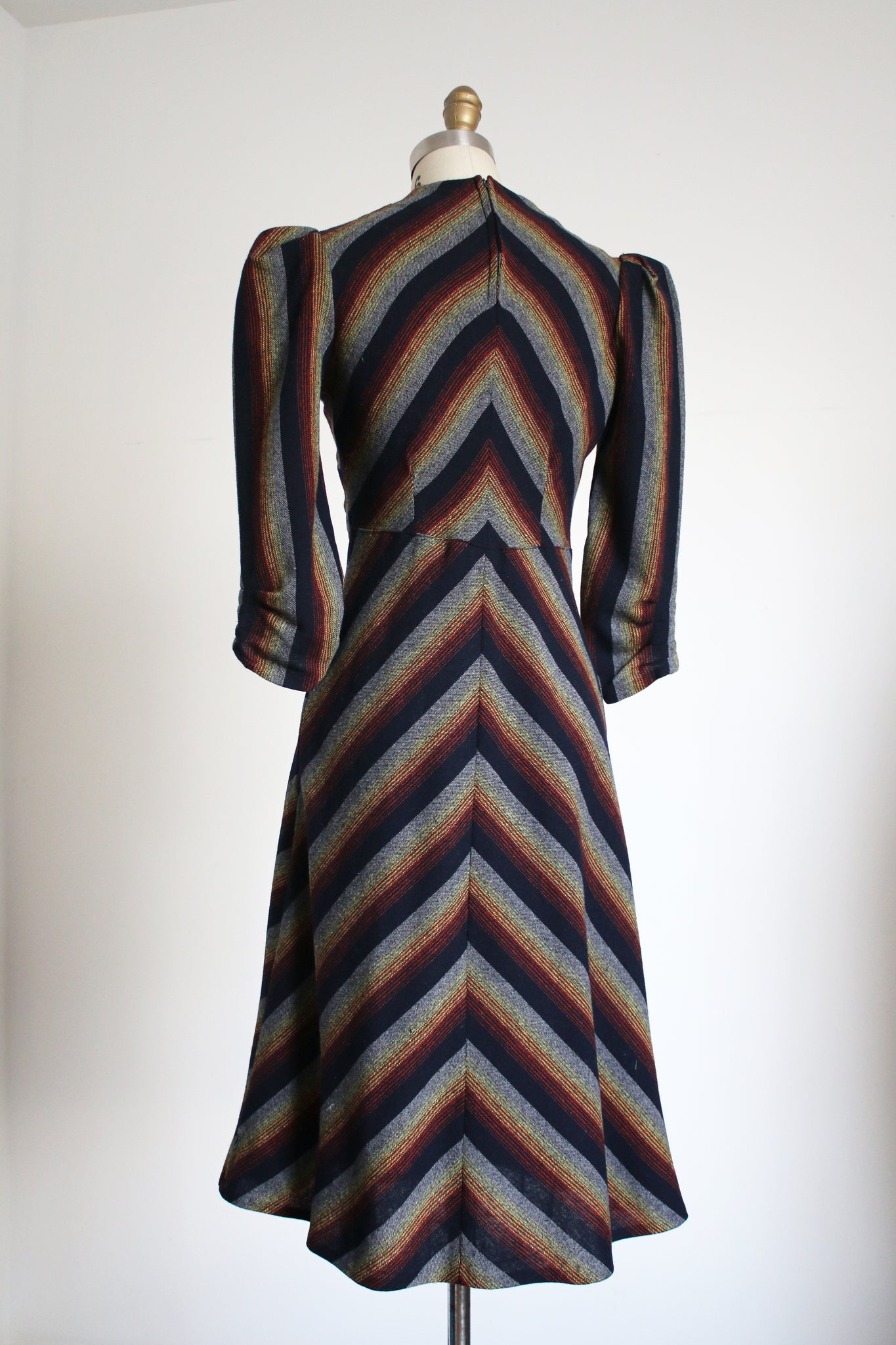 Really unique colourful striped wool dress from the 1930s. I believe this dress is cut on the bias or something as it sits a bit different and has some stretch to it due to the way it's cut. There is a small metal zip behind the neck but no side or back zipper but the way the waist opens when stretched is how it's meant to slip on. It has little puffed sleeves and a cute single pocket on the front.