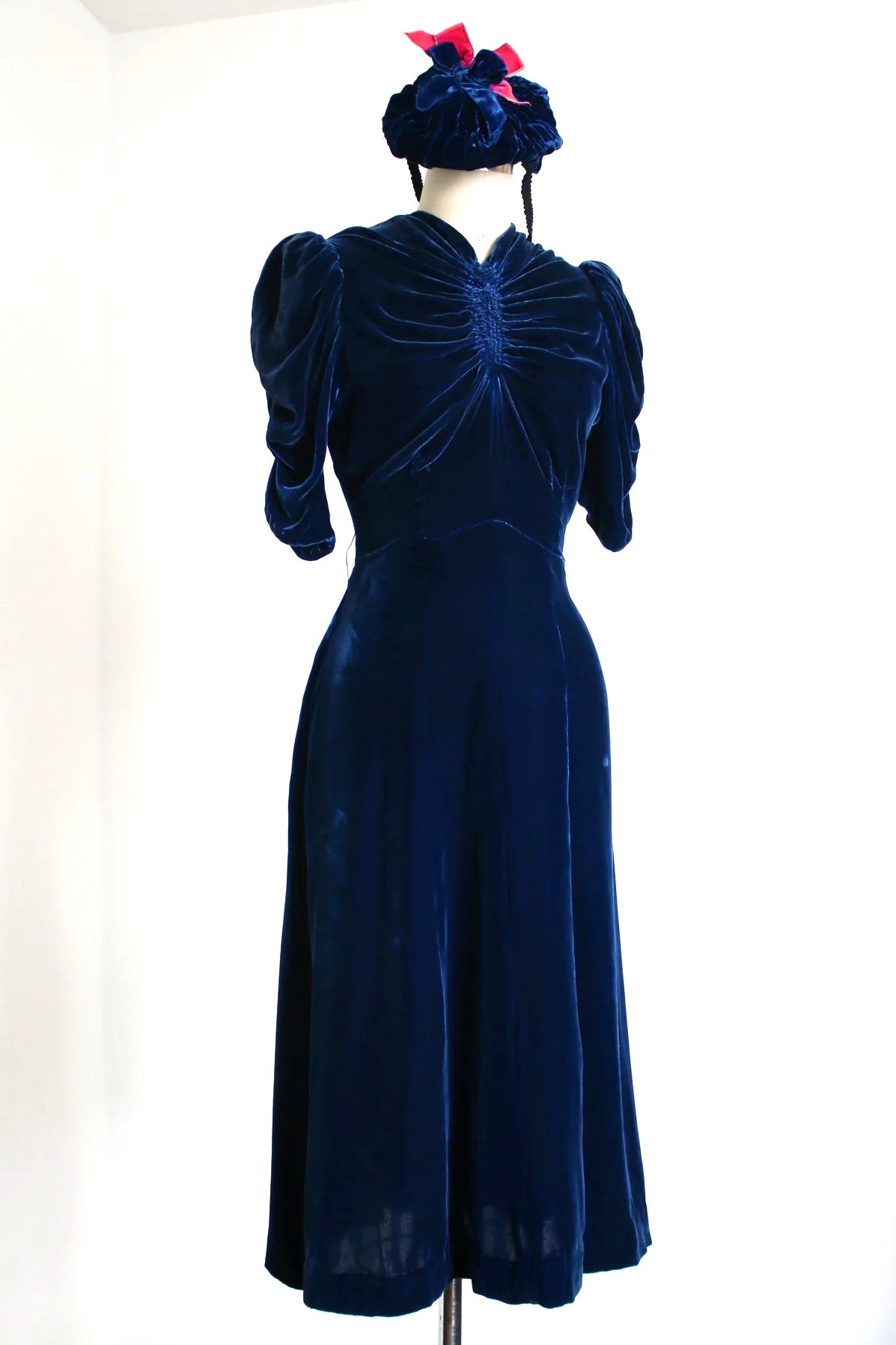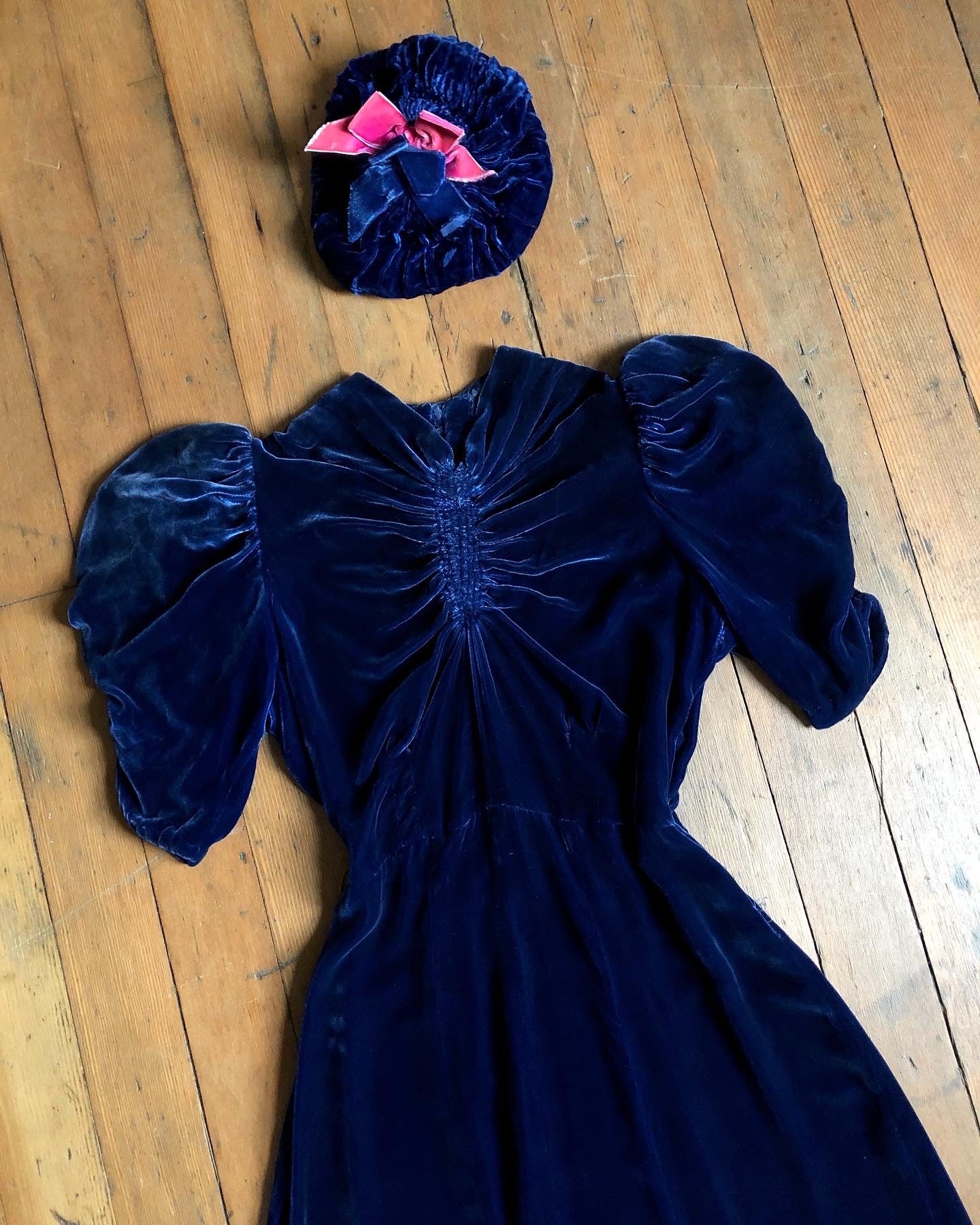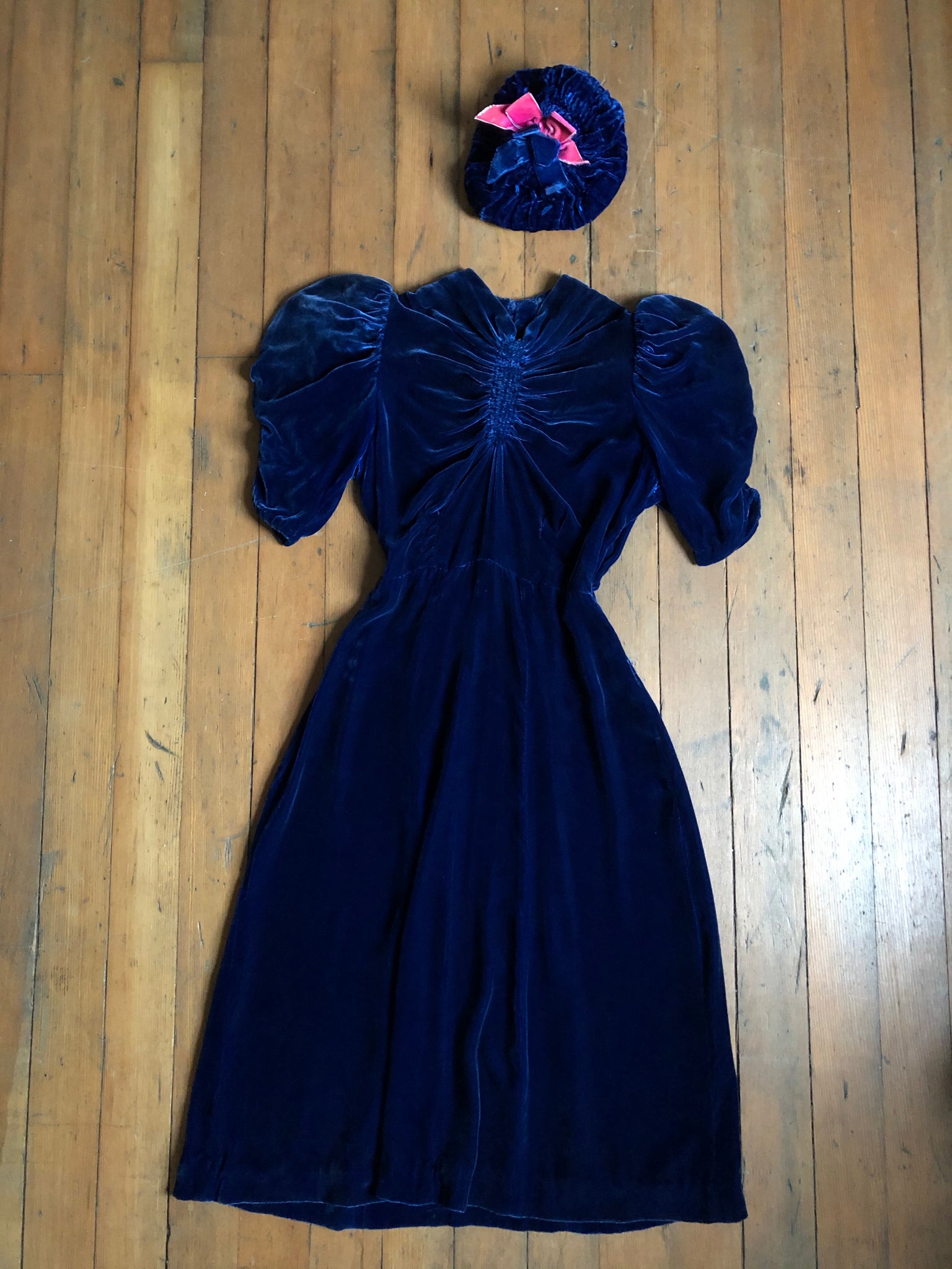 INCREDIBLE 1930s icy blue velvet dress with matching HAT!!! I'm seriously in awe of this set. It's so rare to find the matching hats. This one being even more special with that pop of pink!! Anywho the dress is stunning with puffed sleeves, fitted waistline, and unique bust. There are snaps on the side of the dress.