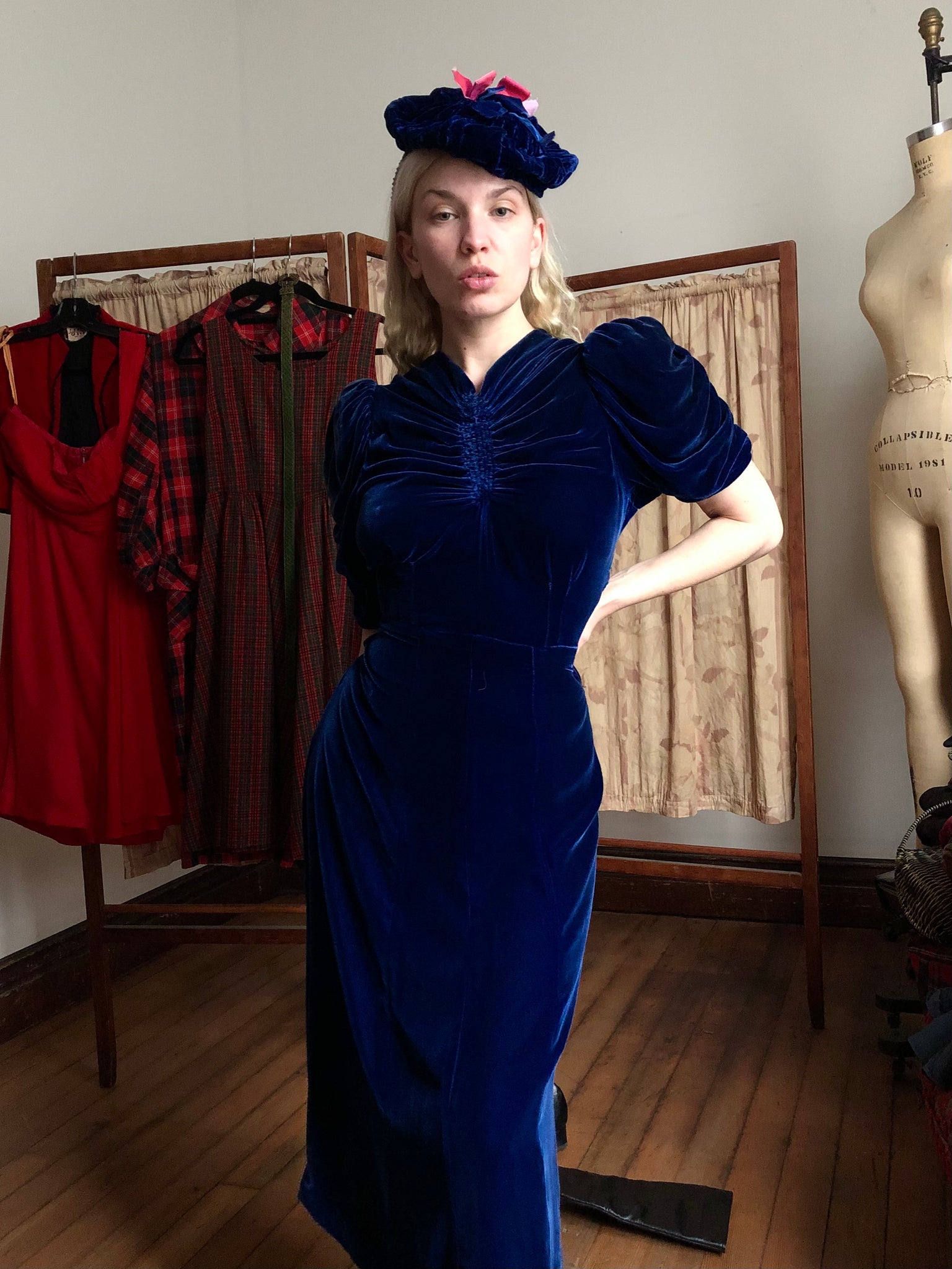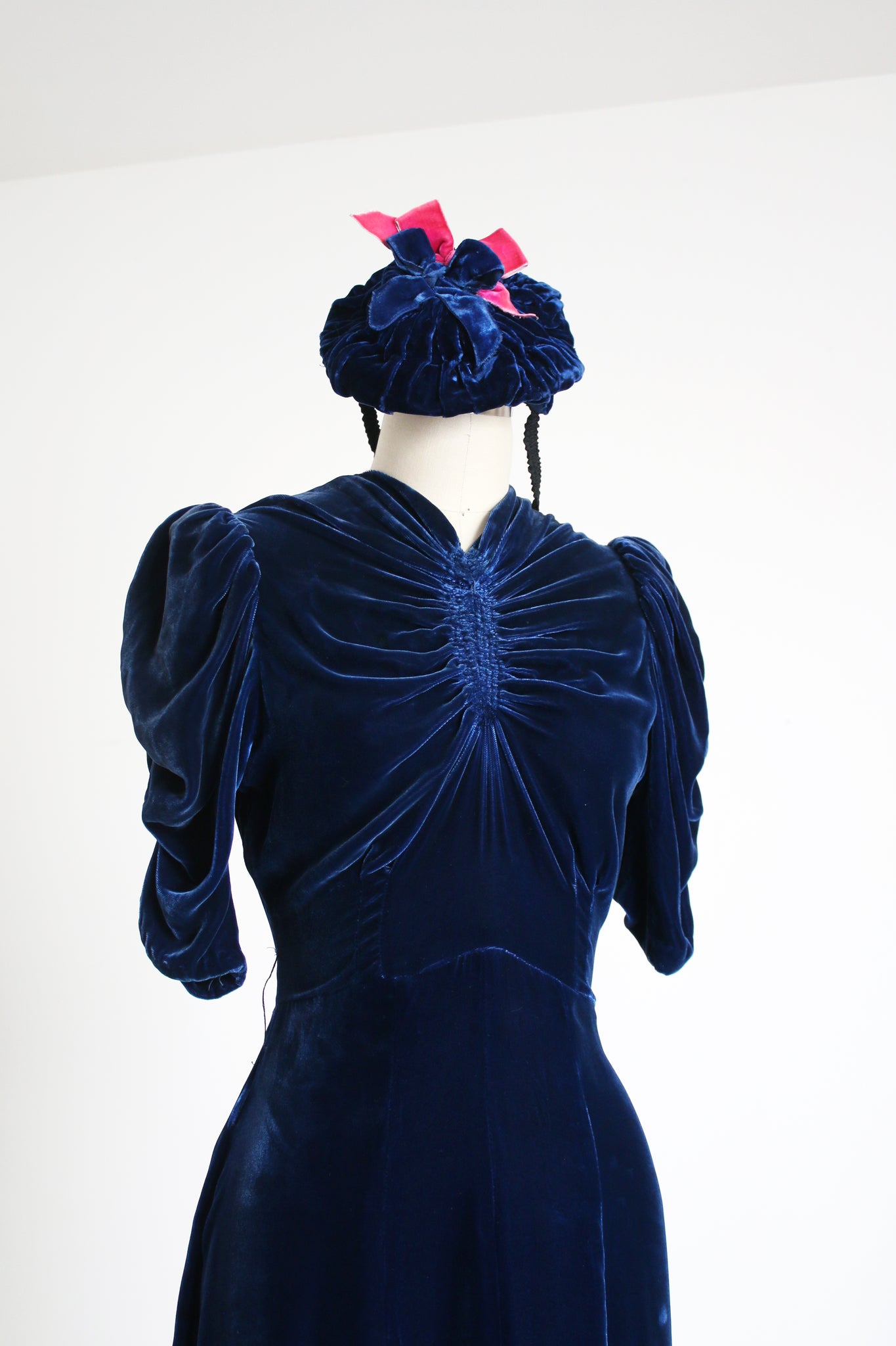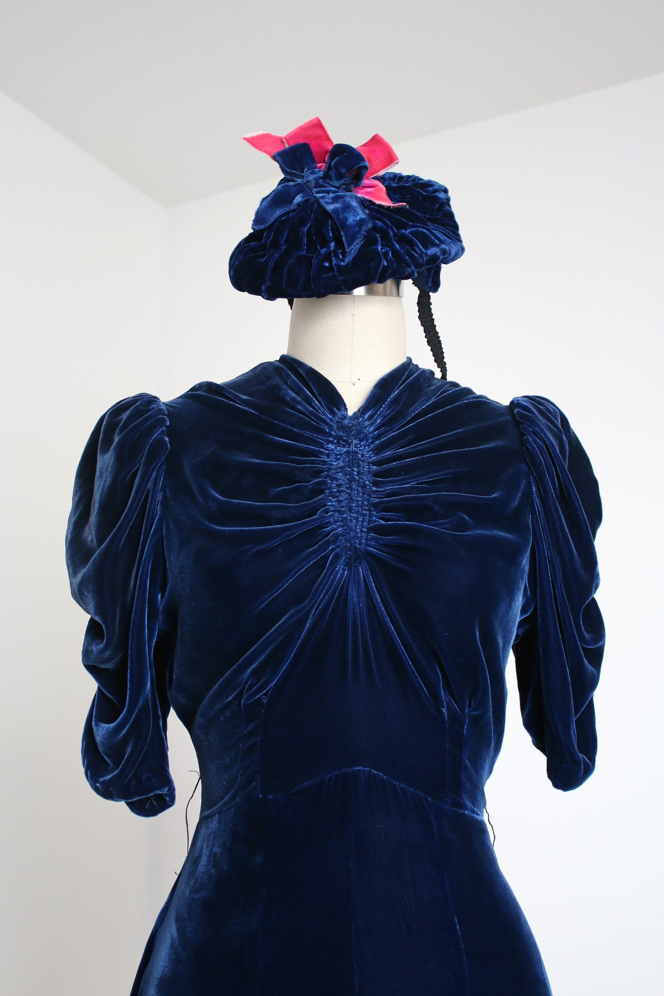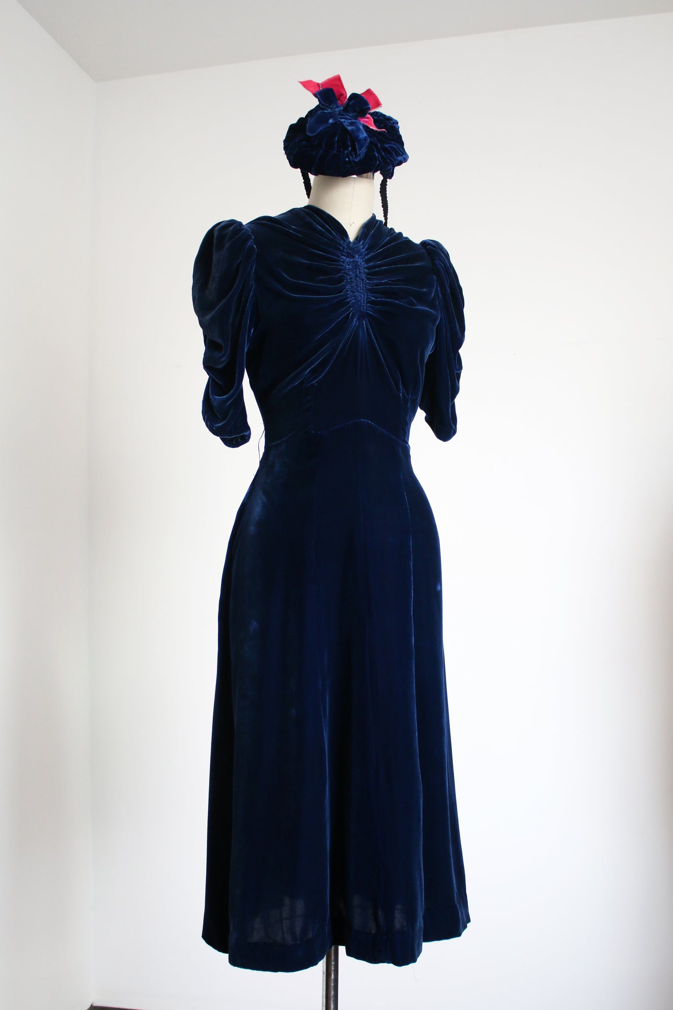 INCREDIBLE 1930s icy blue velvet dress with matching HAT!!! I'm seriously in awe of this set. It's so rare to find the matching hats. This one being even more special with that pop of pink!! Anywho the dress is stunning with puffed sleeves, fitted waistline, and unique bust. There are snaps on the side of the dress.