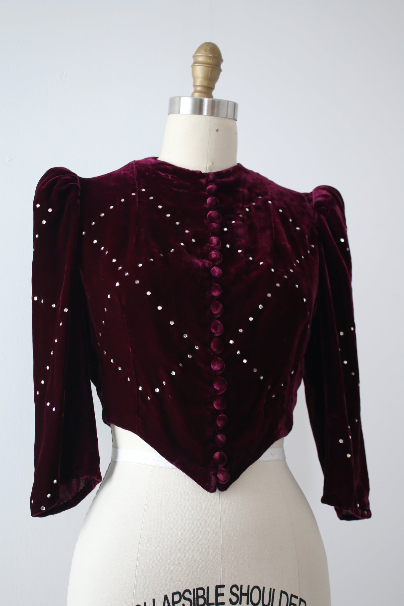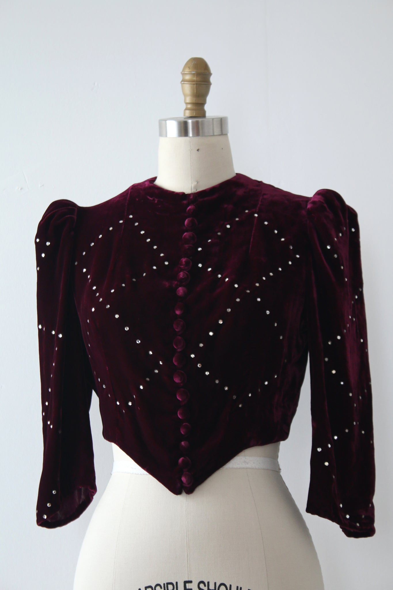 Absolutely incredible velvet jacket from the late 1930s. It was really hard to photograph the color completely accurately but it's close. This jacket features rhinestones throughout, pointed centre front and back, and puffed shoulders