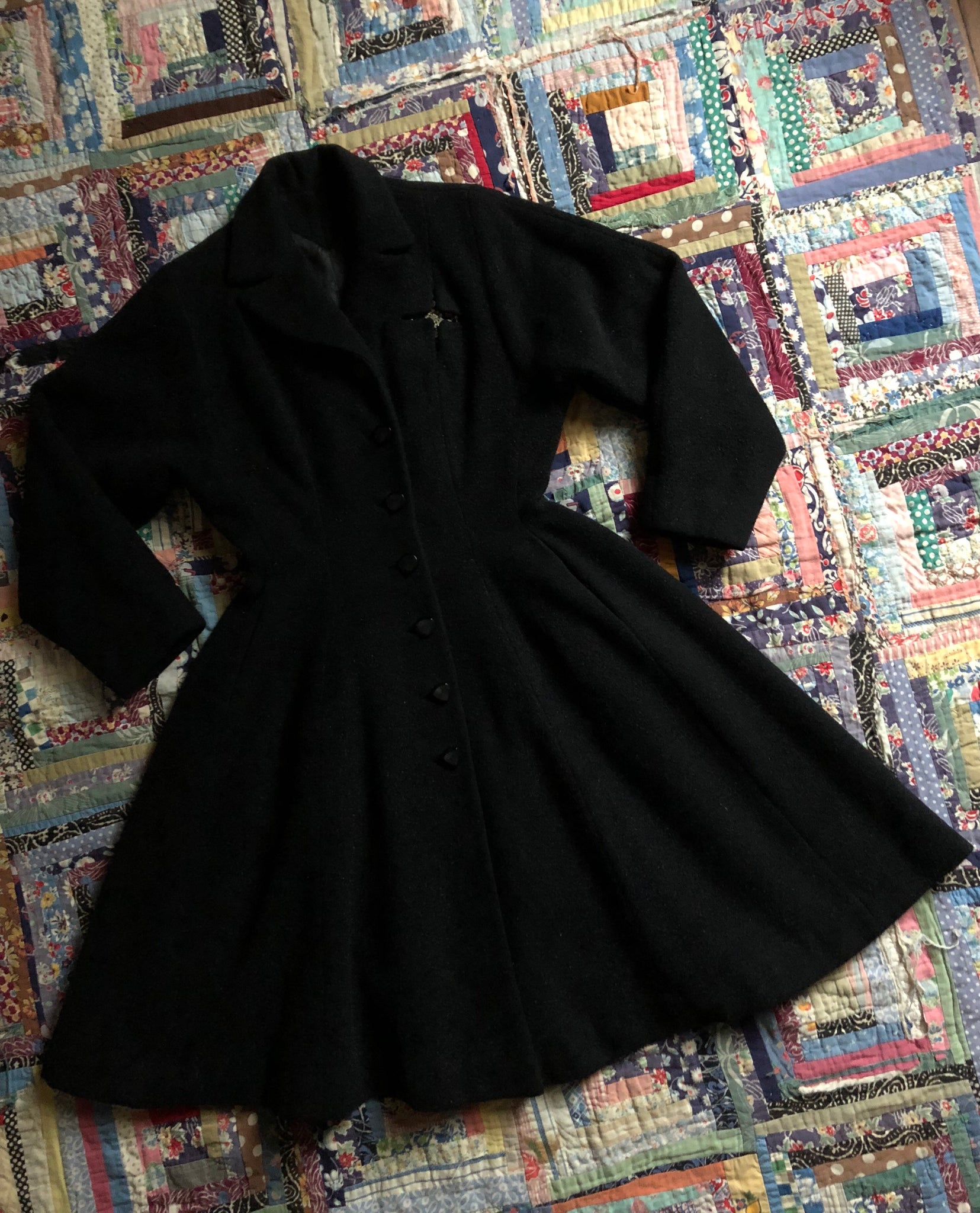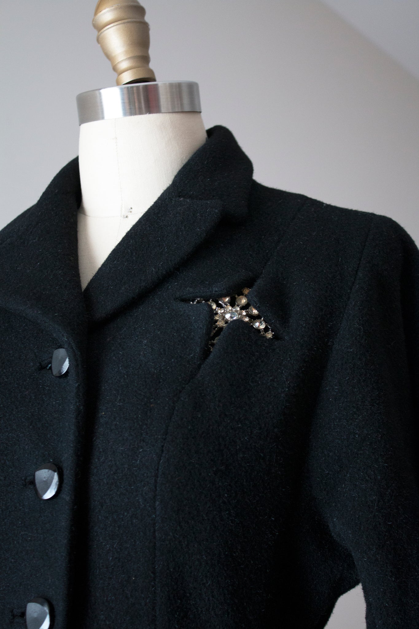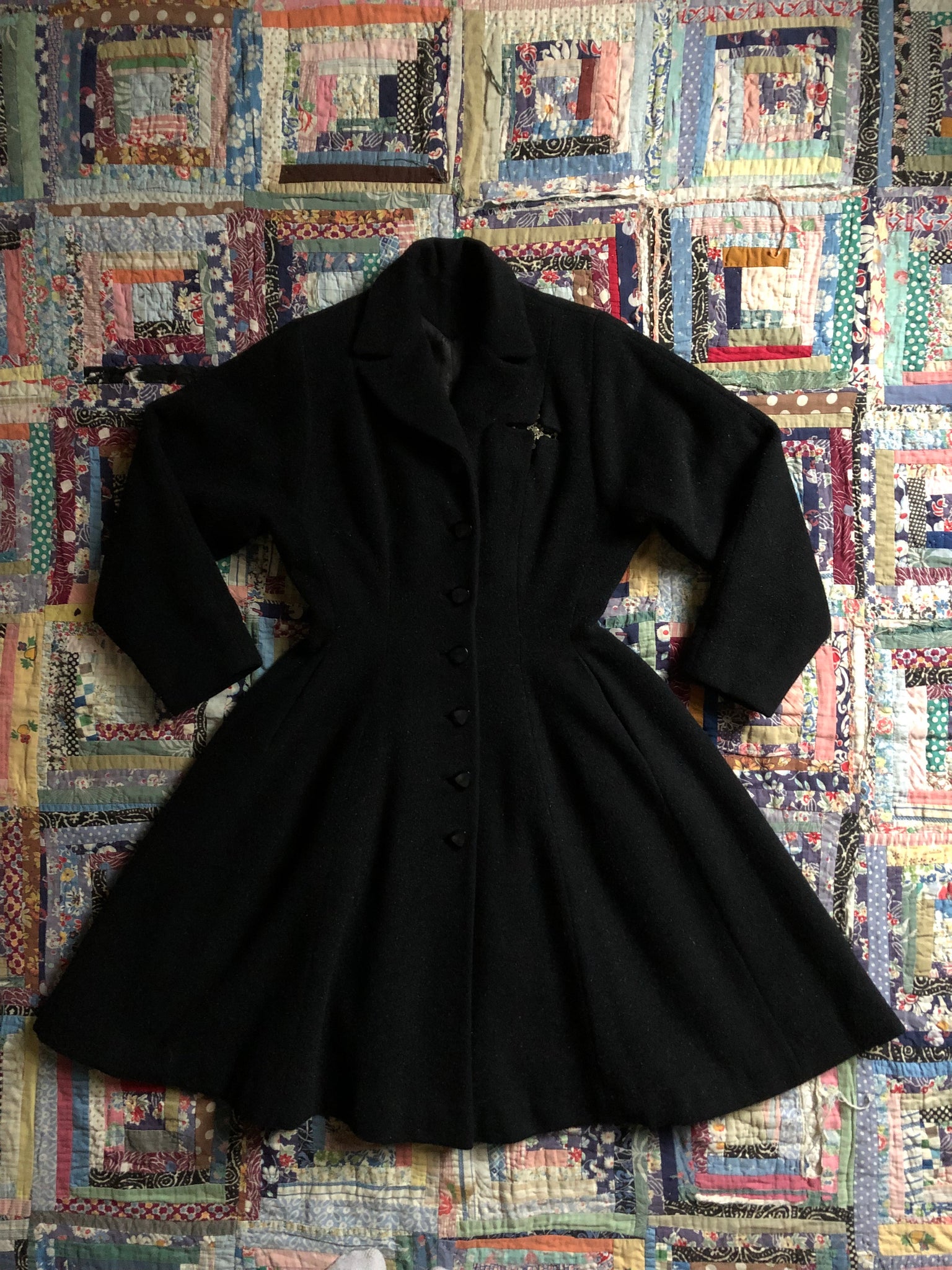STUNNING absolutely gorgeous black wool princess coat from the 1940s 1950s. This coat features a button up front, fitted waistline, and full skirt. There are pockets. It is lined. There is also the coolest rhinestone "brooch" style detail hidden within this super unique cut out detail on the shoulder bodice area. This coat is photographed with a petticoat underneath for volume which is not included.