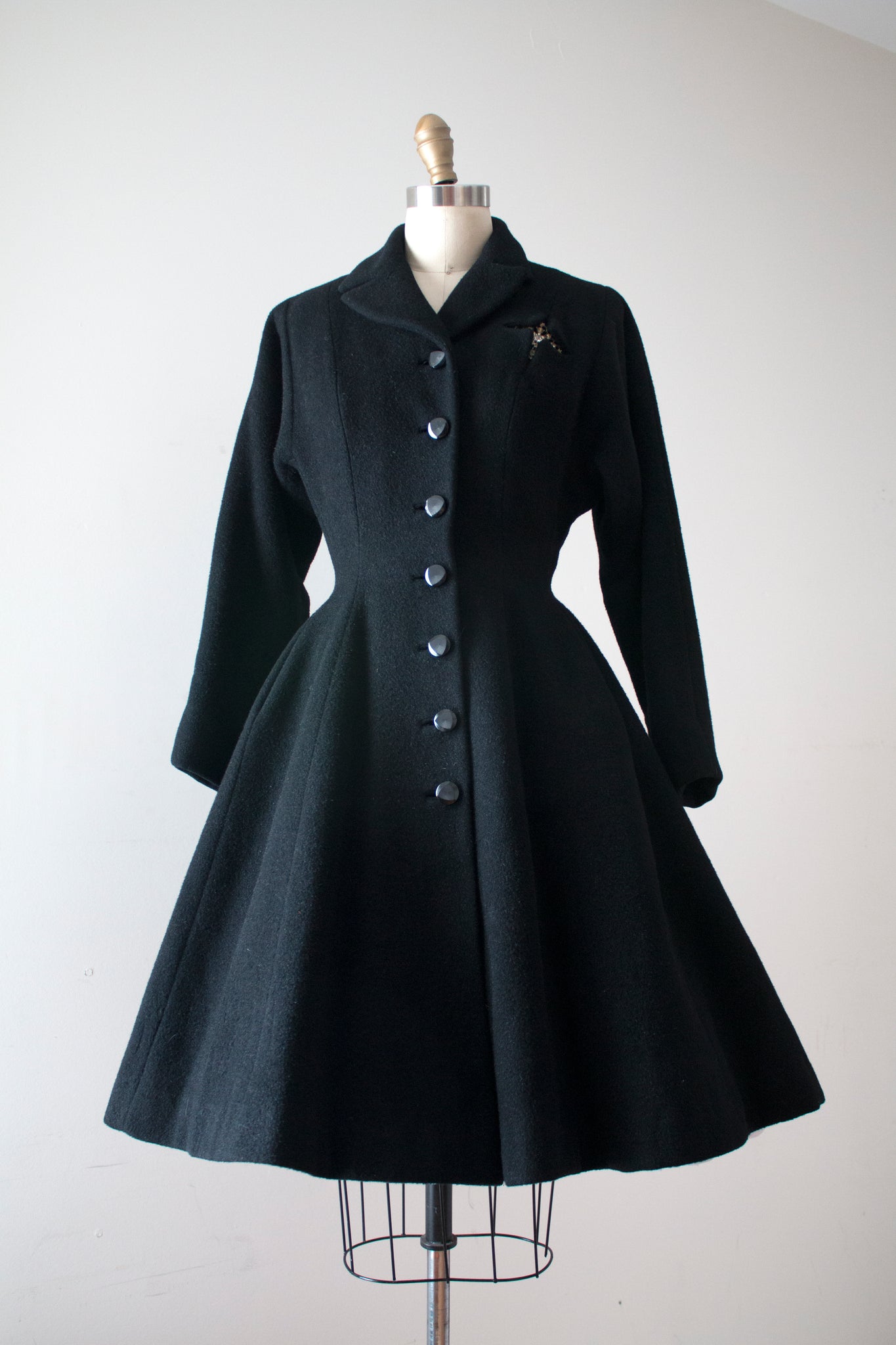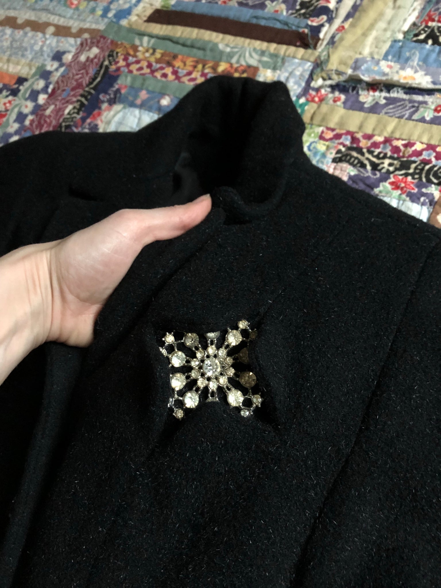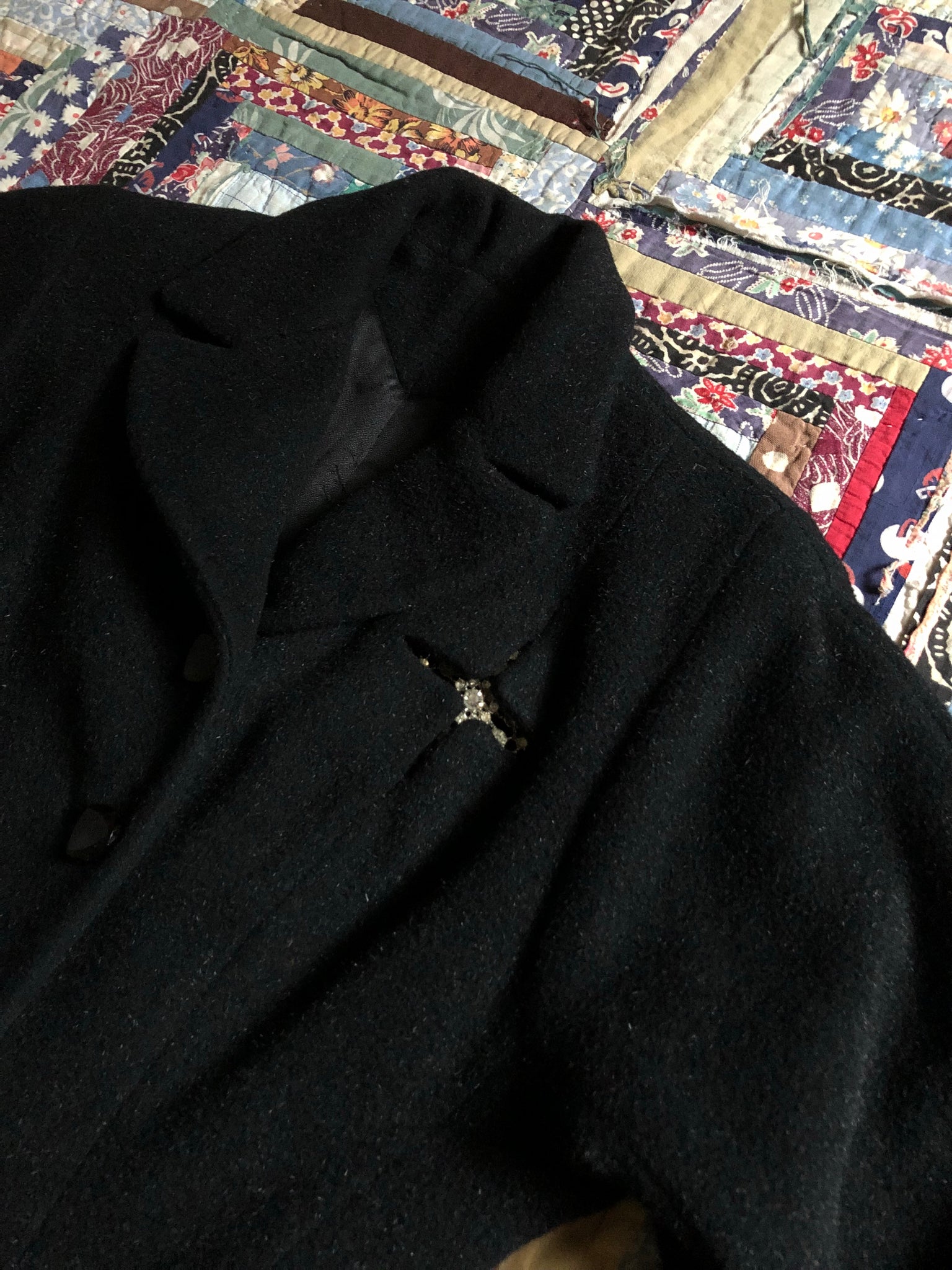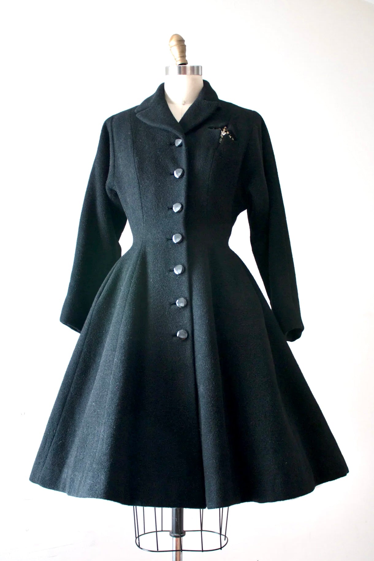 STUNNING absolutely gorgeous black wool princess coat from the 1940s 1950s. This coat features a button up front, fitted waistline, and full skirt. There are pockets. It is lined. There is also the coolest rhinestone "brooch" style detail hidden within this super unique cut out detail on the shoulder bodice area. This coat is photographed with a petticoat underneath for volume which is not included.