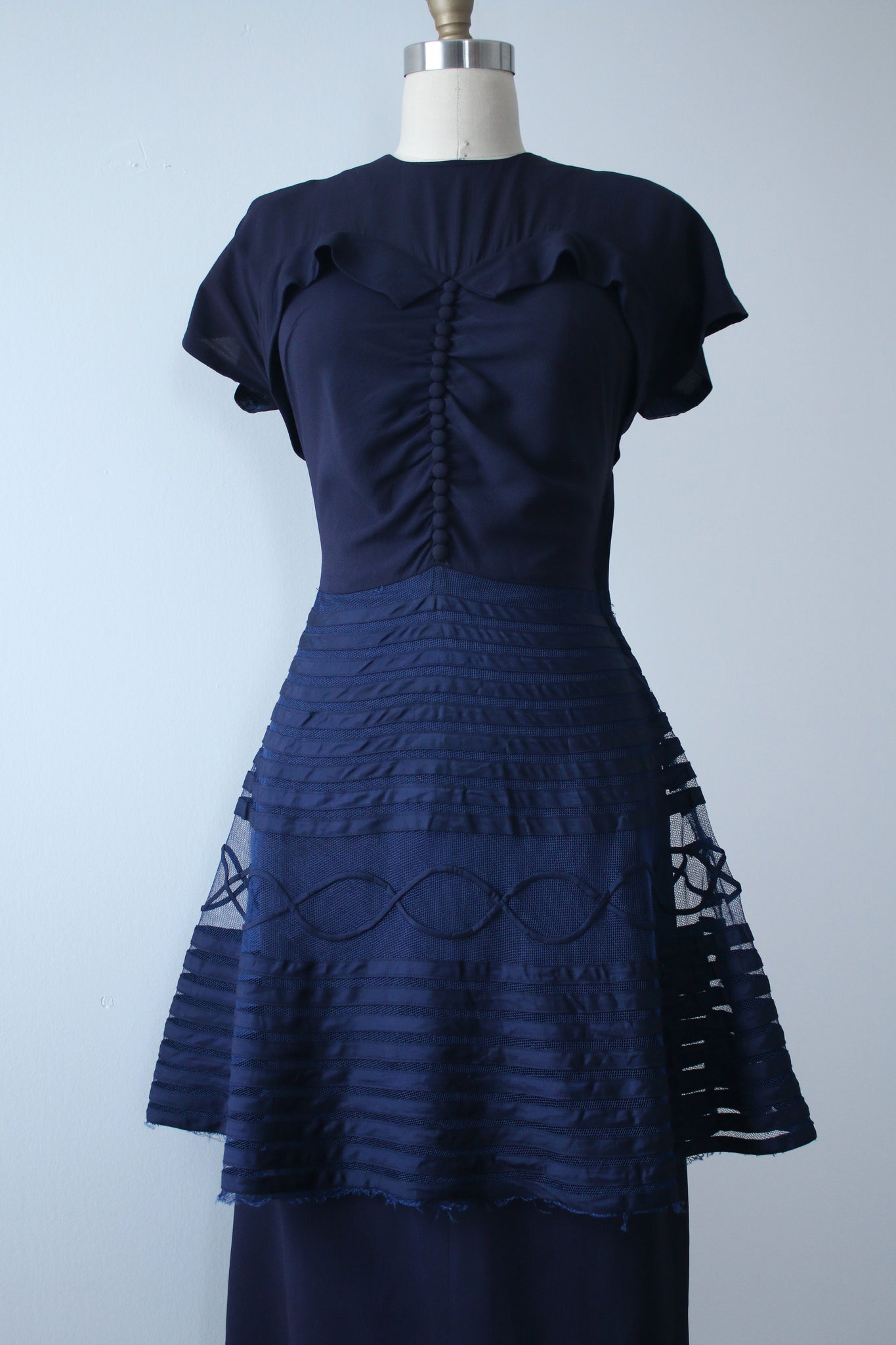 INCREDIBLE and unique navy blue rayon dress from the 1940s. This dress features a unique bodice with buttons down the front, a fitted waistline, and an incredible large unique peplum detail!