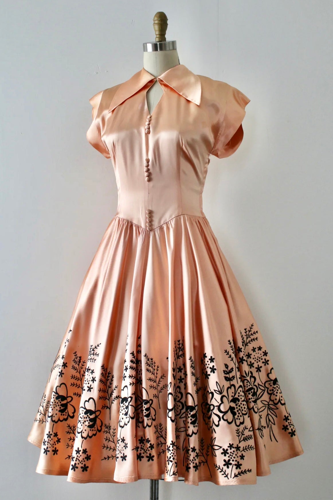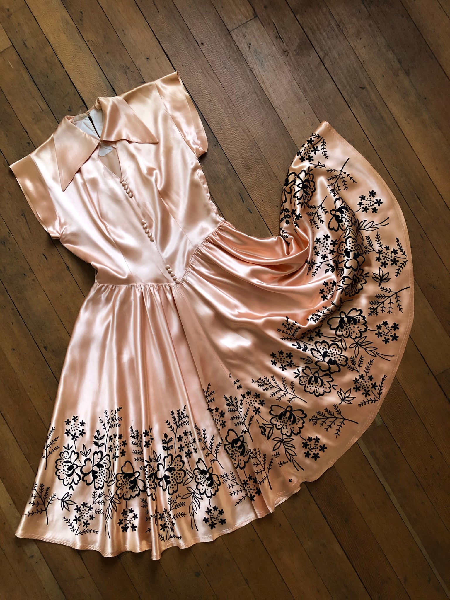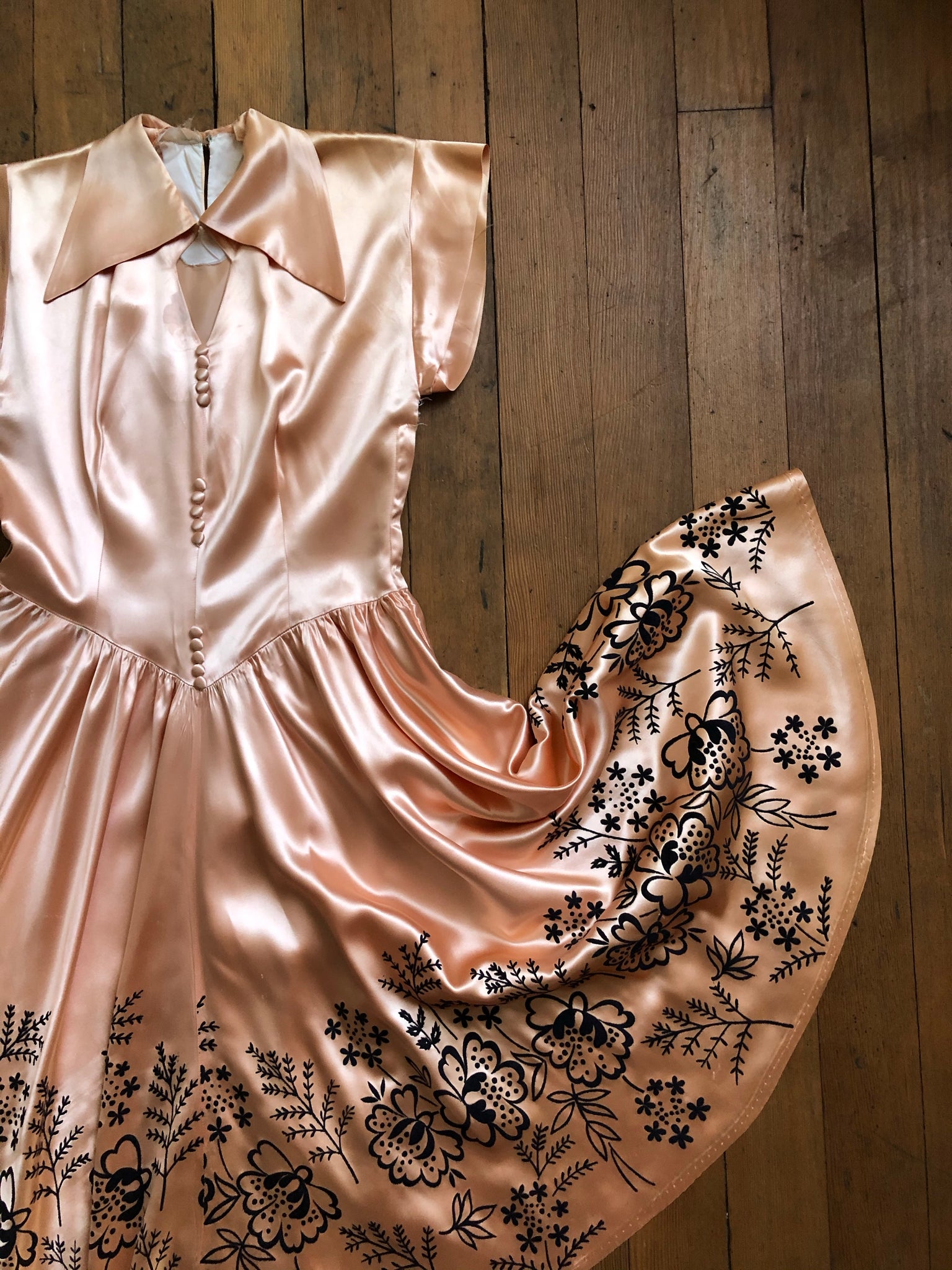Stunning pink satin evening dress from the late 1940s / early 1950s. This dress features a unique bodice, big pointed collar, and a full skirt with black floral flocking!! Metal zipper on the side.