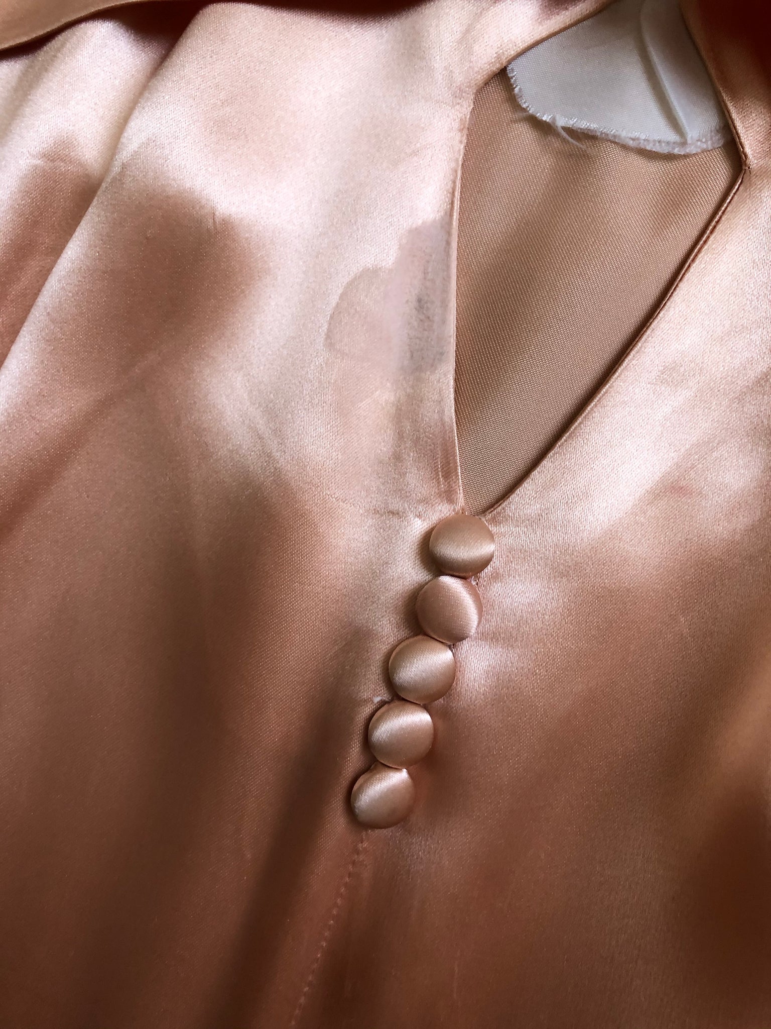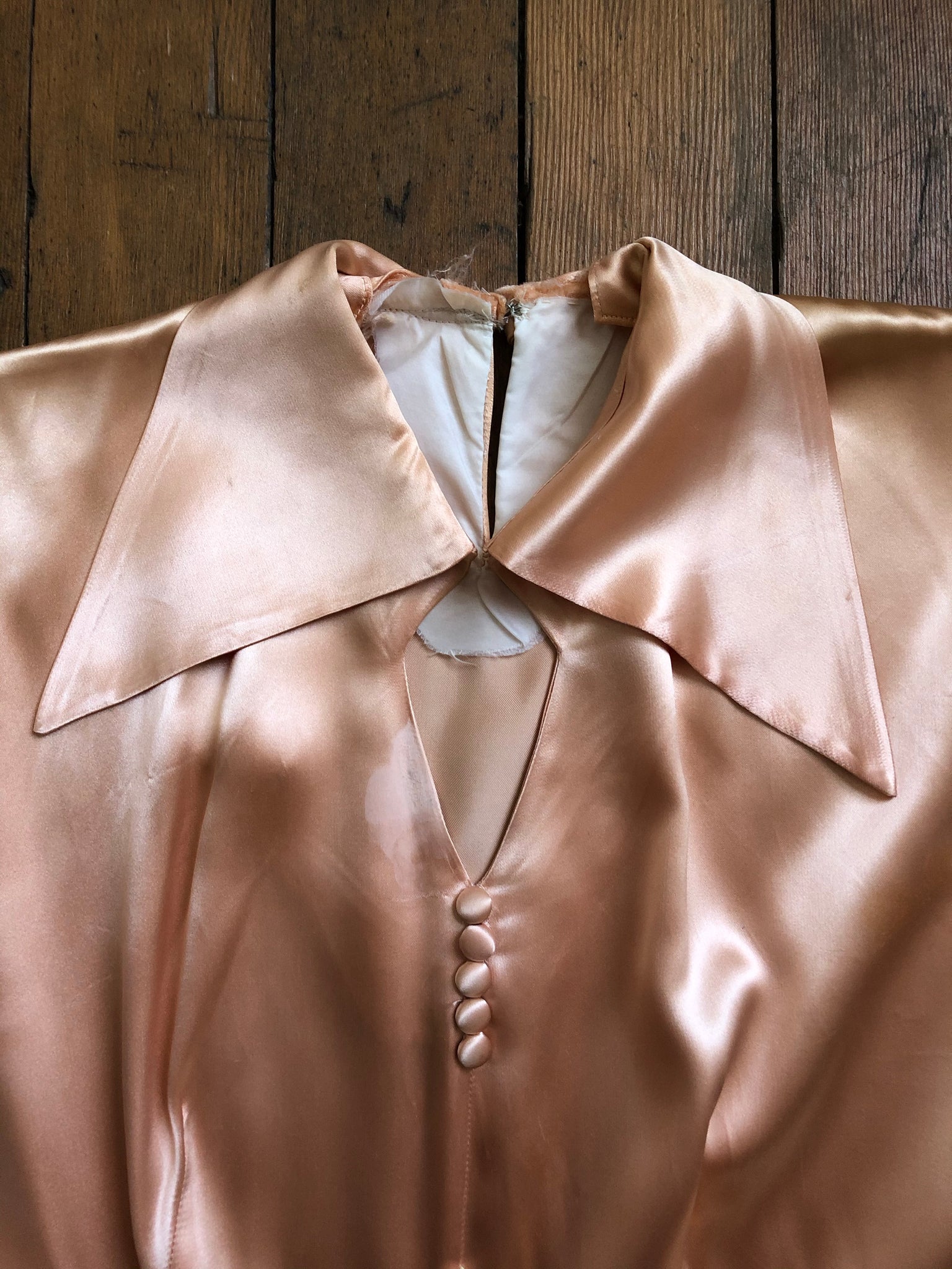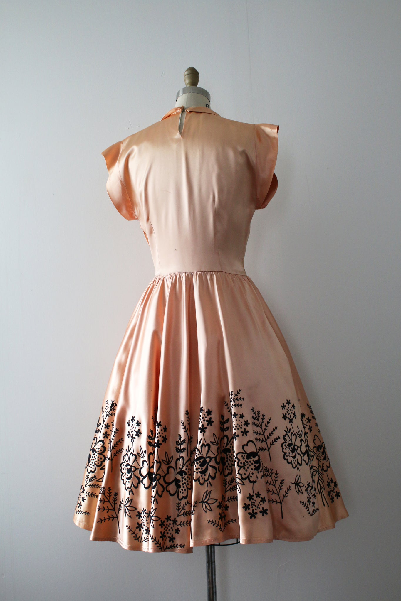 Stunning pink satin evening dress from the late 1940s / early 1950s. This dress features a unique bodice, big pointed collar, and a full skirt with black floral flocking!! Metal zipper on the side.
