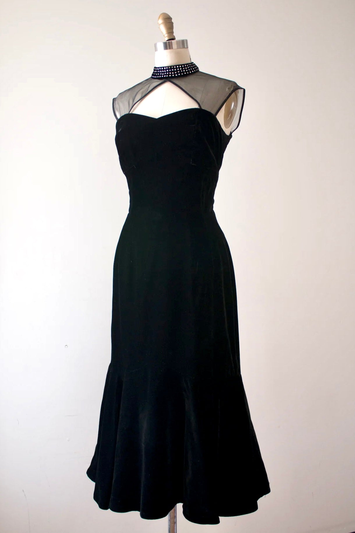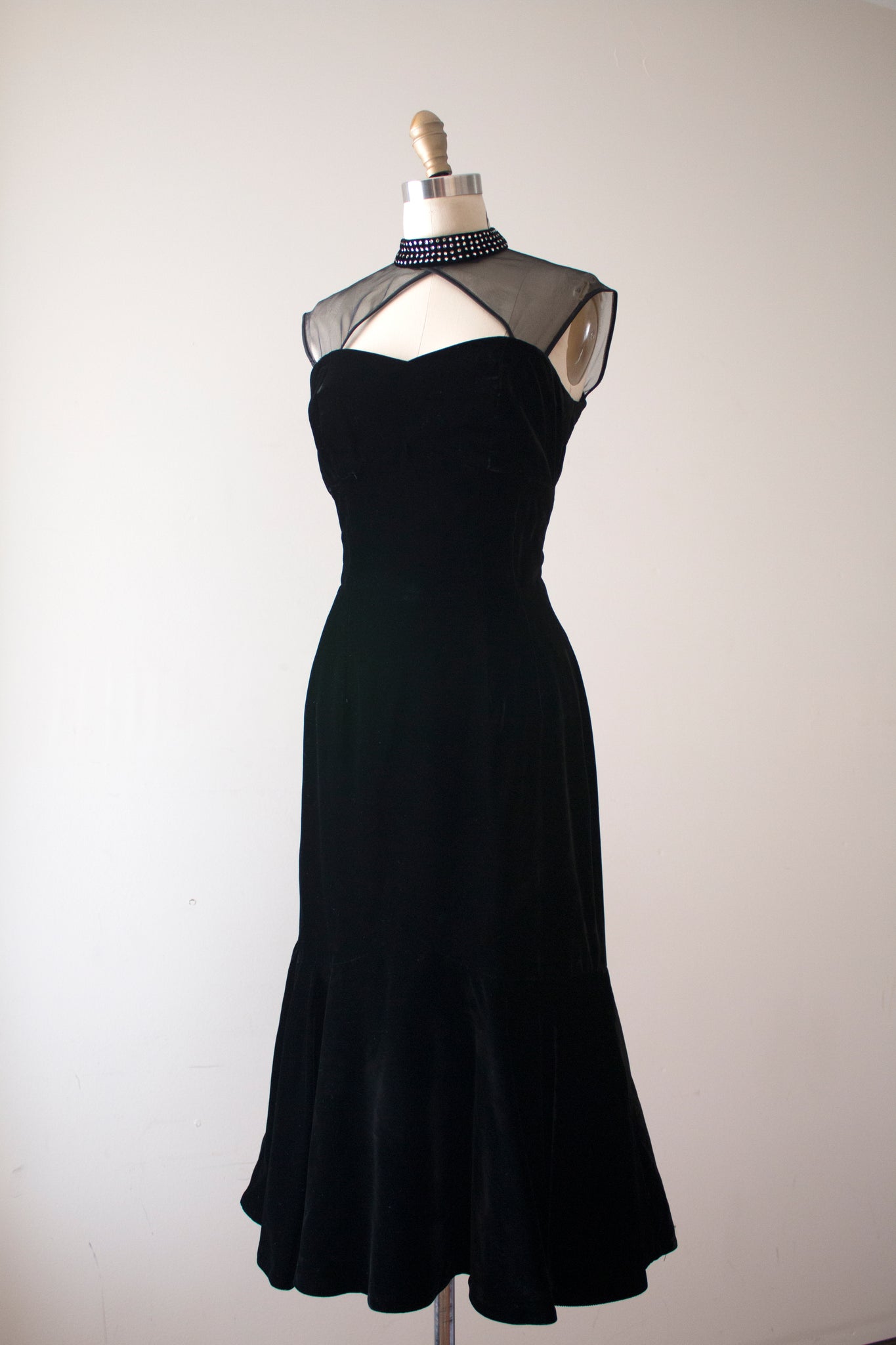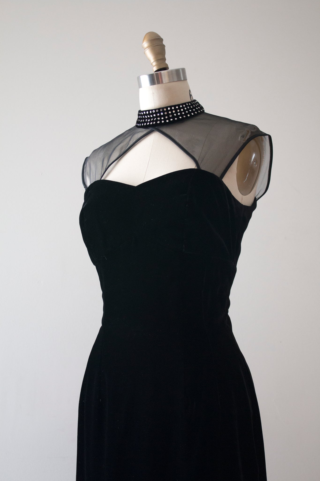 Very unique black velvet VIXEN evening dress from the late 1950s. This dress features a bombshell silhouette with a fish tail hem, and the most unique part; that mesh shoulder velvet rhinestone incrusted COLLAR! SO GOOD