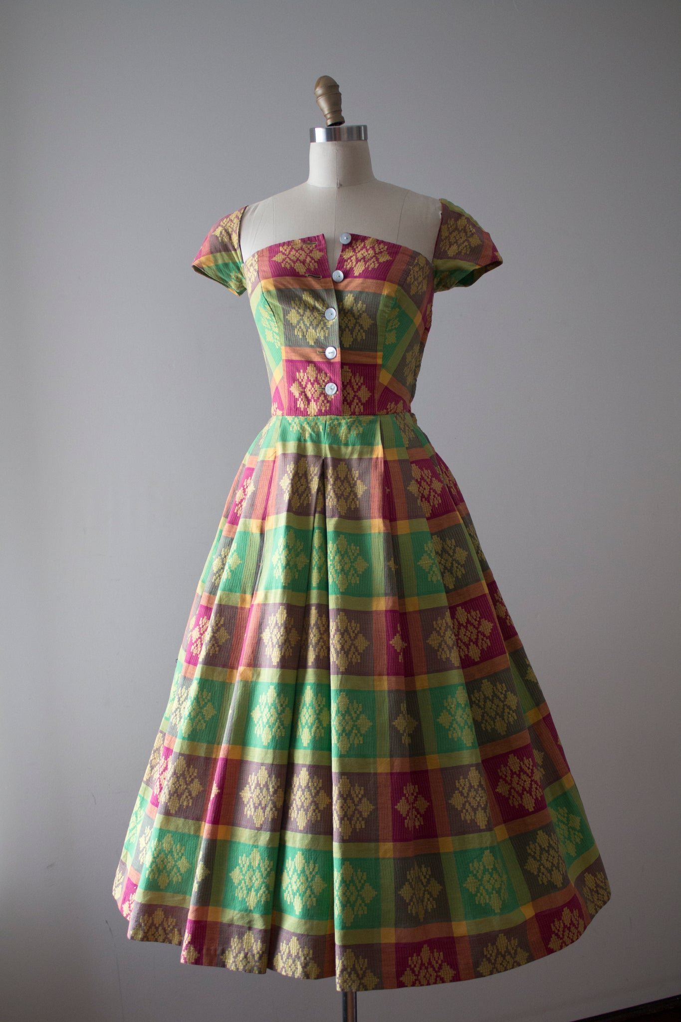 INCREDIBLE 1950s designer thick cotton dress. This dress features a stunning vibrant print and fabric. It has a fitted waistline and full skirt. The top does button all the way up the top but was too small for the dress form. I personally think it would look so good with it open like that but may require some boning hidden underneath to hold it up if you decided to style it like this.