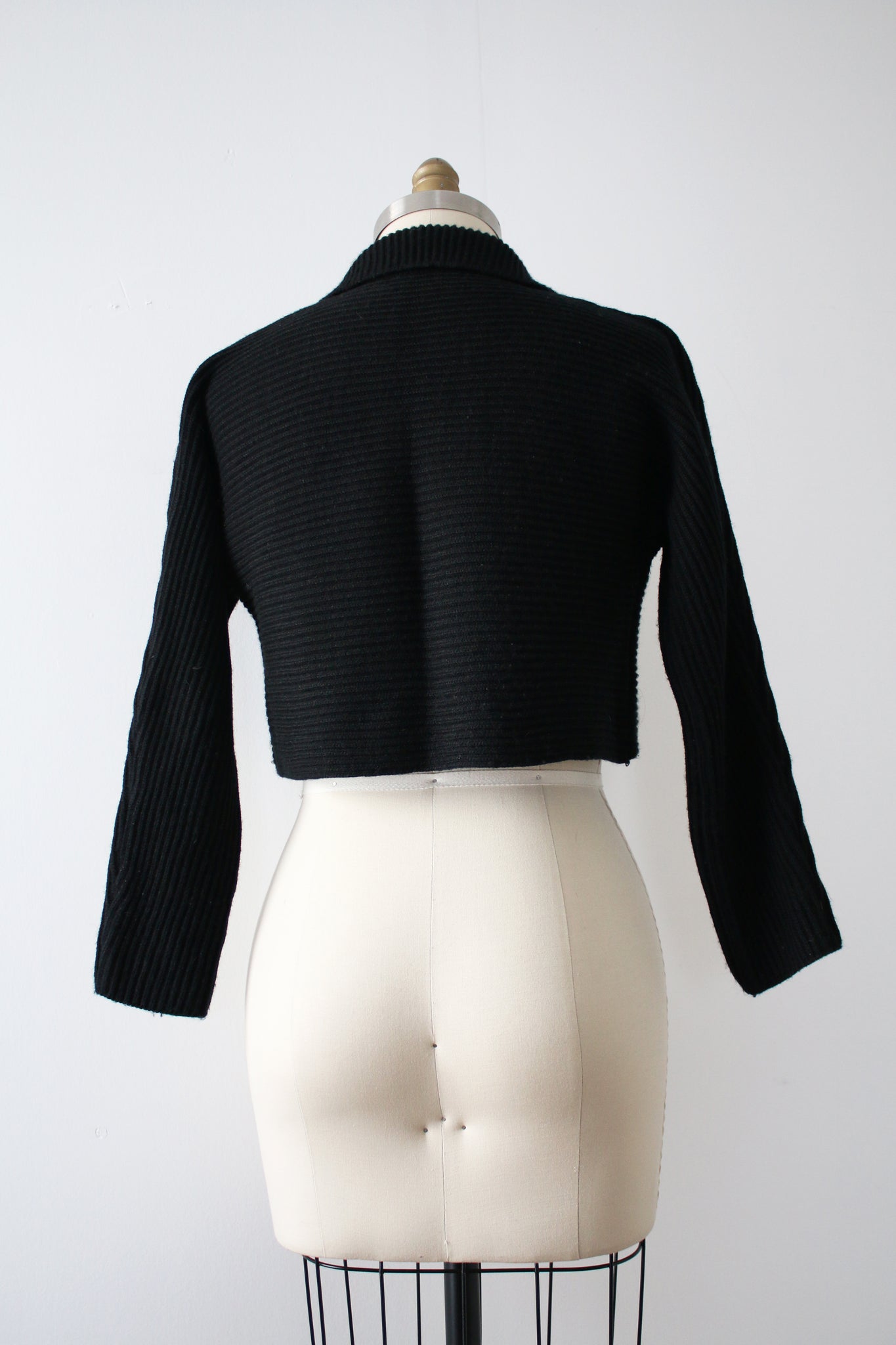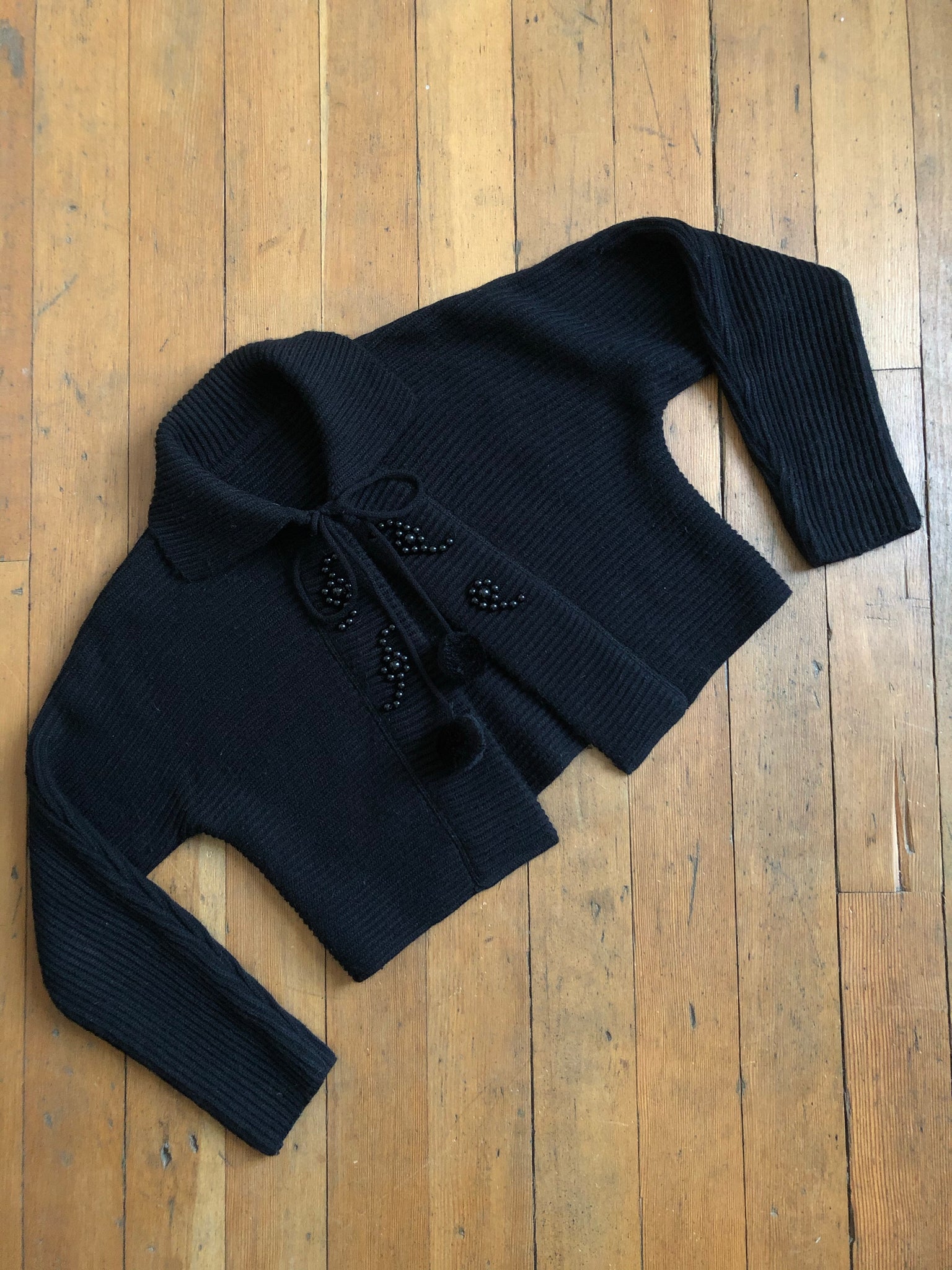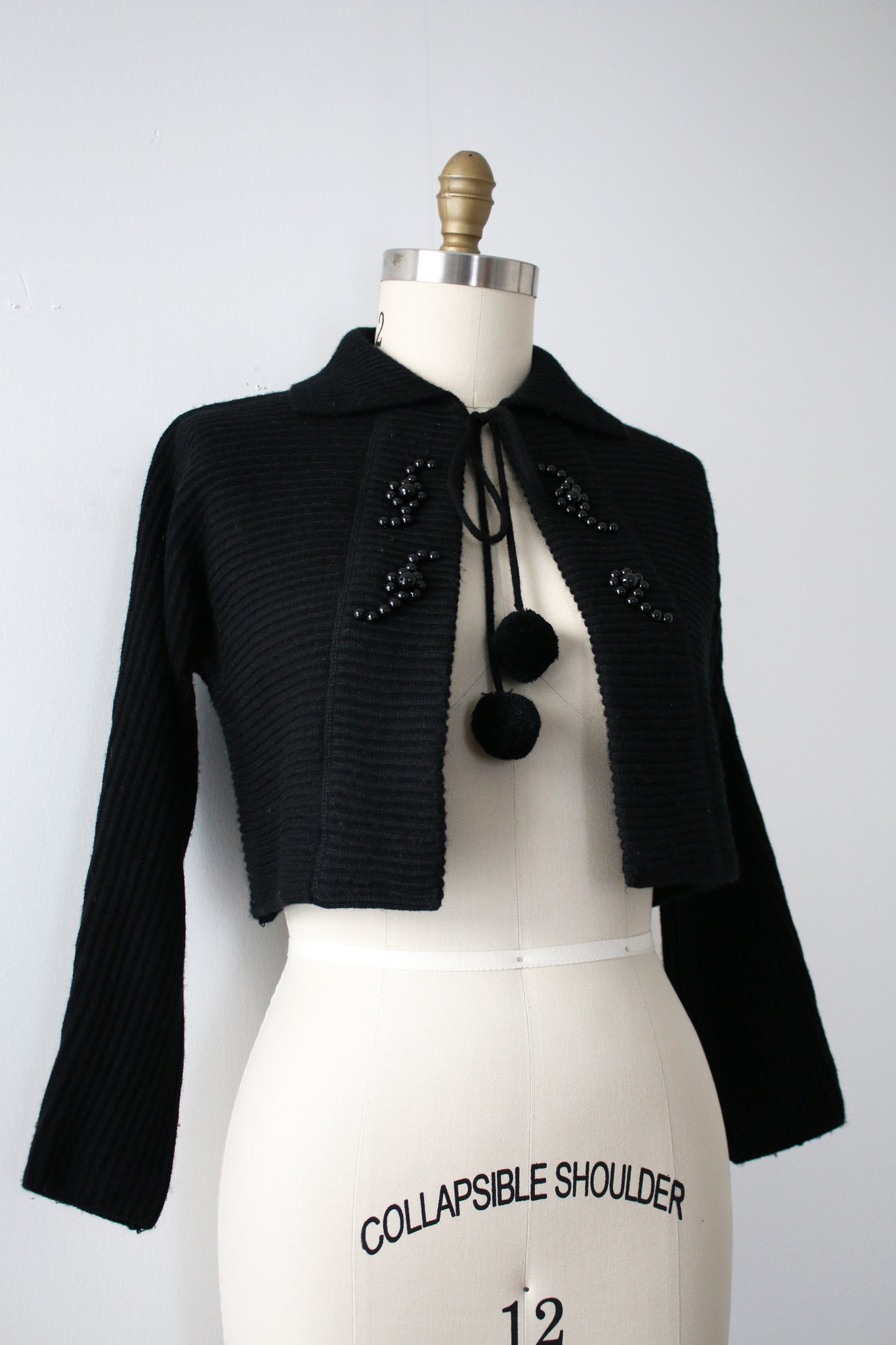 Super adorable chunky knit cotton cardigan bolero style sweater from the 1950s. This jacket features big beads on the front, and a cute pom pom neck tie.