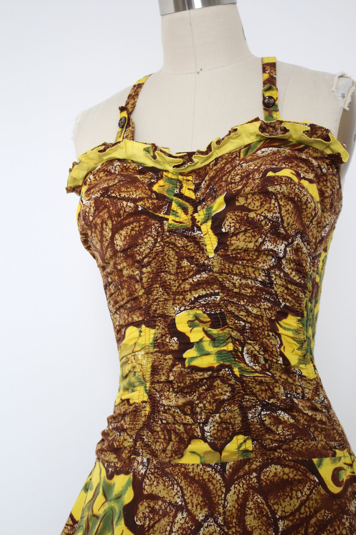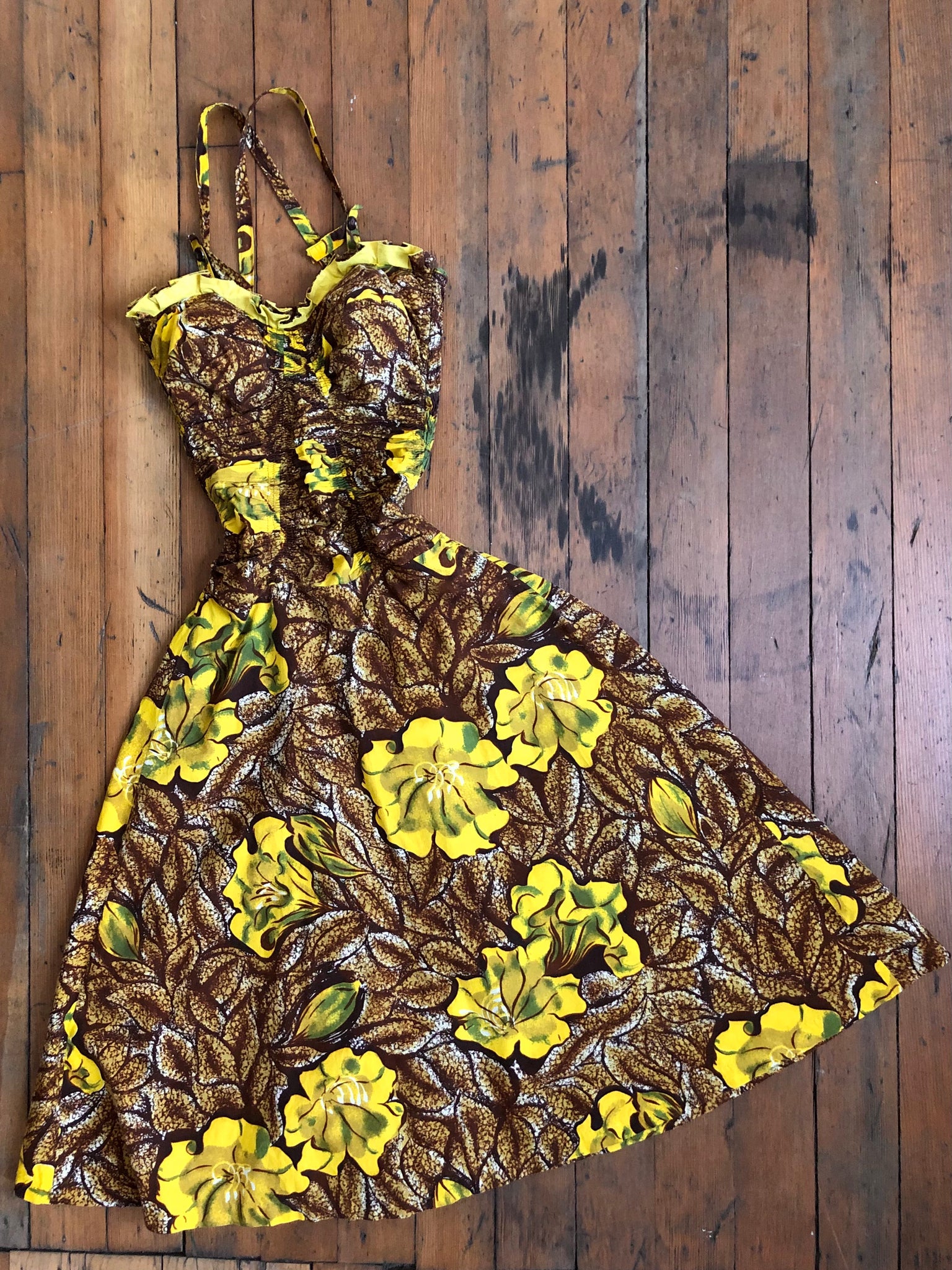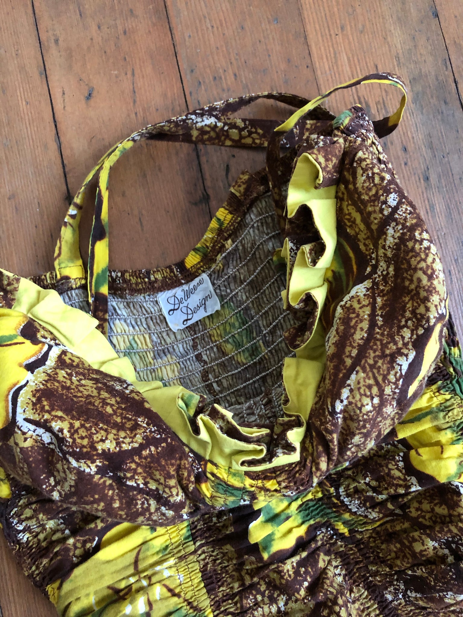 An early De Weese cotton sun dress from the 1950s! What a stunner!!! Lots of elastic smocking so there's lots of room for movement! No zipper.