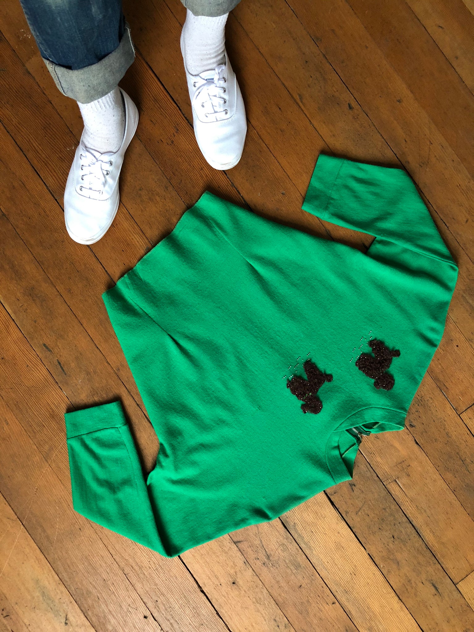 The most adorable green wool sweater from the 1950s with fuzzy poodles!!!