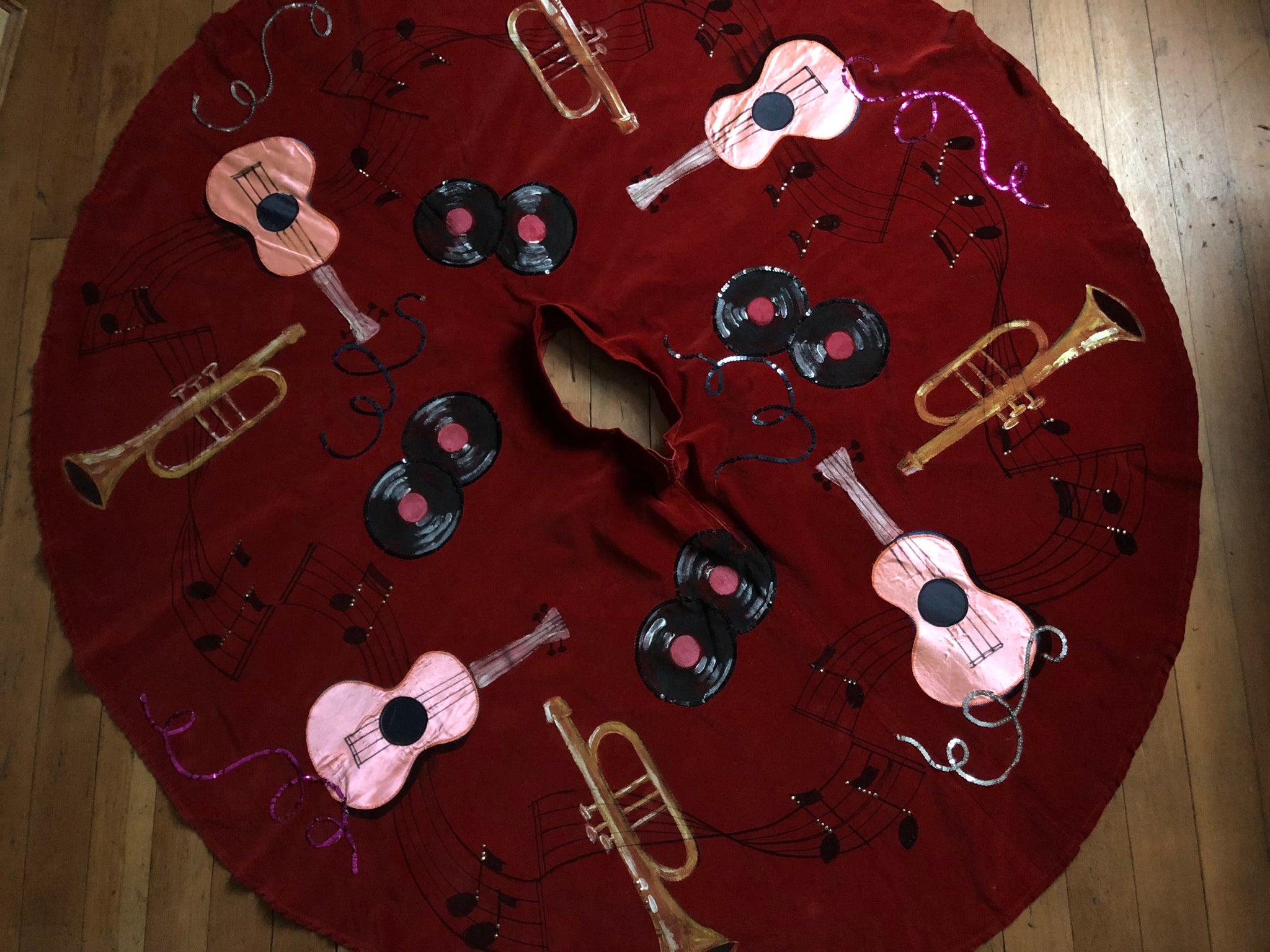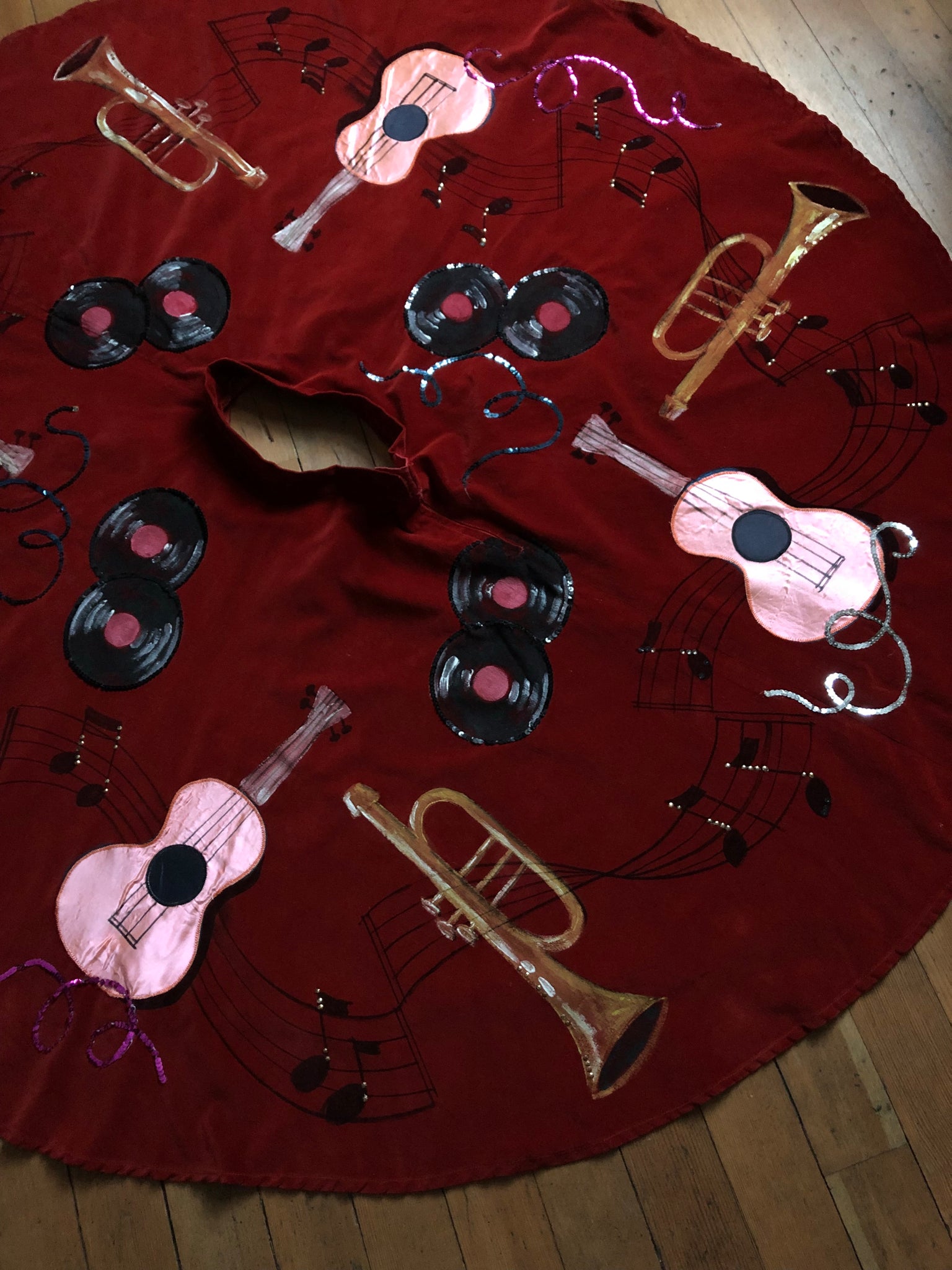 Anyways; it does NOT take away from how incredible and special this piece is in any way!! This skirt is a full circle with a lining underneath. It is HAND PAINTED with guitars, music notes, trumpets, etc! It is absolutely fantastic. It is a velvet or velvet like fabric. Side zipper. Truly a work of art!!!