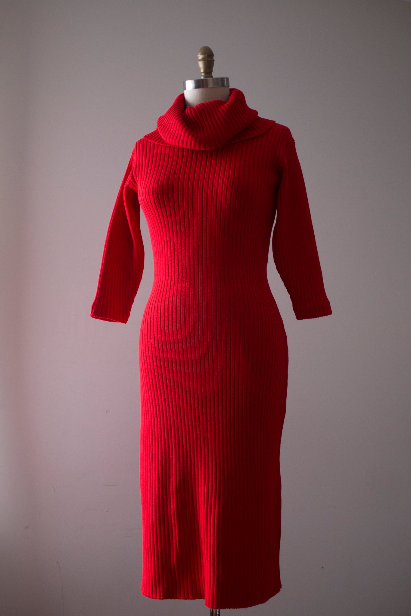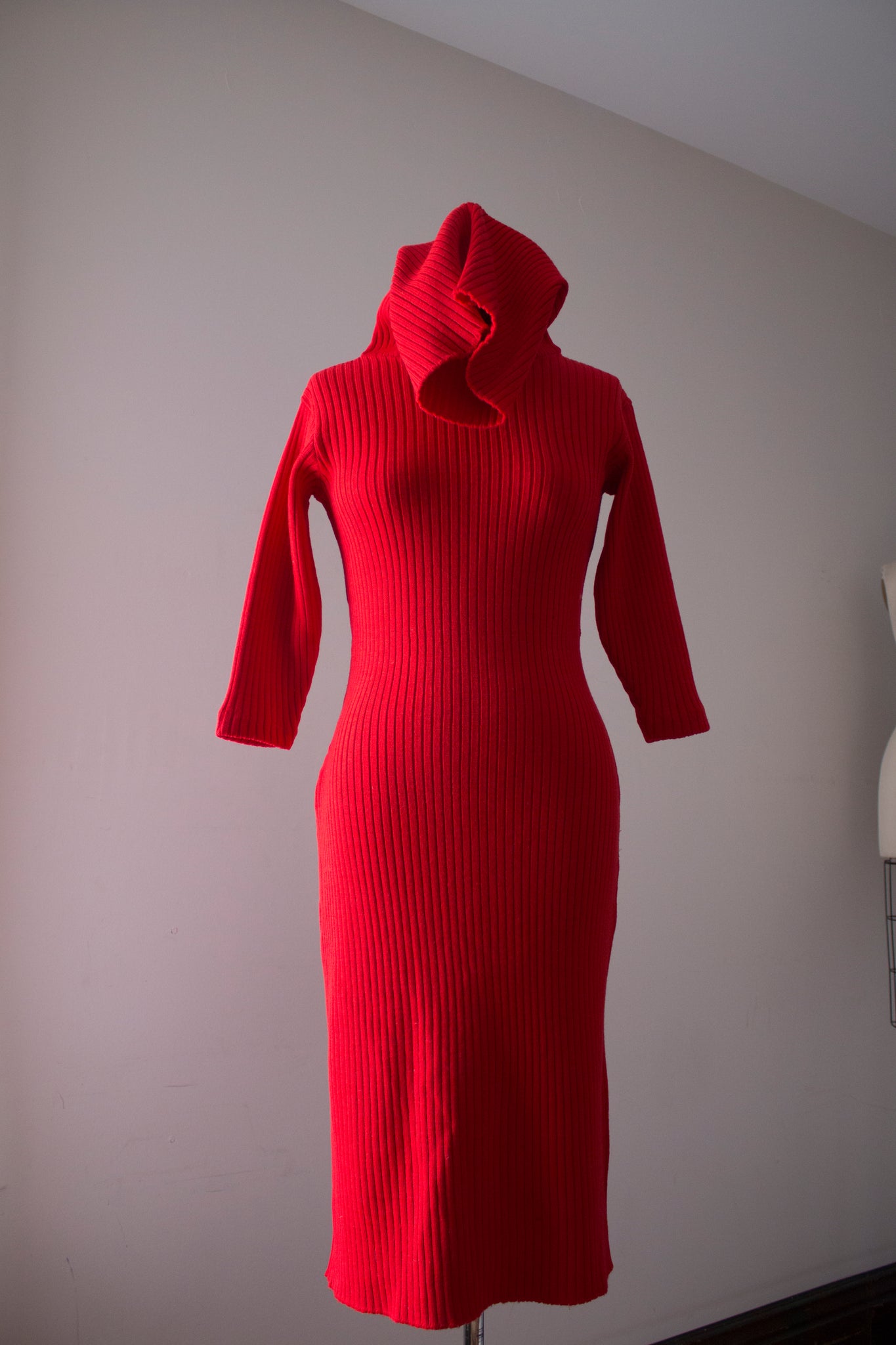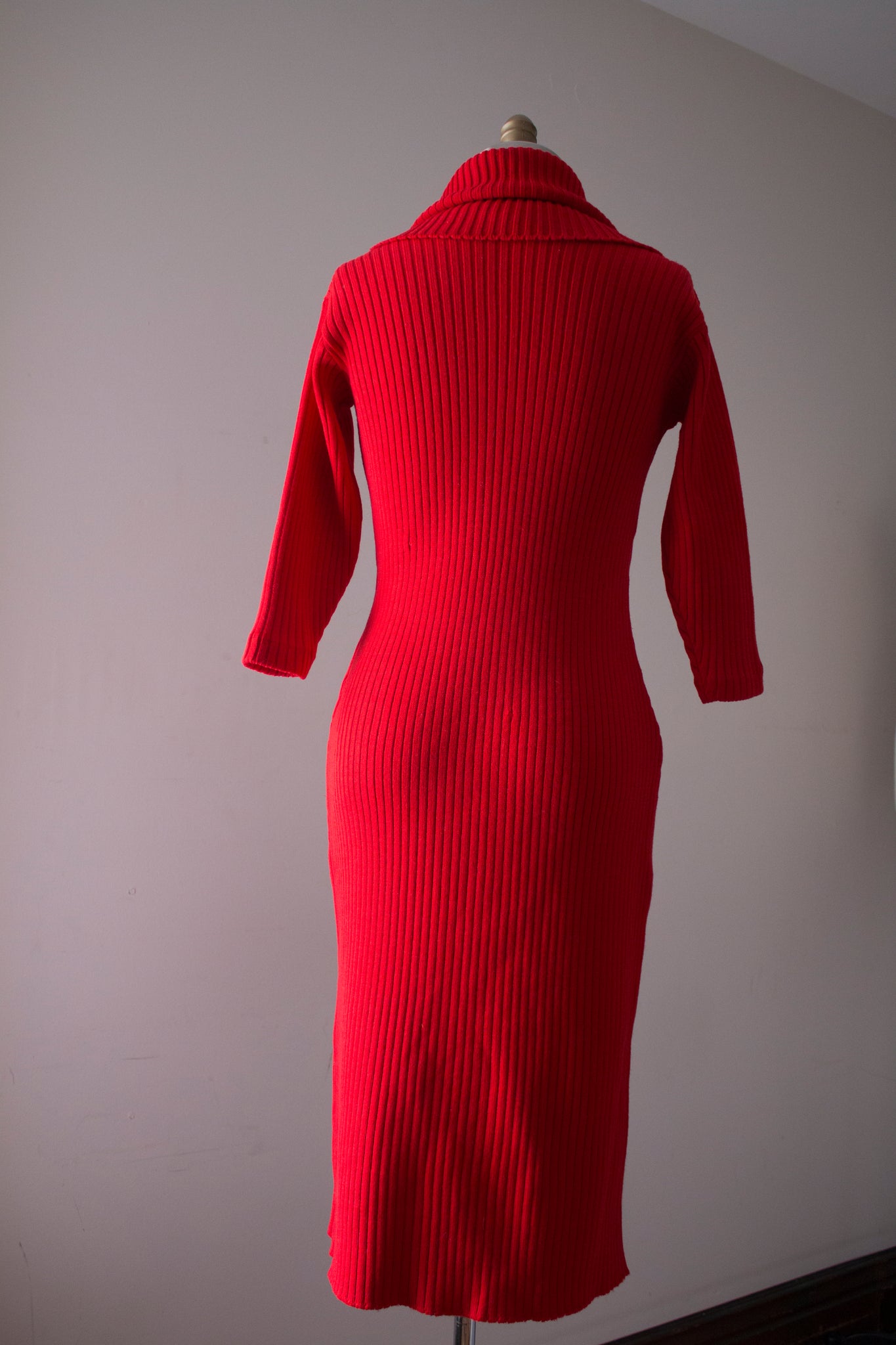 RARE and seriously INCREDIBLE red knit dress by designer Susan Small from the 1950s. This dress features a bombshell silhouette - very flattering on with the most insane turtle neck detail imaginable!! Check out how oversized it is! There are so many different ways you can style it and set it. It's just SO GOOD!