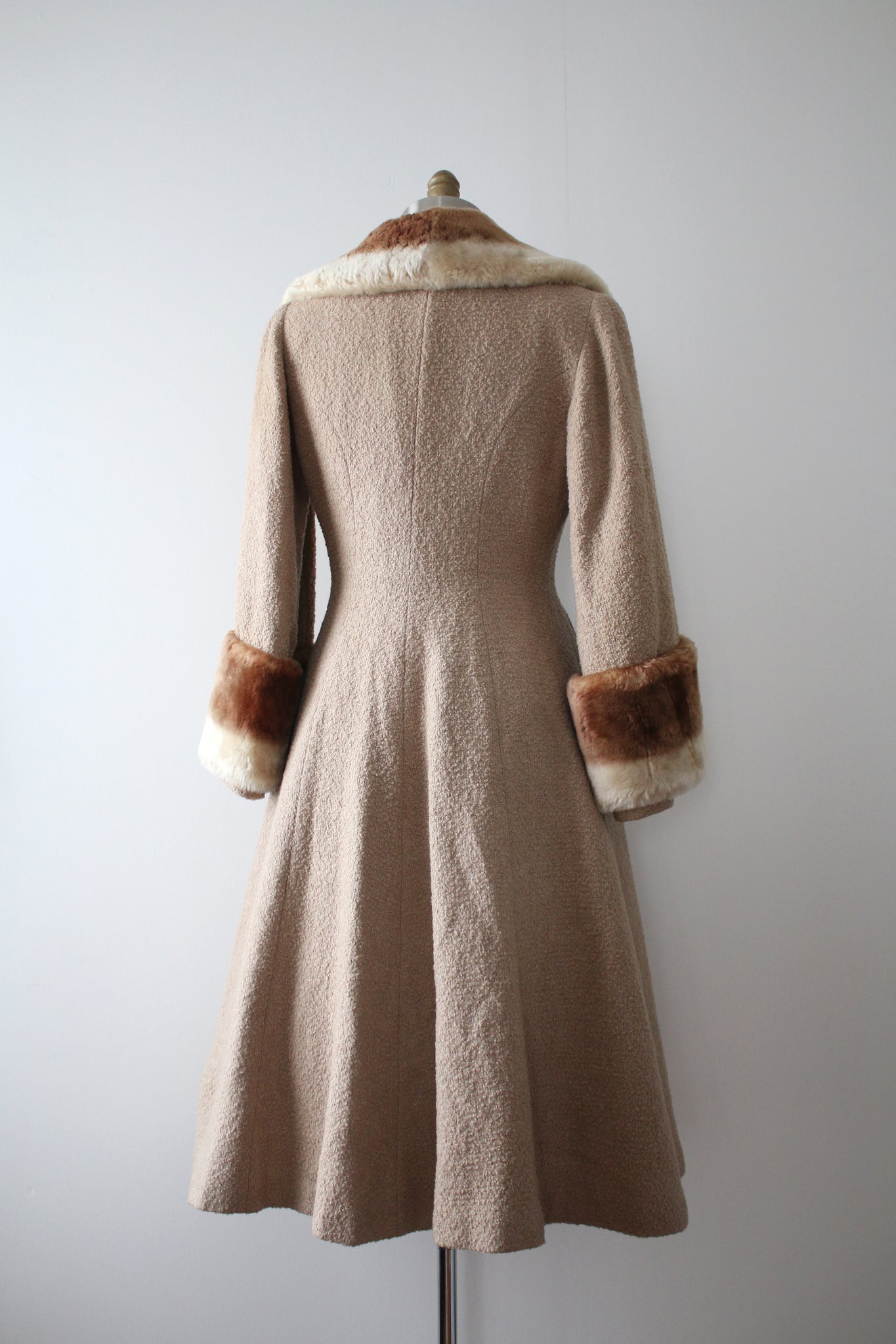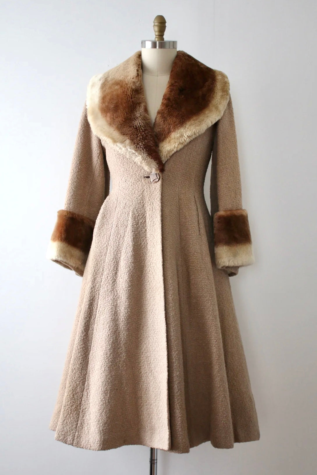 One of the best and most incredible princess coats I've ever come across! Gorgeous 1950s wool coat with oversized faux fur collar and cuff details. One singular button closure at the waist. Lined and has pockets.