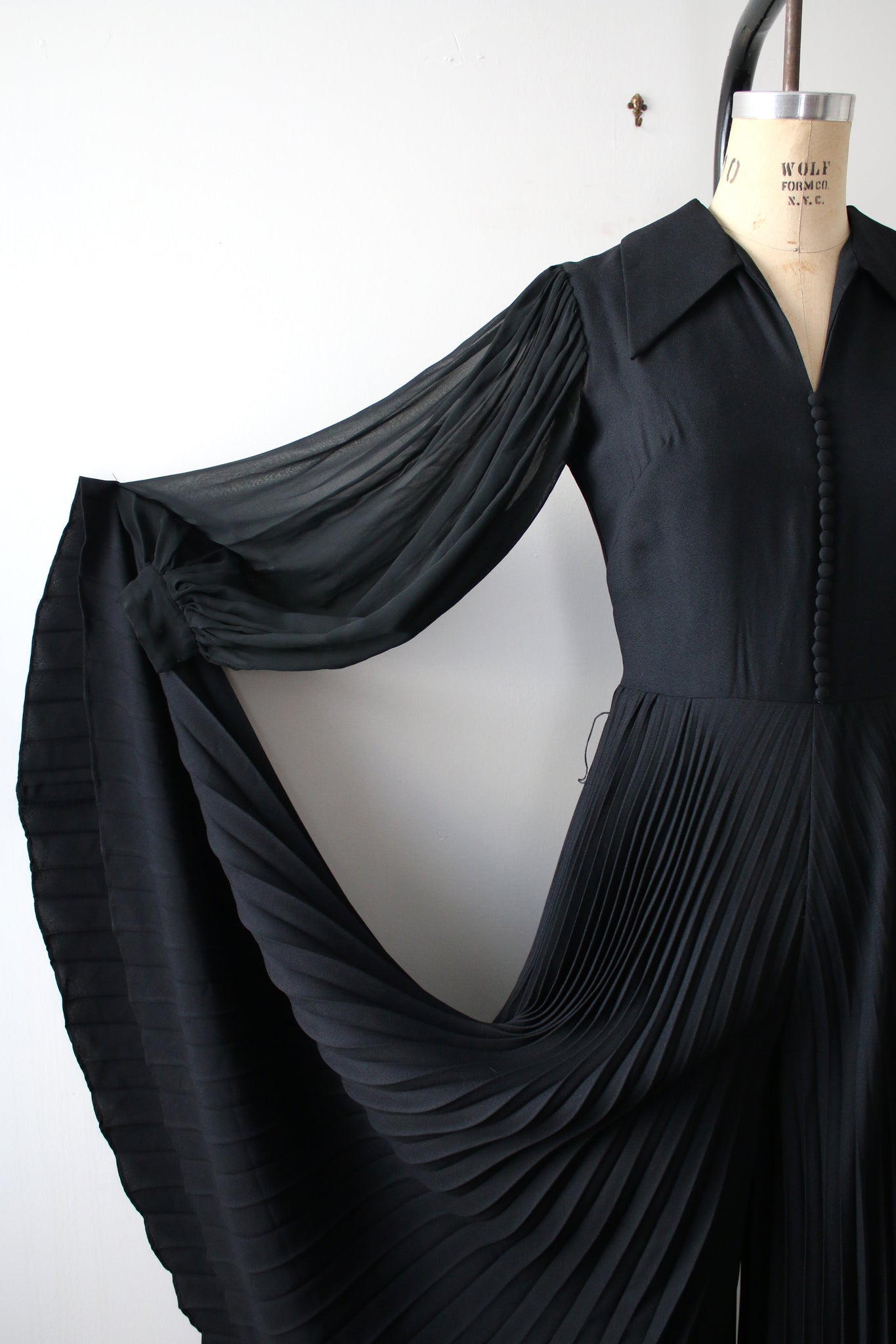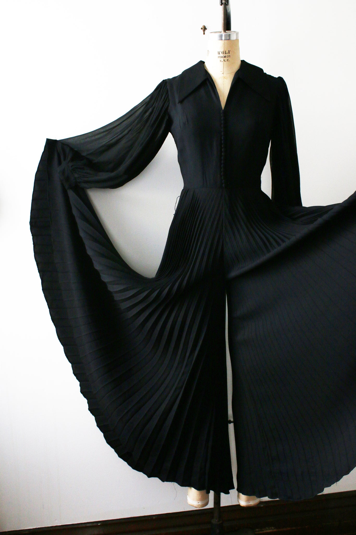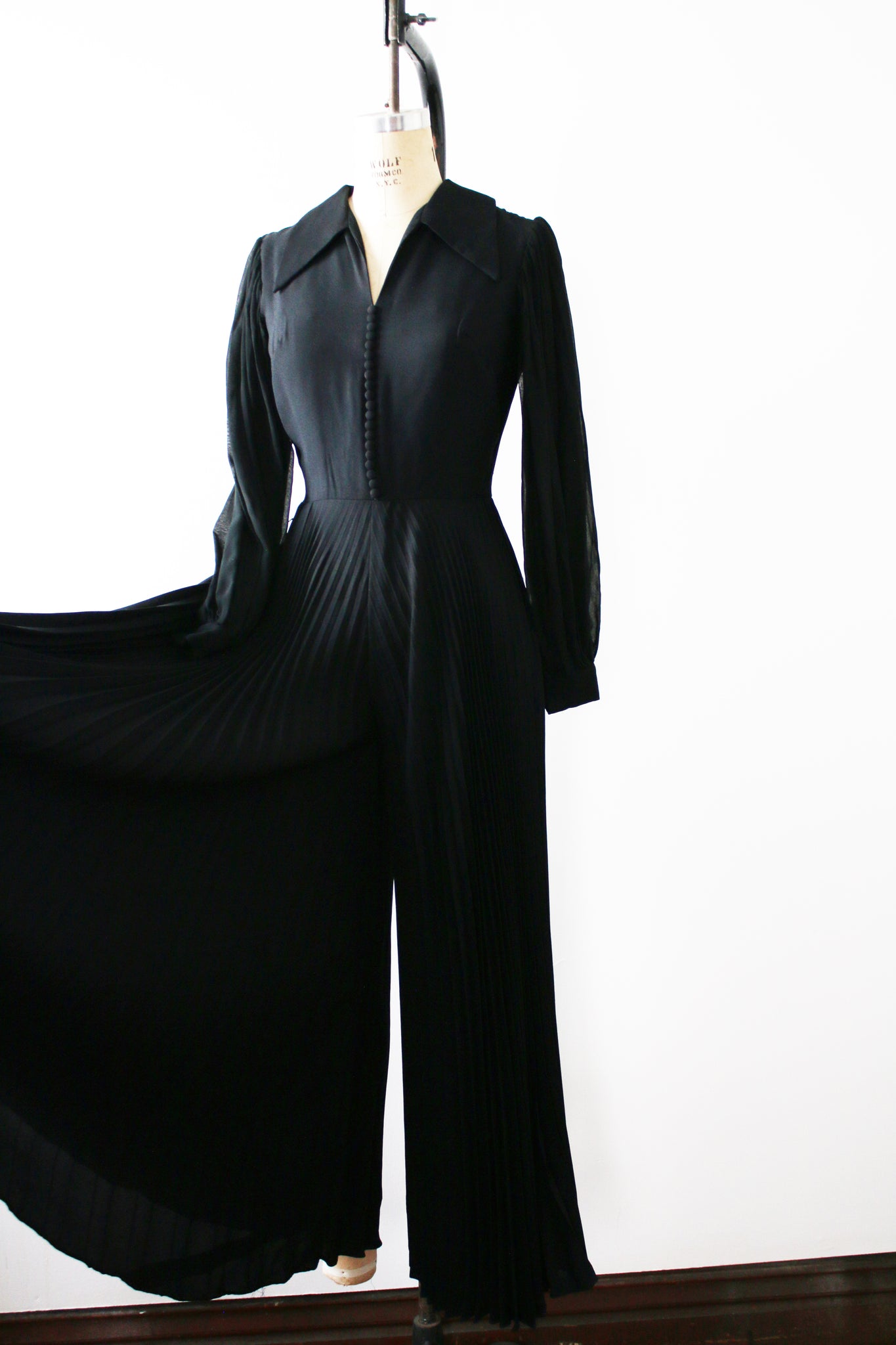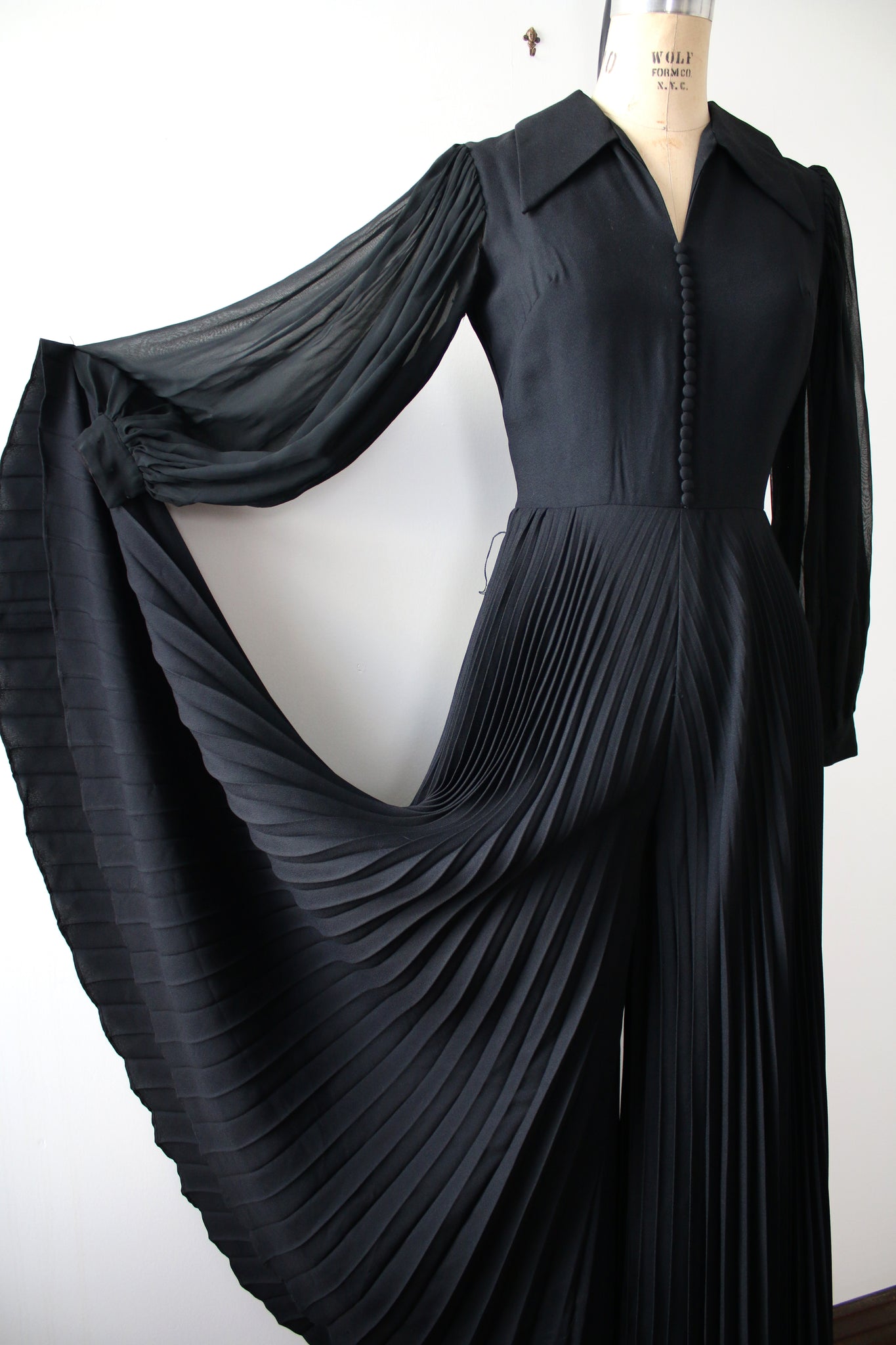 The most extreme black jumpsuit I've ever come across from the early 1970s! Where do I start??? It has a wonderful bodice with faux buttons up the front and a big collar, then a fitted waistline, then very dramatic oversized pant legs as well as sheer billowy sleeves! Metal zipper up the back. It's just perfection!!!!