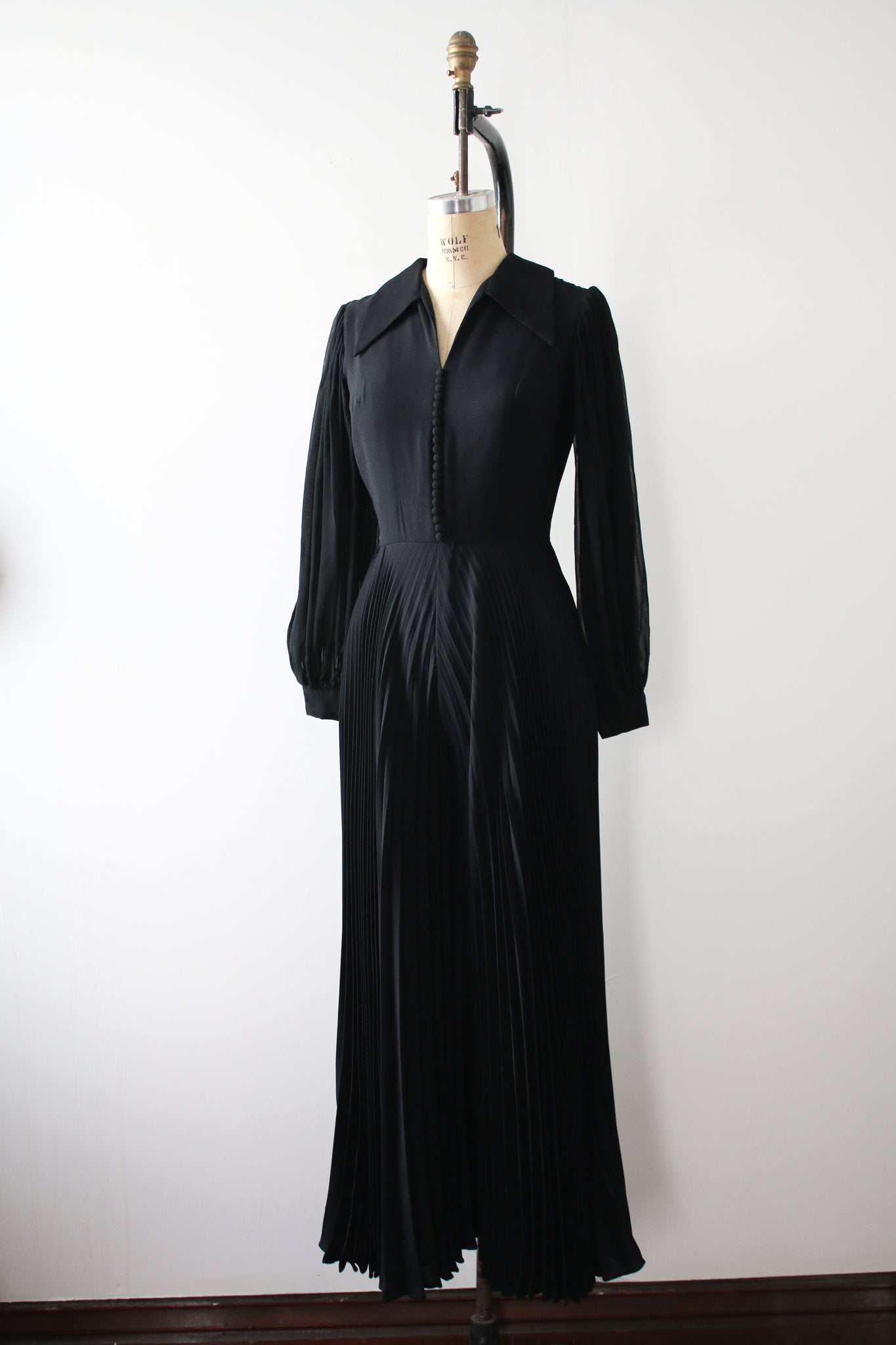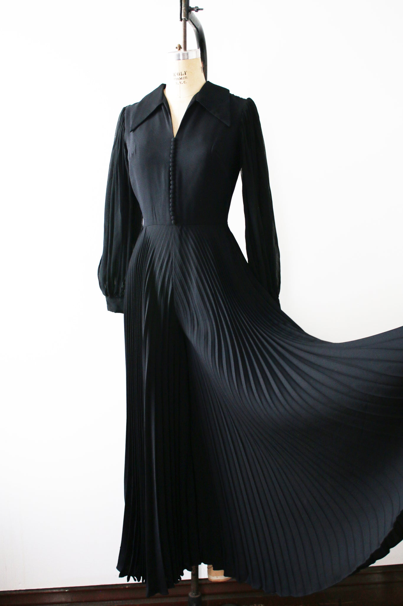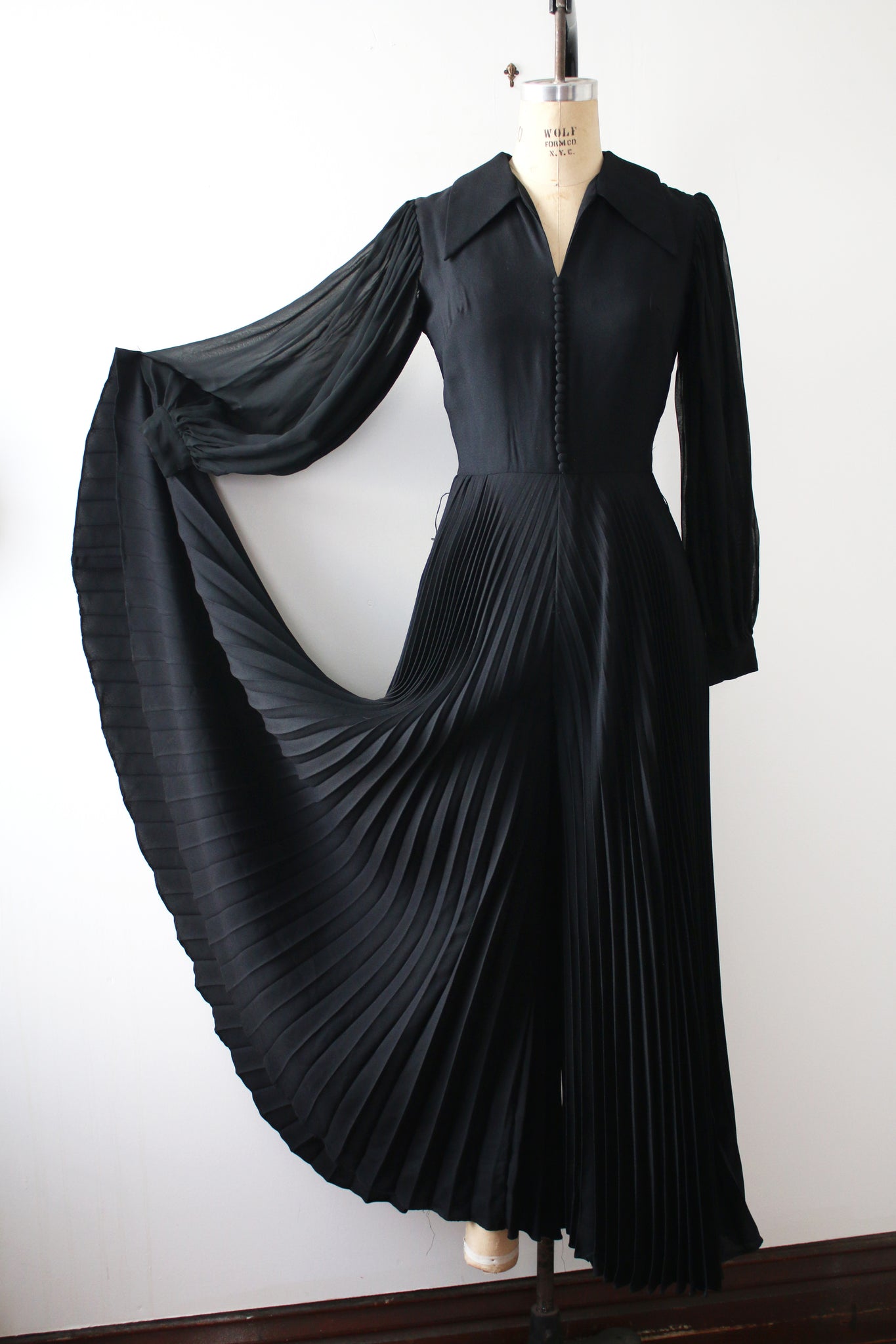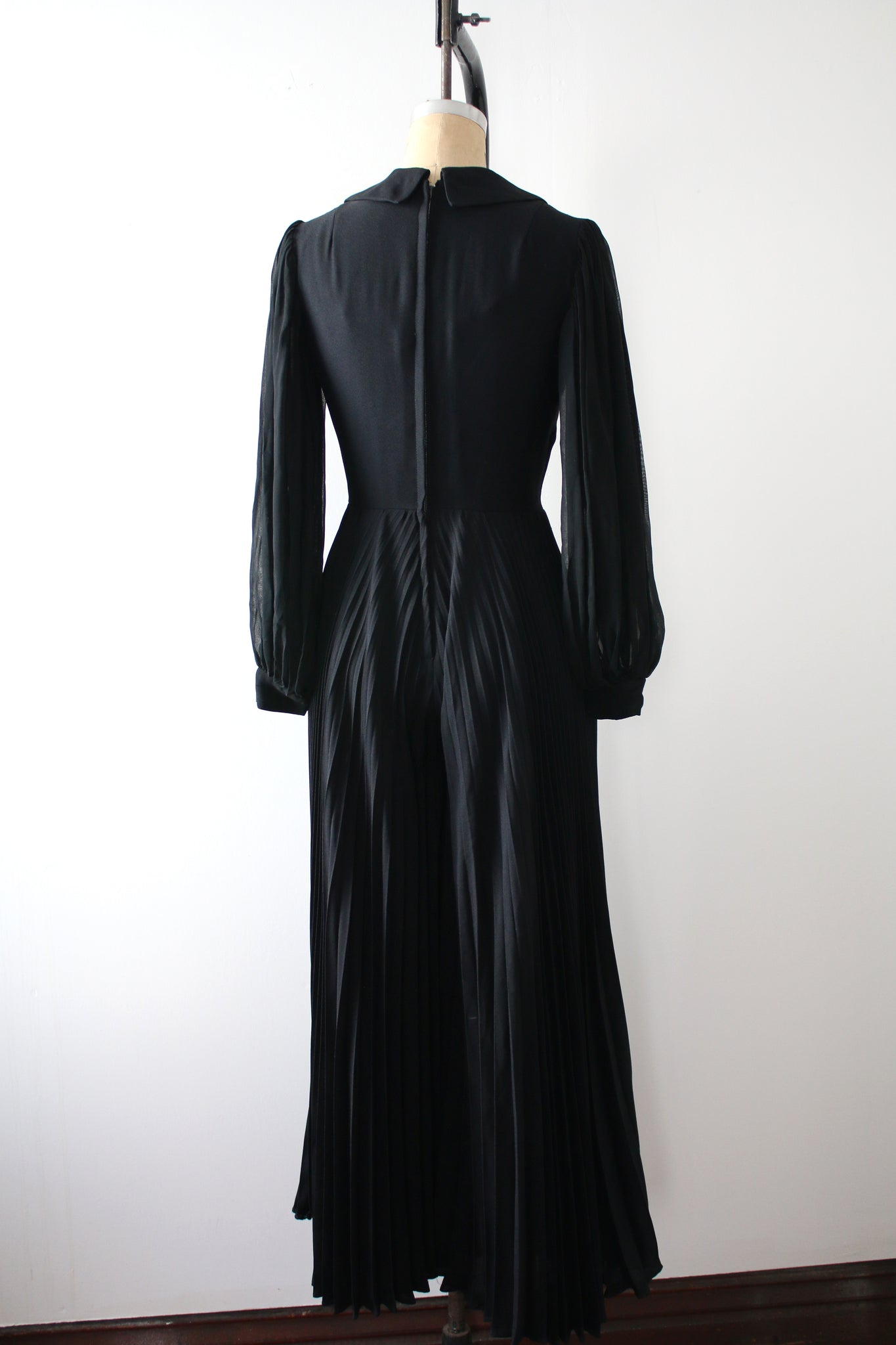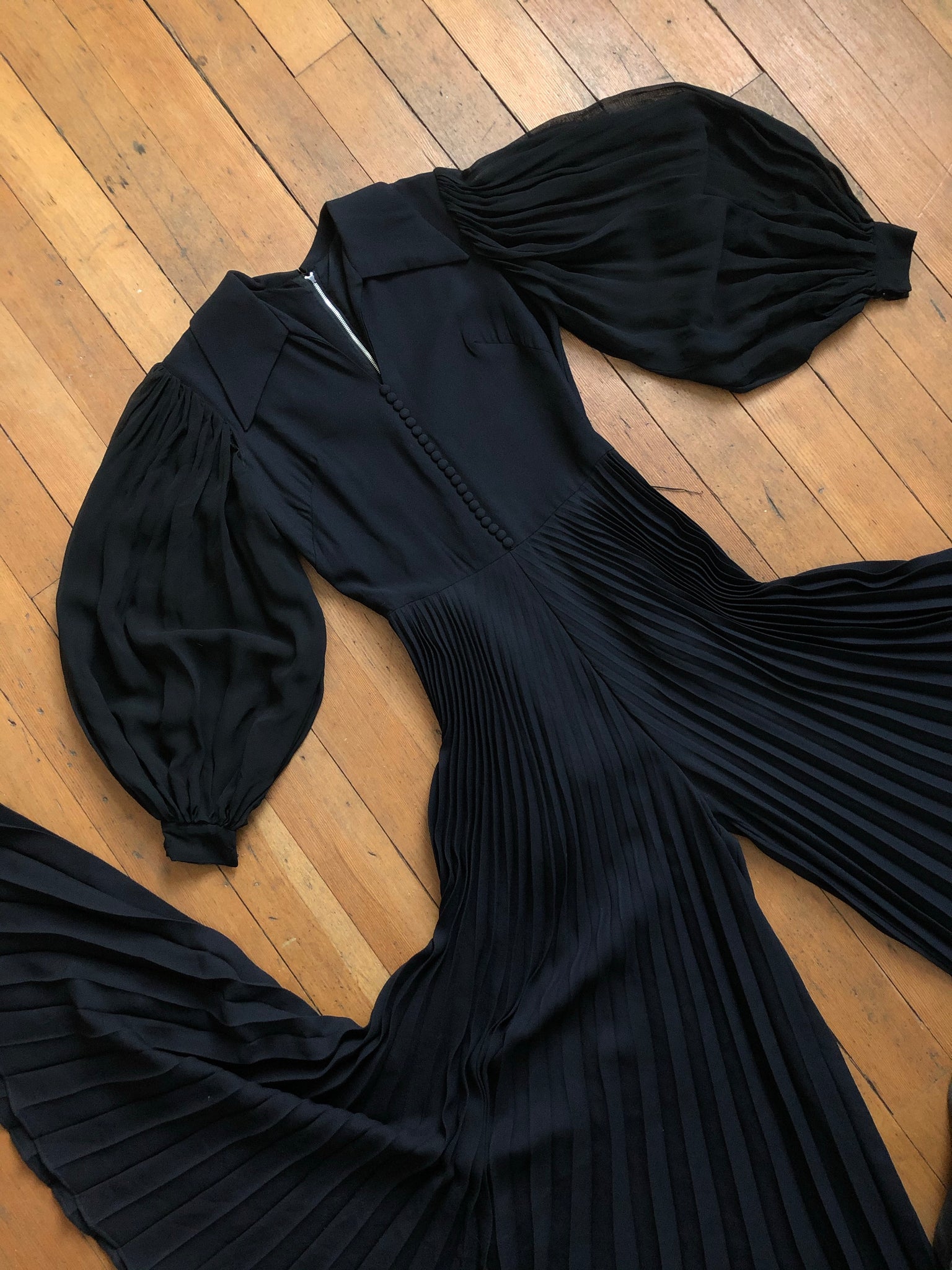 The most extreme black jumpsuit I've ever come across from the early 1970s! Where do I start??? It has a wonderful bodice with faux buttons up the front and a big collar, then a fitted waistline, then very dramatic oversized pant legs as well as sheer billowy sleeves! Metal zipper up the back. It's just perfection!!!!