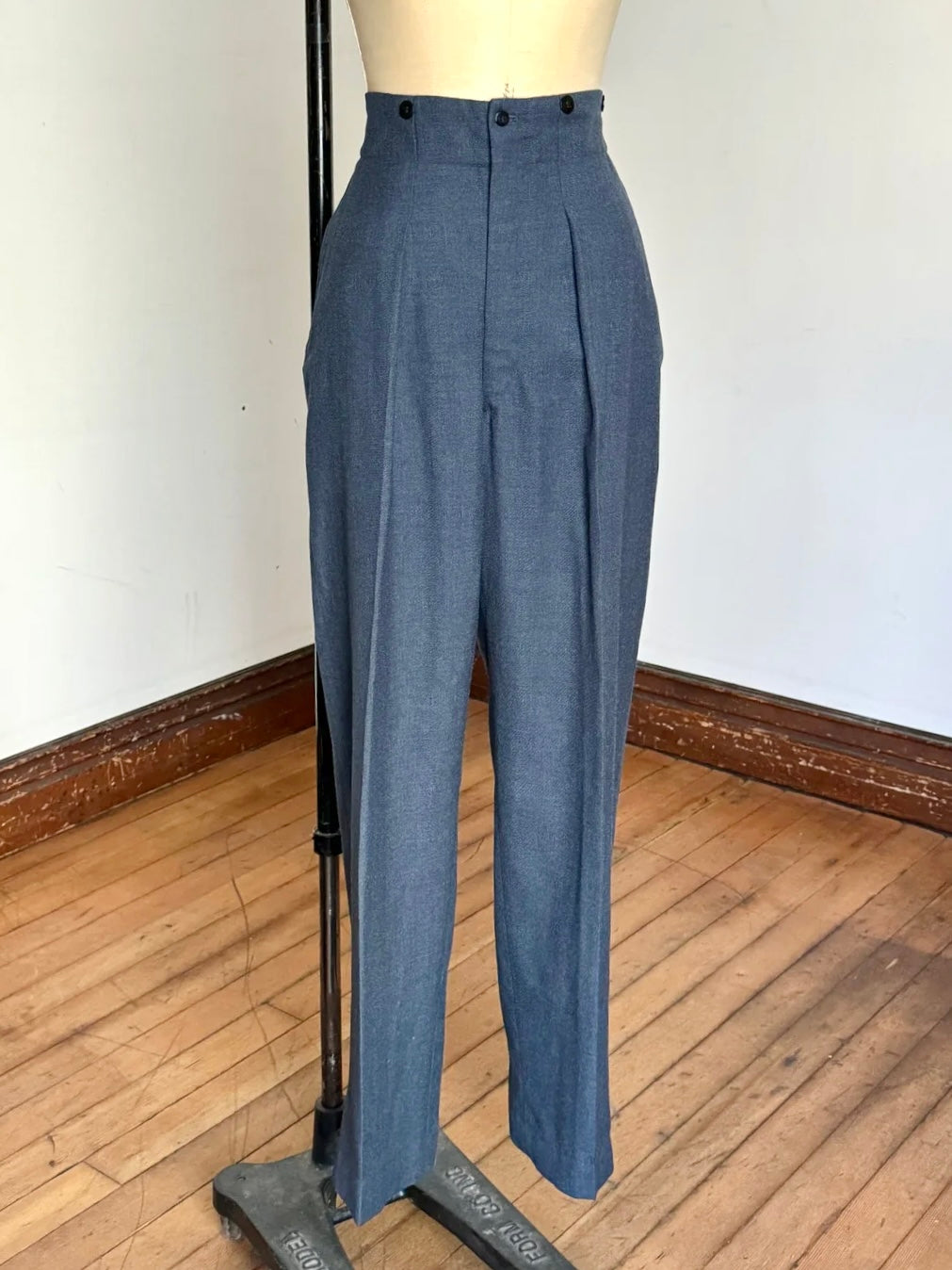 hard to find extra high waisted casual trousers from the 1950s. these features a cool button along the upper waistline detail where the belt is supposed to fit underneath with no belt loops.