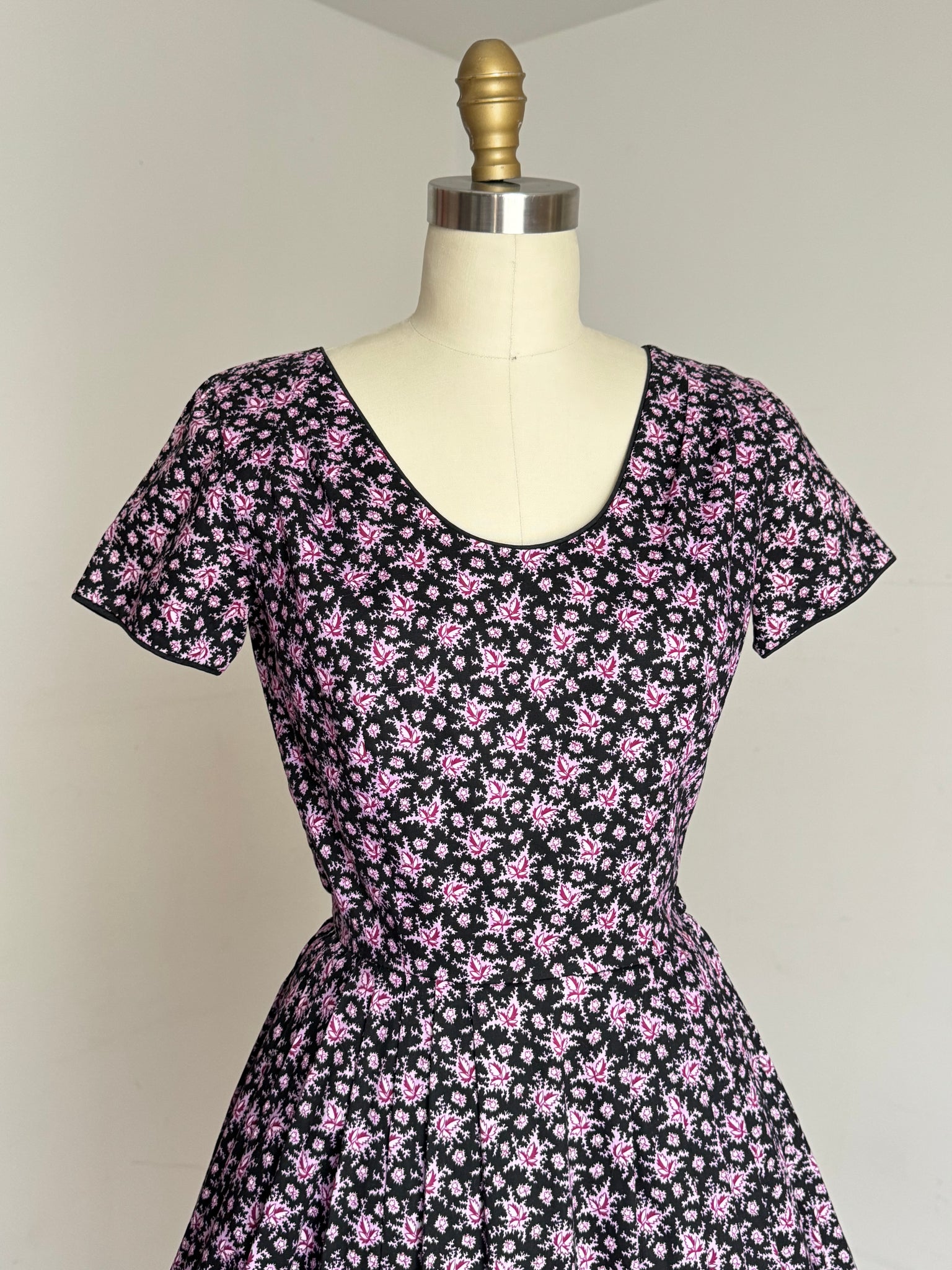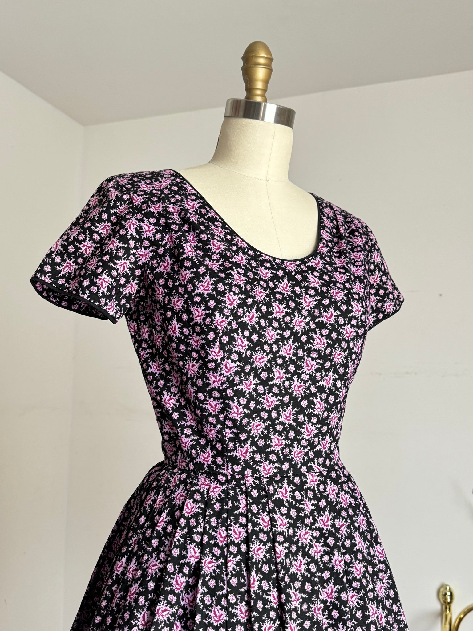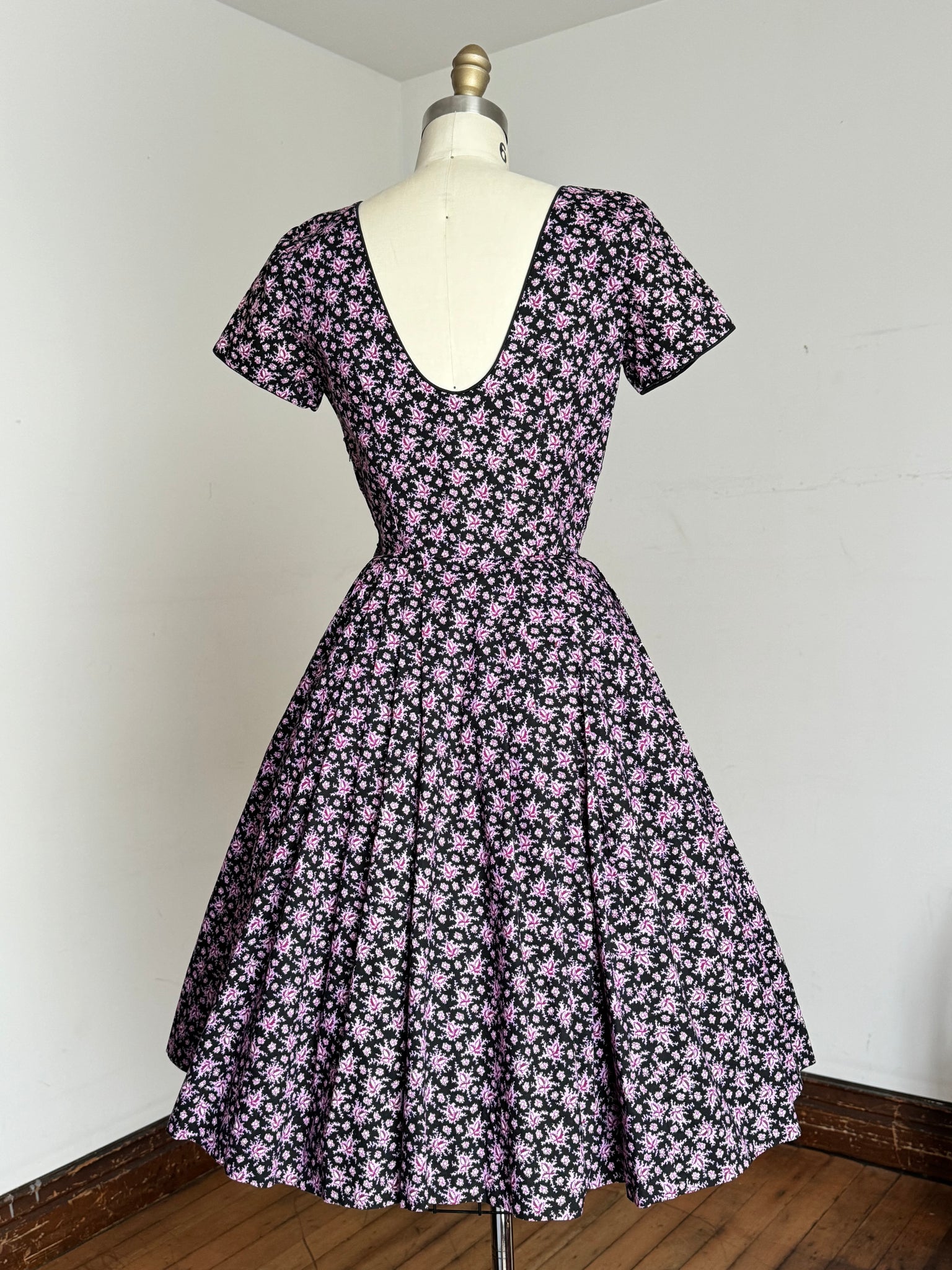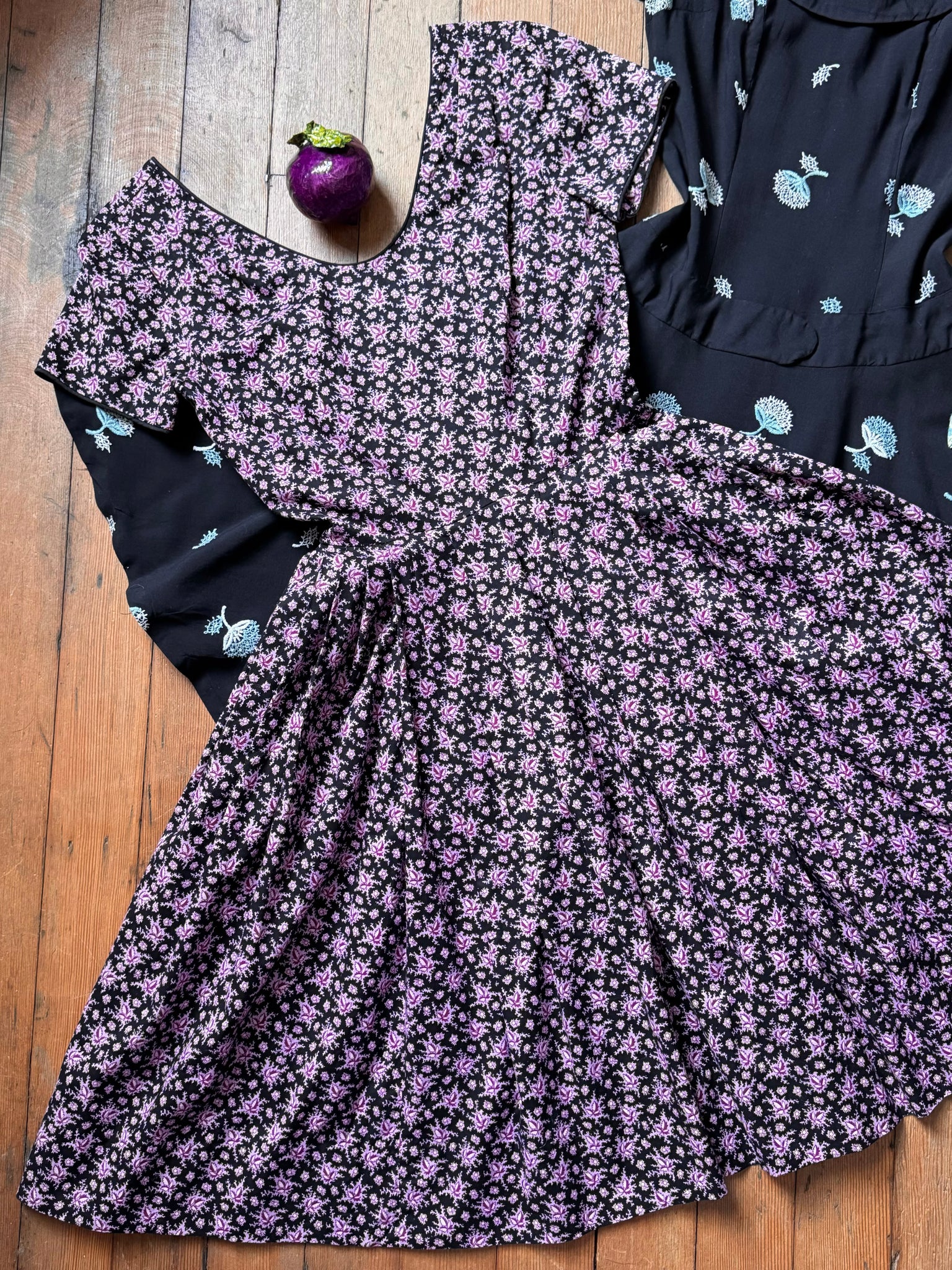 Gorgeous black and purple floral cotton dress from the 1950s. Metal zipper.