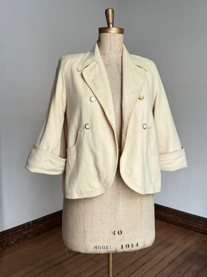 Fantastic creamy wool shortie cropped swing coat from the early 1950s. Meant to be worn open in the front. It is lined. Has shoulder pads.
