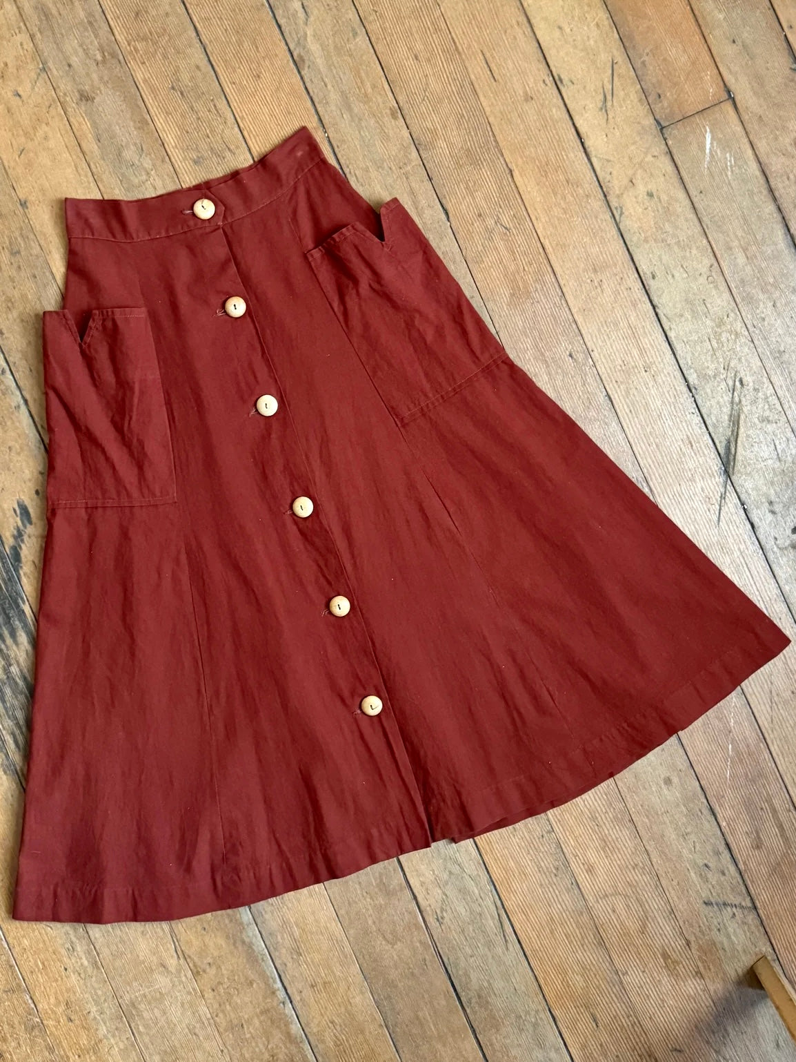 Adorable brown cotton button up skirt from the 1930s / early 40s. This skirt features wood buttons up the front and a fitted waist with big pockets! This is meant as a sportswear skirt that would have been worn over a romper or play set of sorts as shown in the ads I found for these skirts!