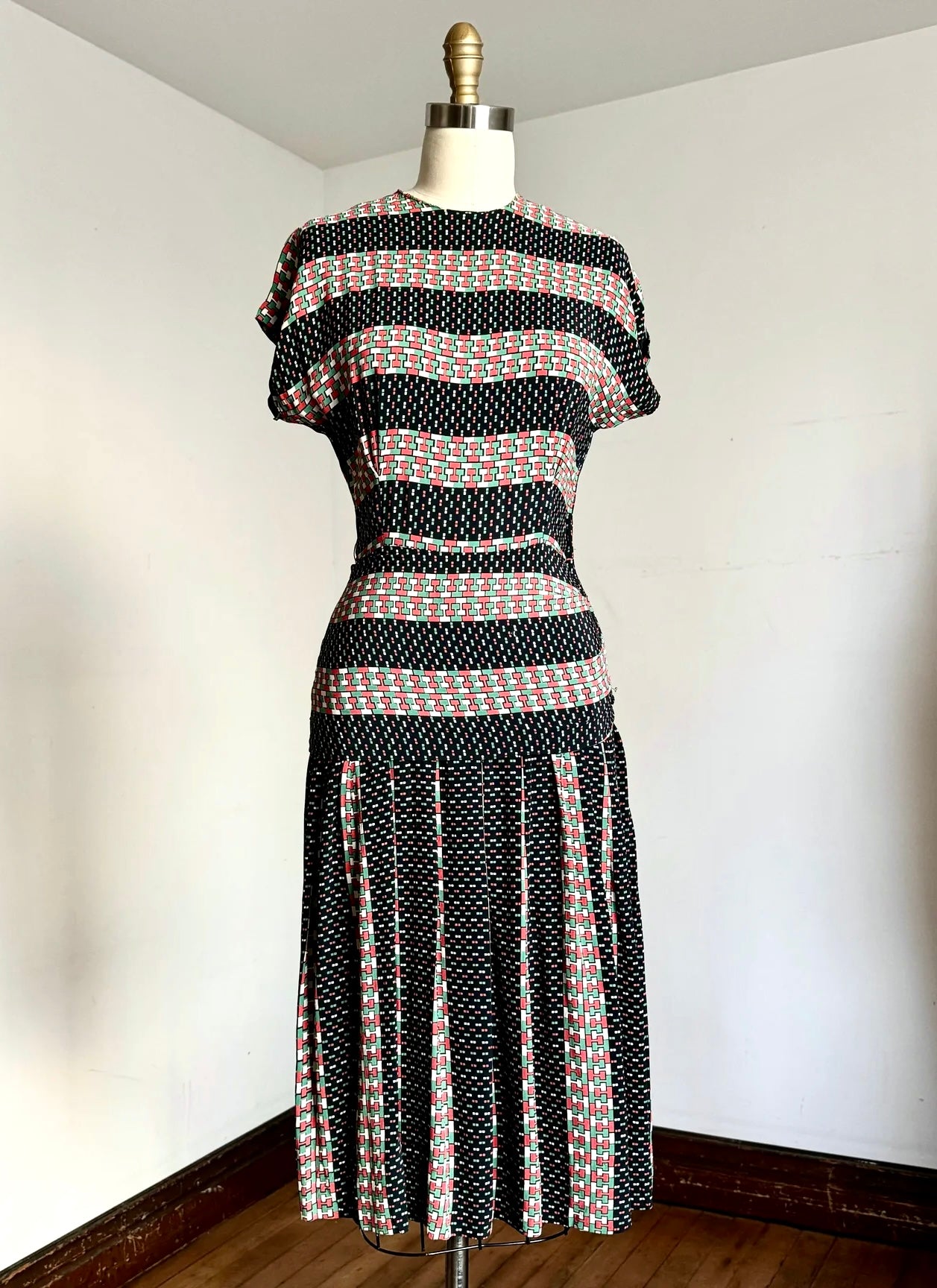 Unique and vibrant abstract print cold rayon dress from the 1940s. It features a neat print, fitted waist, peplum over hip detail, and a pleated skirt underneath. Zip behind neck & on side.