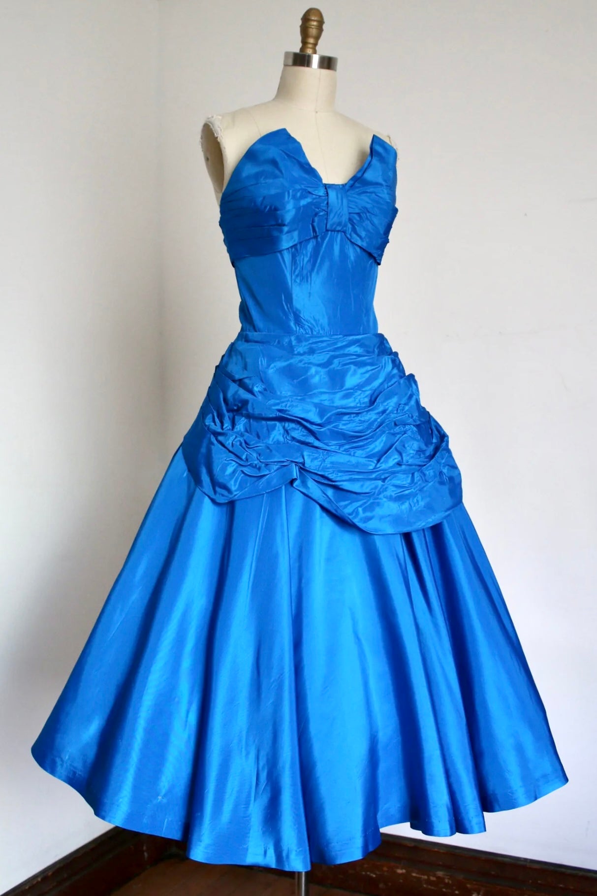 STUNNING jewel tone blue party dress from the 1950s. This dress features a really great bow like bodice, fitted waistline, and a full skirt with a bustle like peplum detail that drapes overtop in an asymmetrical fashion. There's a metal zipper up the back. The color is also a little different in person (even nicer in my opinion!).