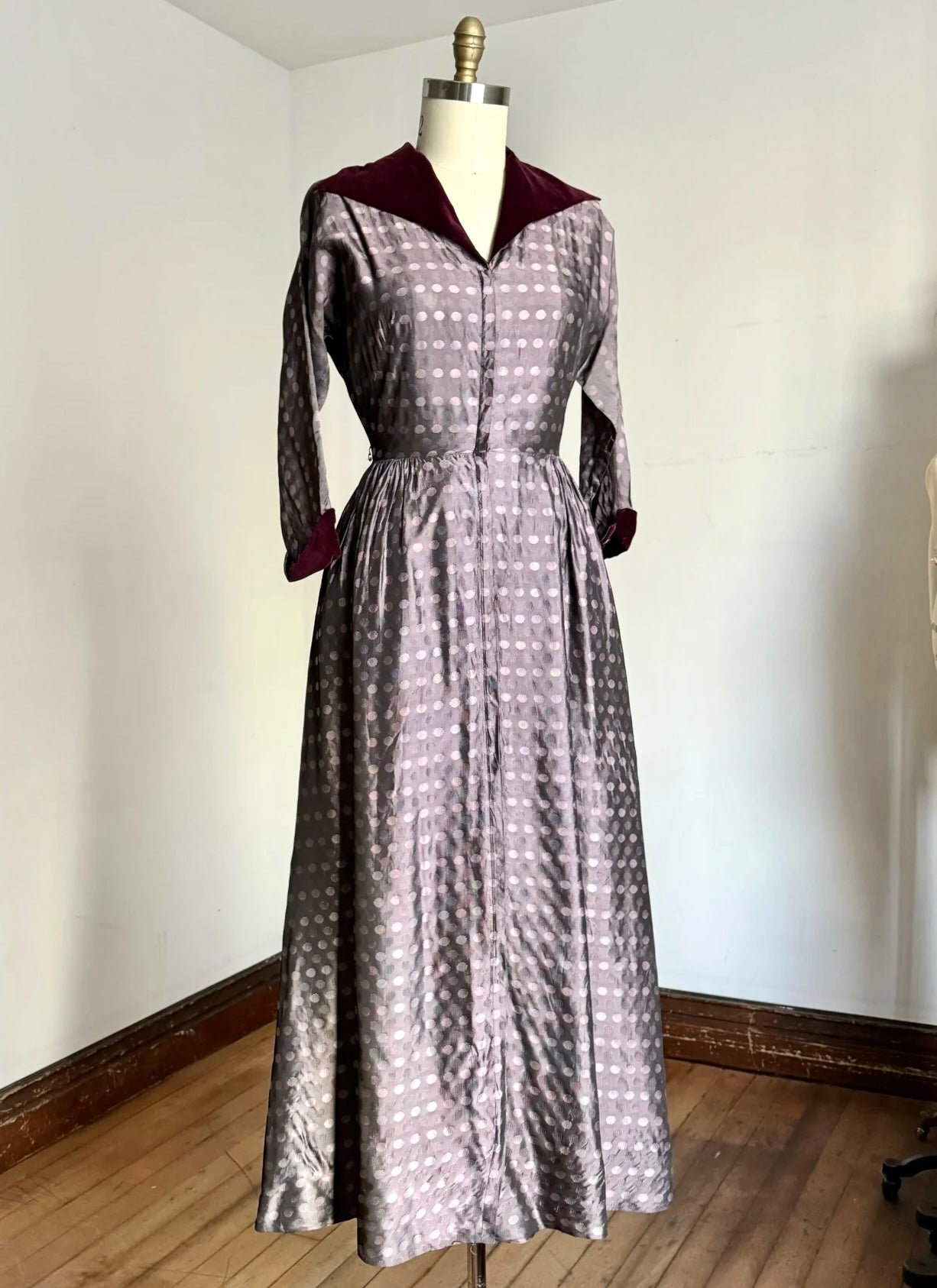 Super cute purple metallic dress from the early 1950s. This dress features a fitted waist, dolman sleeves, open skirt, and a metal zip right up the front! This one also features velvet collar!!