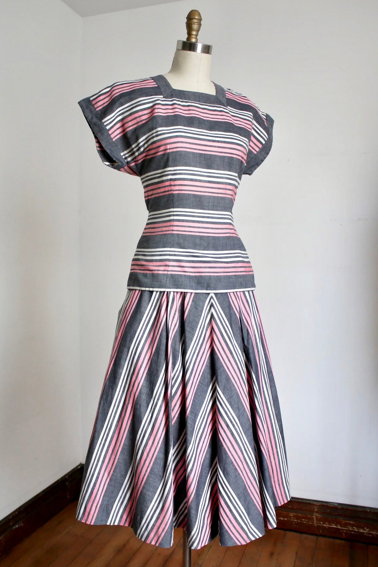 Really great late 1940s pink striped cotton dress set. 1948 to be exact! This set features a fitted top that goes over the hips a bit with side buttons, a matching a-line skirt. Metal zipper in the skirt. There are slight shoulder pads in the top.