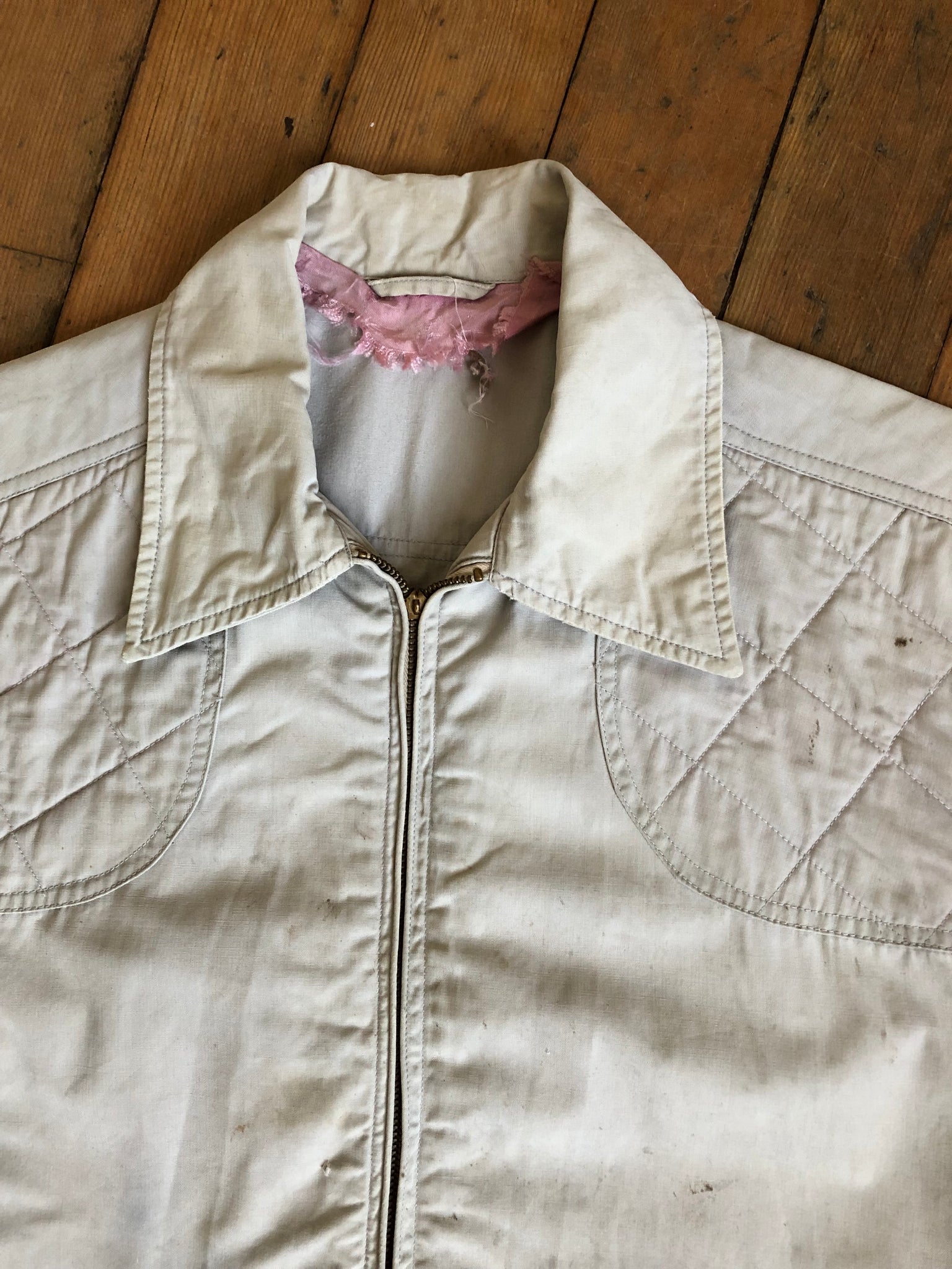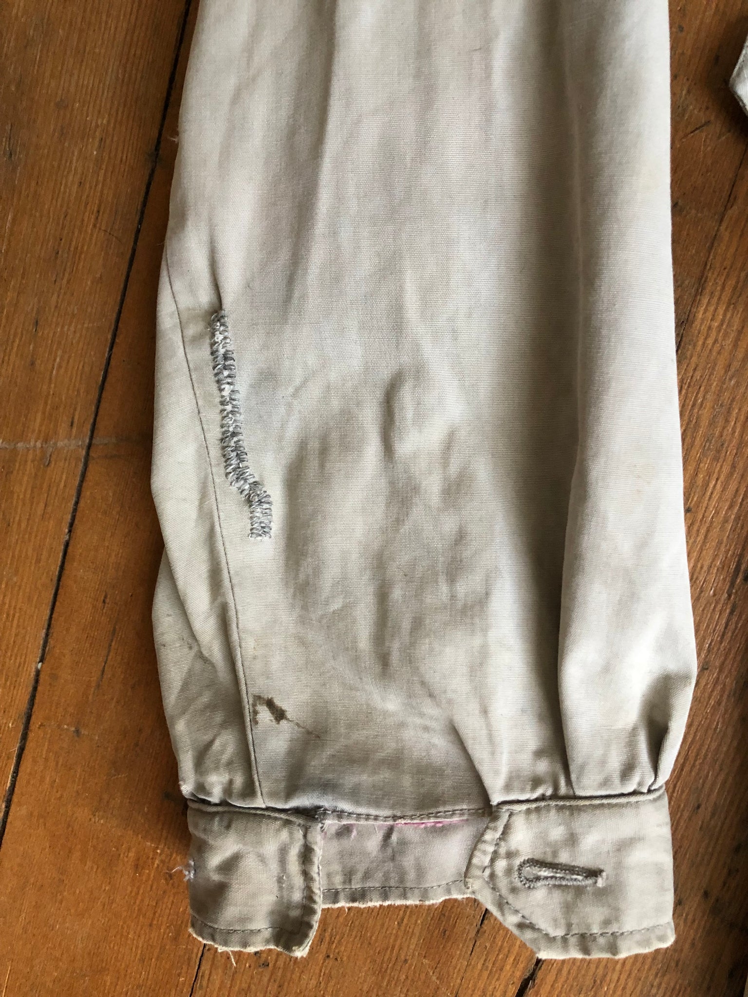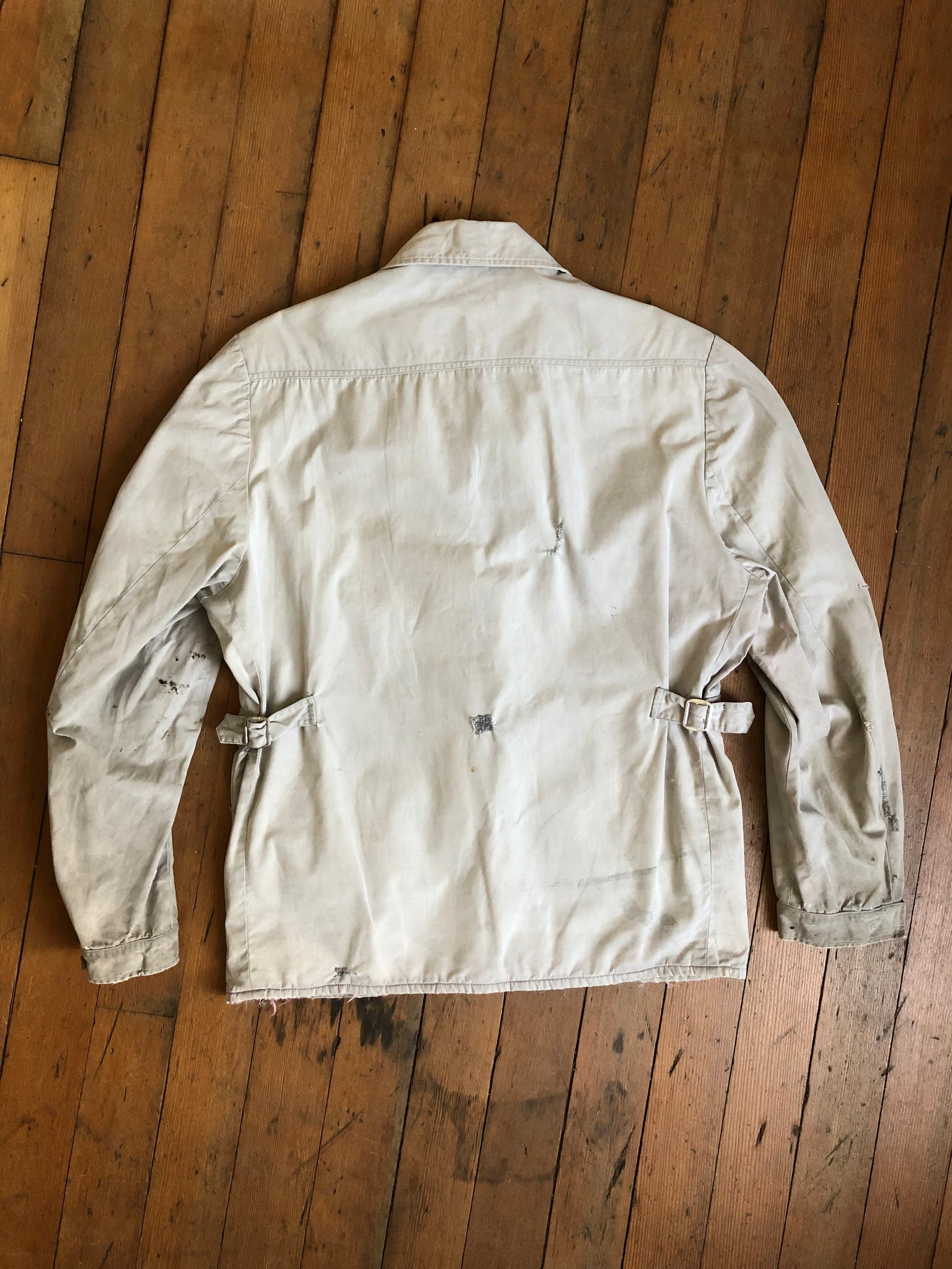 Really unusual hunting / shooting jacket from the 1940s. Most of them have game pockets in the back as well as buttons up the front but this one has a zipper and no game pocket. It has side cinches as well. It's just a really cool well worn piece.