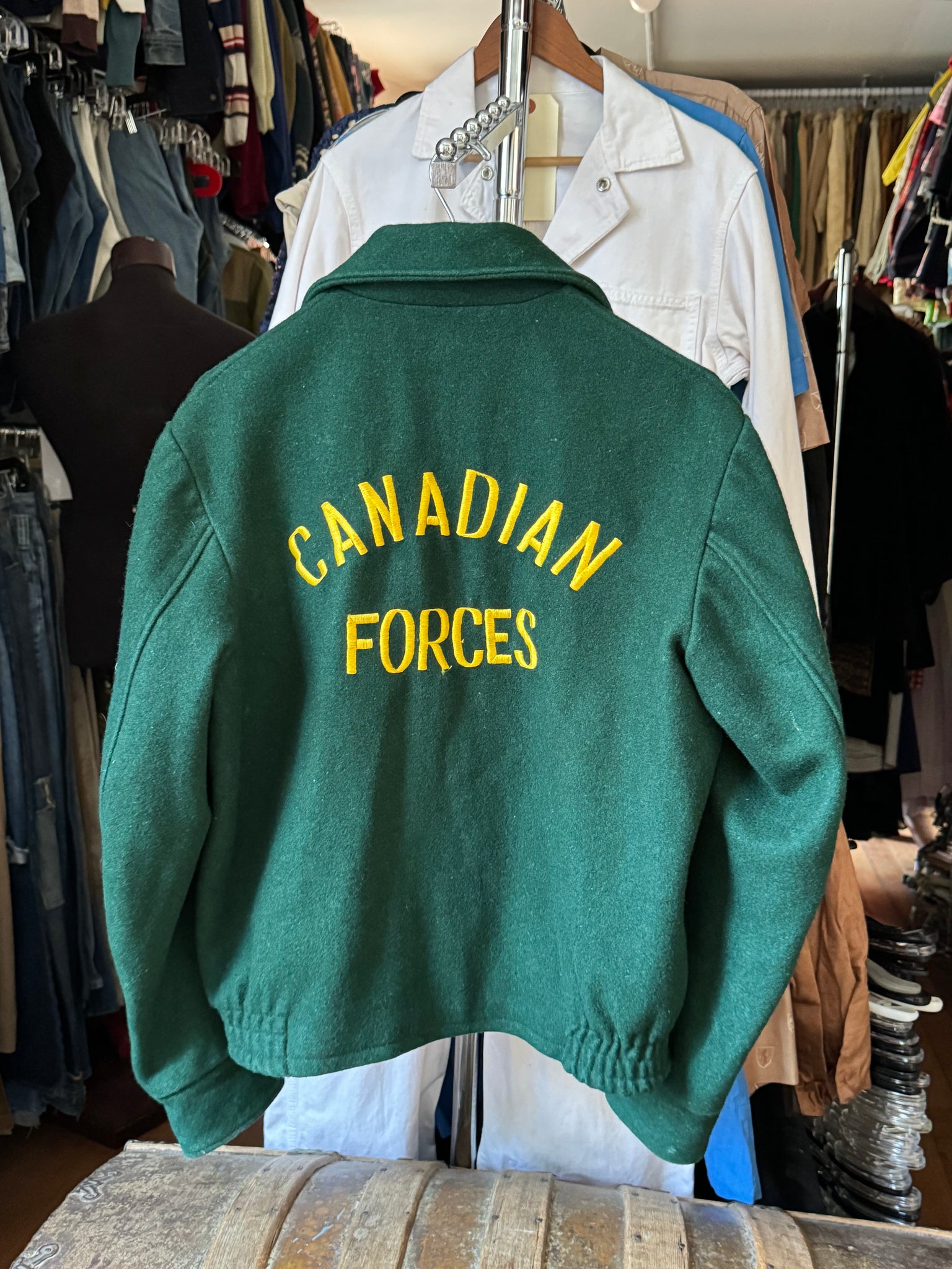 unusual Varsity letterman style cropped wool jacket for Canadian Forces from the 1950s. it has a great silhouette with a double Canadian flag patch on one arm and has "Canadian Forces" embroidered on the back. it is lined.