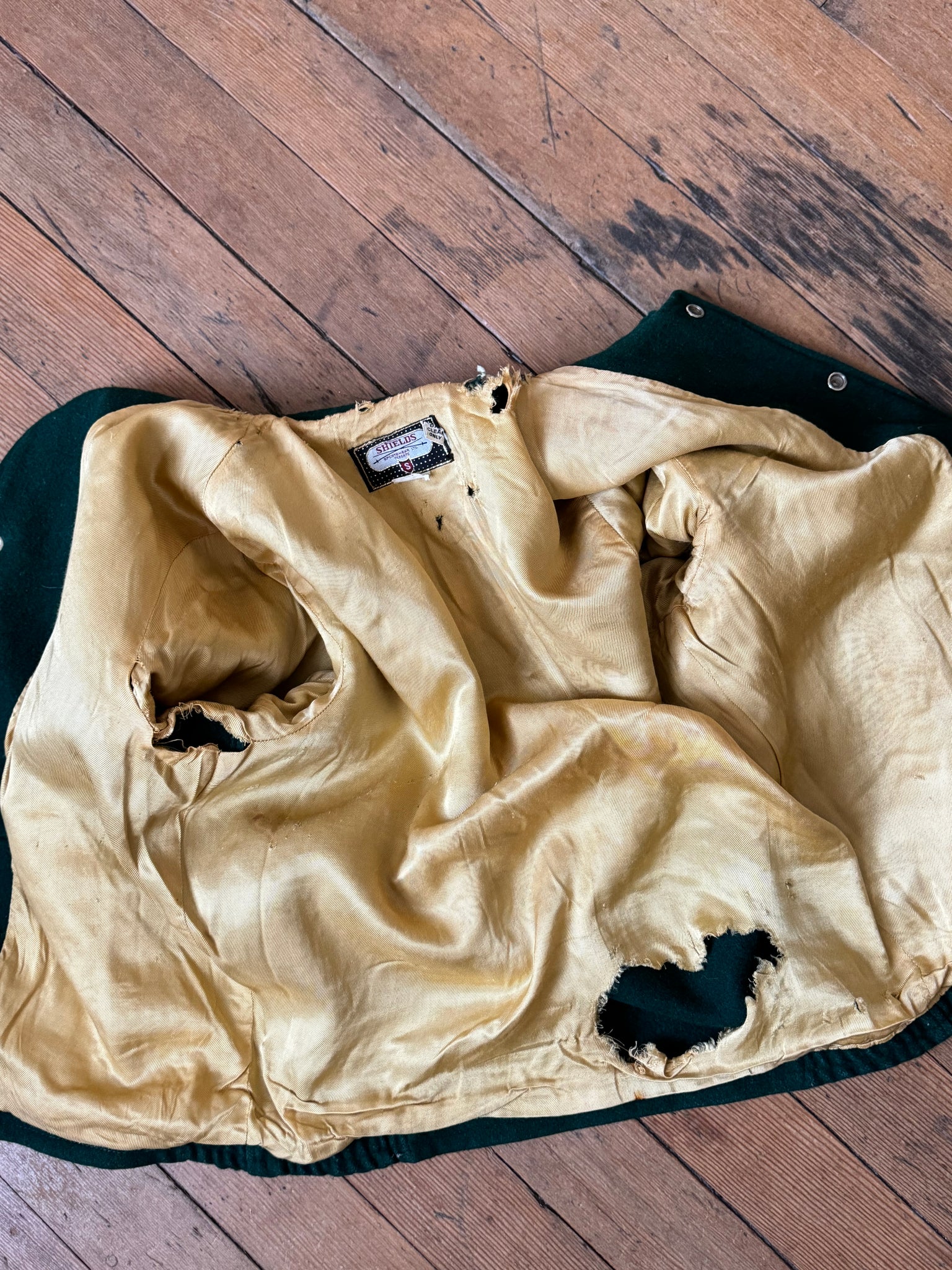 overall great condition with a few issues to note: there is some wear to the fabric in some places and one small hole on sleeve as shown. the most worn part is the lining with some rips and such. sold AS FOUND